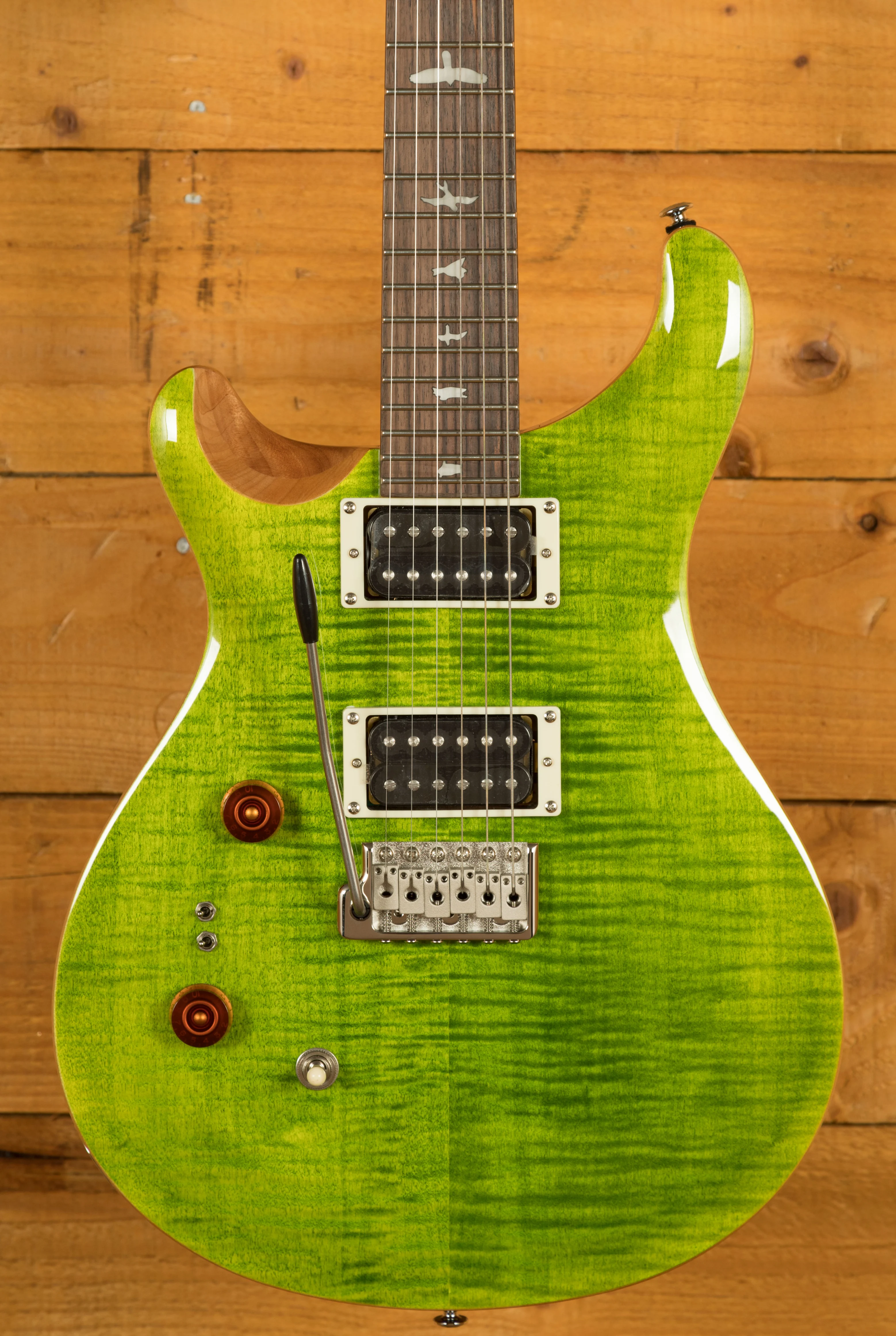 The SE Custom 24-08 retains classic design elements, including a maple top, mahogany back, rosewood fretboard, 24 frets, 25" scale length, bird inlays, signature headstock logo, and PRS patented moulded tremolo. The patented design of the tremolo system provides tonal fidelity, player comfort, and tuning stability that is second to none. You can play with confidence knowing that your tuning will remain stable no matter how much you use the tremolo arm.