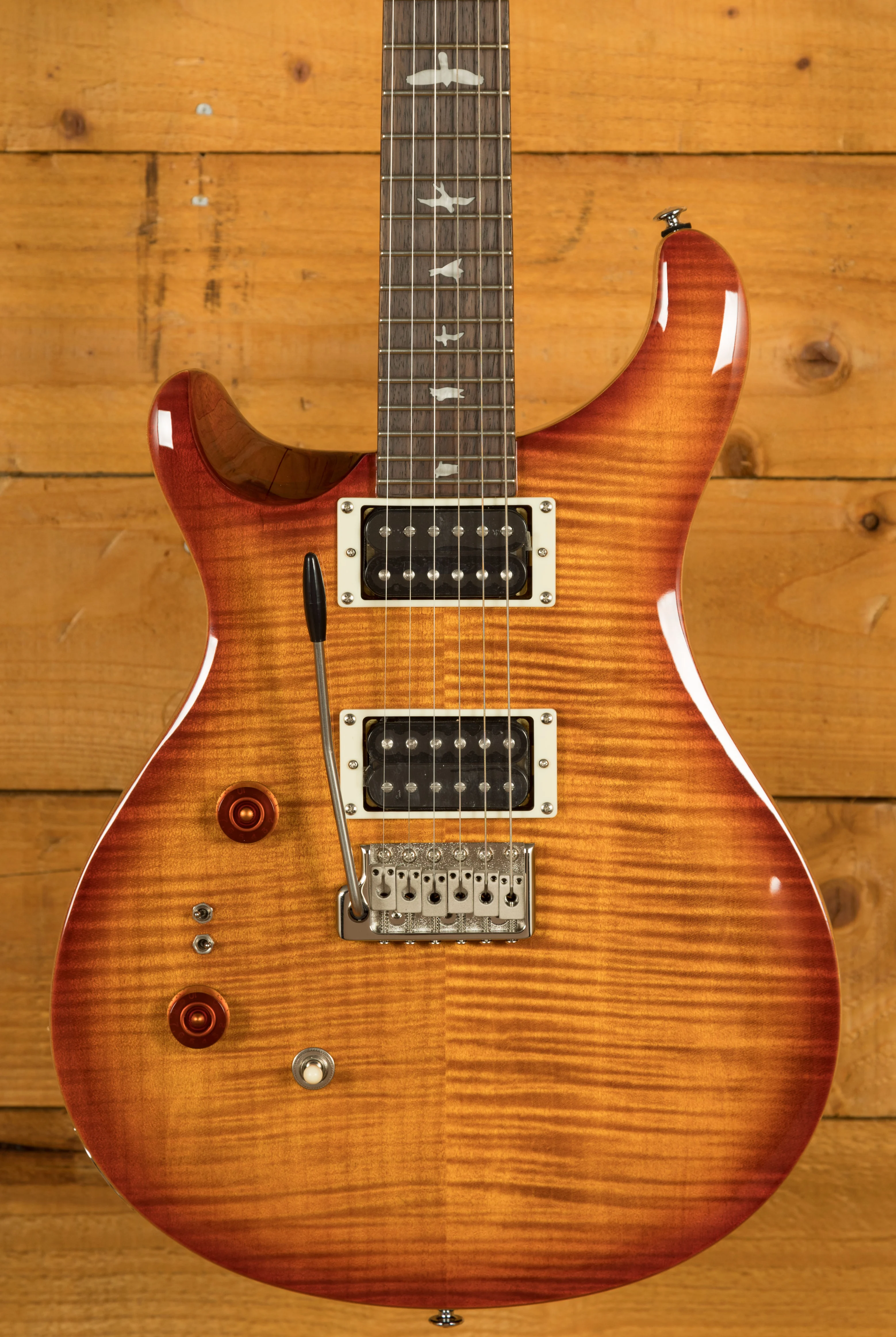 The SE Custom 24-08 retains classic design elements, including a maple top, mahogany back, rosewood fretboard, 24 frets, 25" scale length, bird inlays, signature headstock logo, and PRS patented moulded tremolo. The patented design of the tremolo system provides tonal fidelity, player comfort, and tuning stability that is second to none. You can play with confidence knowing that your tuning will remain stable no matter how much you use the tremolo arm.