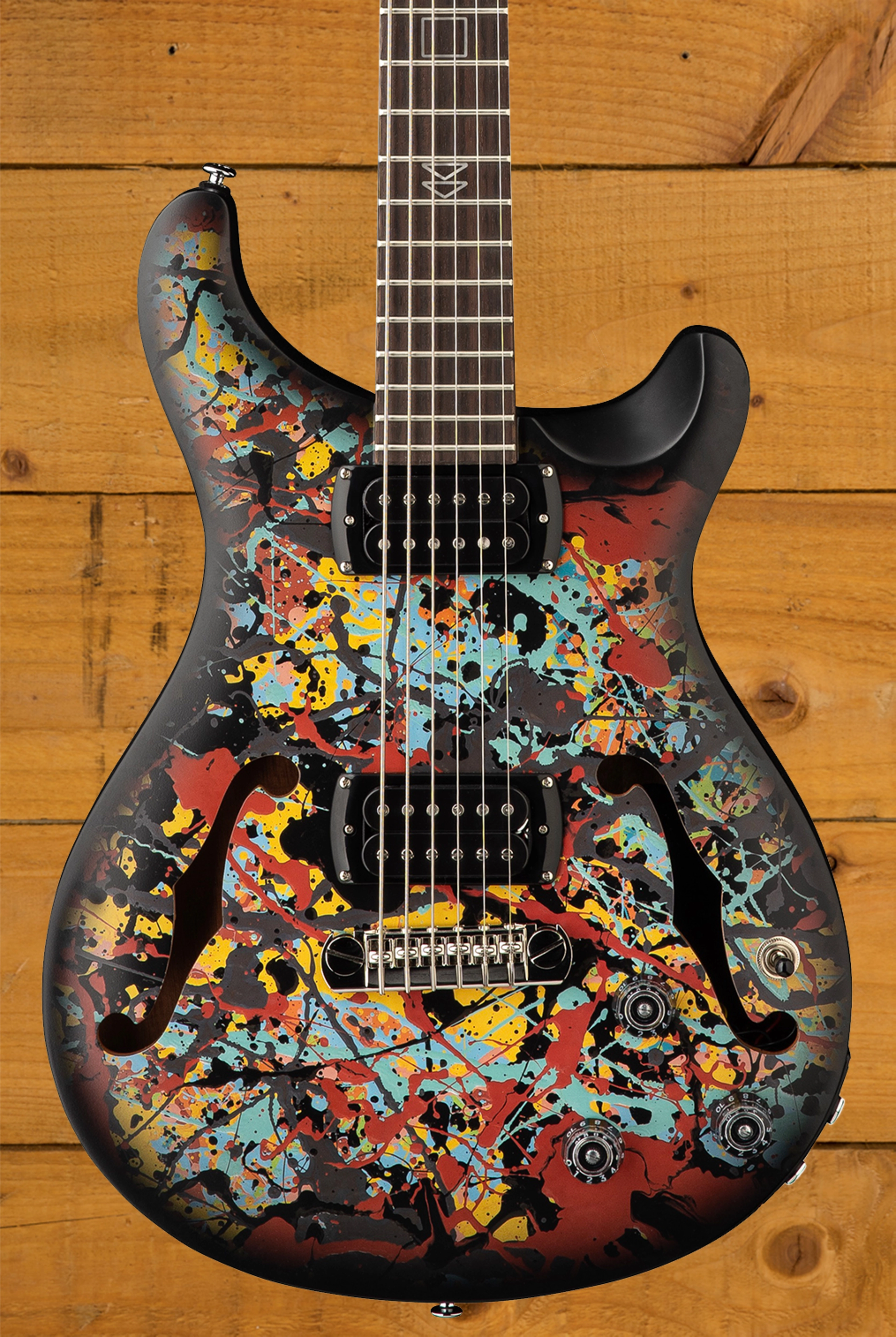 This guitar begins with a PRS Hollowbody design crafted from Mahogany back & sides with a Maple top. It features a Shallow Violin top carve, which gives the body a real premium look. The standout feature of this guitar is the inclusion of the Cosmic Splash wrap, which is an exact replica of one of Eds 2025 Cosmic Carpark paintings. The design is super unique and extremely eye-catching. Ed is one of the most creative artists out there, its awesome to see two of his biggest passions come together.