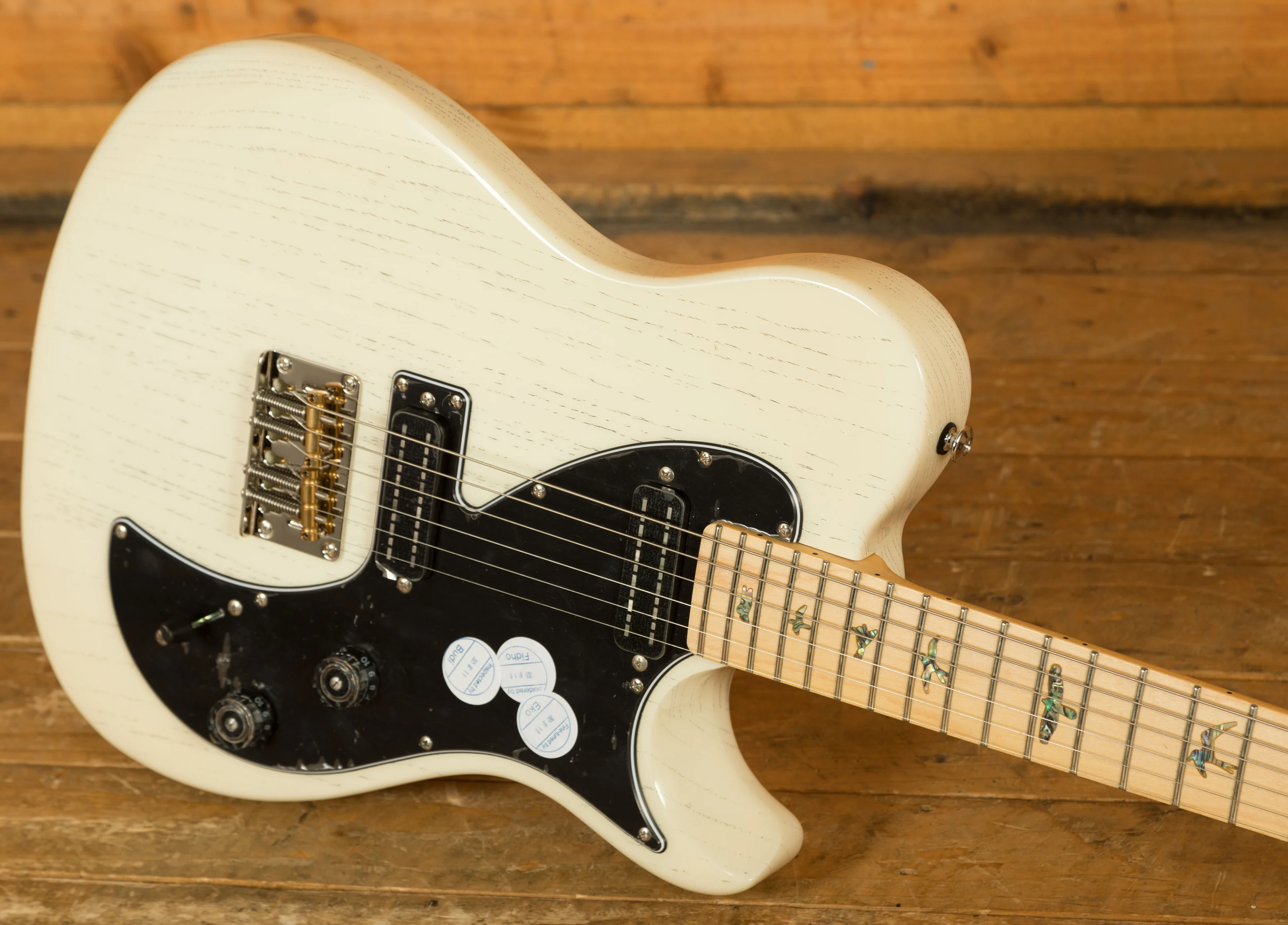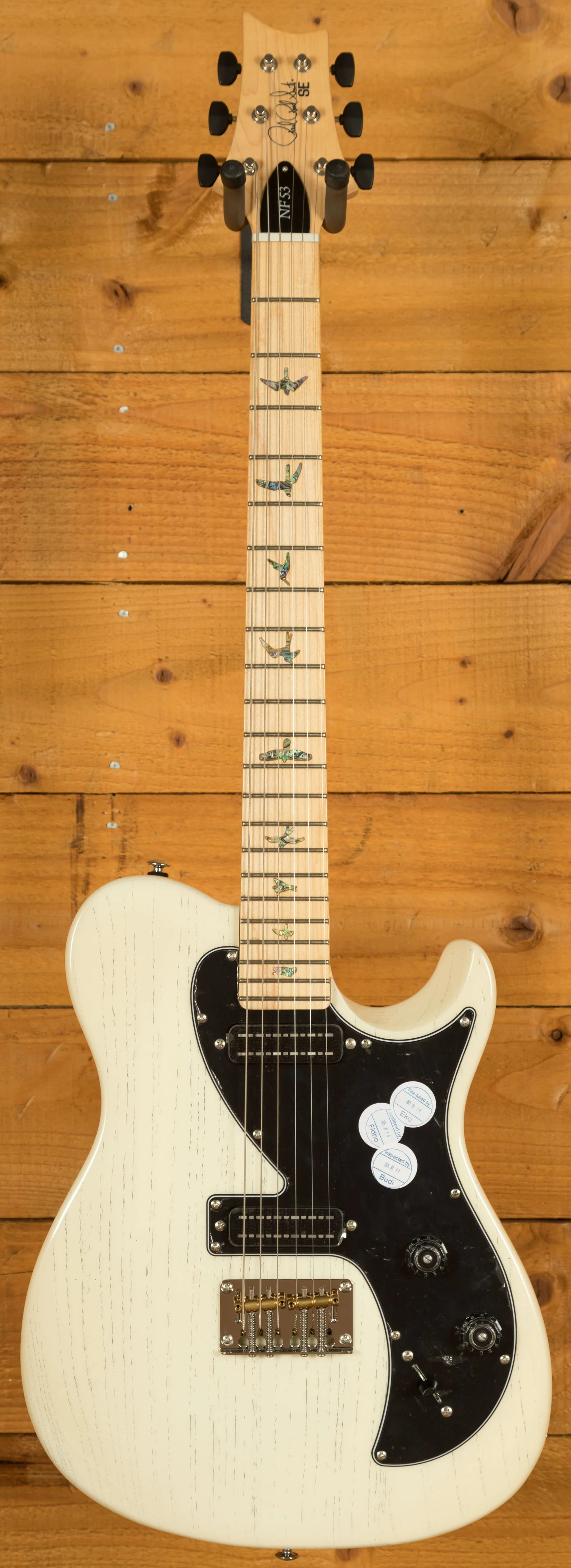 The PRS SE NF53 is a versatile electric guitar designed to deliver classic tones with modern performance. Built with a swamp ash body and a 25.5" scale length bolt-on maple neck and fretboard, it offers a balanced feel and bright, resonant sound. The 22-fret neck with a 10" radius provides smooth playability across the fingerboard, while the abalone bird inlays add a signature PRS aesthetic. The nut width of 1 41/64" ensures comfortable string spacing, making it suitable for a wide range of playing styles.