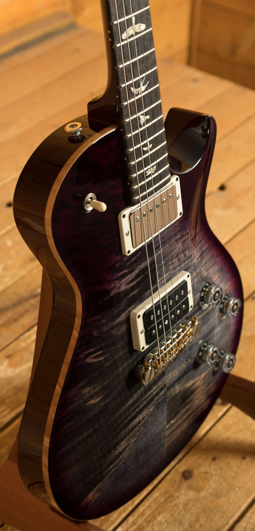 The PRS Tremonti Stoptail in Charcoal Purple Burst is a guitar that doesn't just sound incredible - it looks like it was carved from thunder and lit by lightning. The deeply figured carved maple top is absolutely jaw-dropping, with a Charcoal Purple Burst finish that shifts and dances under the light. It's the kind of top that makes you stop scrolling, lean in, and say: "I need to play that."