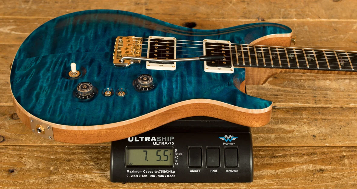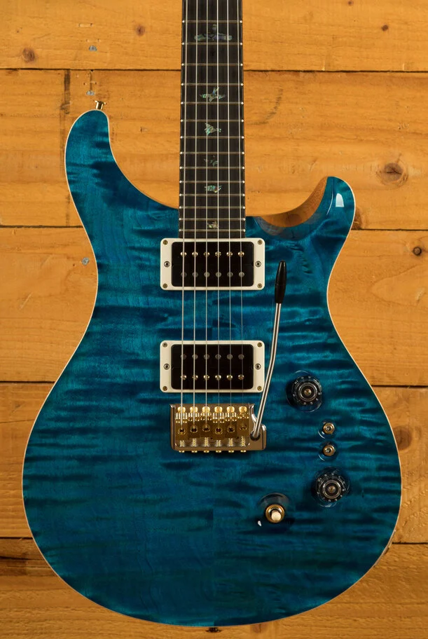 With a stunning carved Wood Library Quilt Maple 10-Top and a One-Piece Mahogany back, finished in Aquamarine the Custom 24-08 looks every bit as good as it sounds.