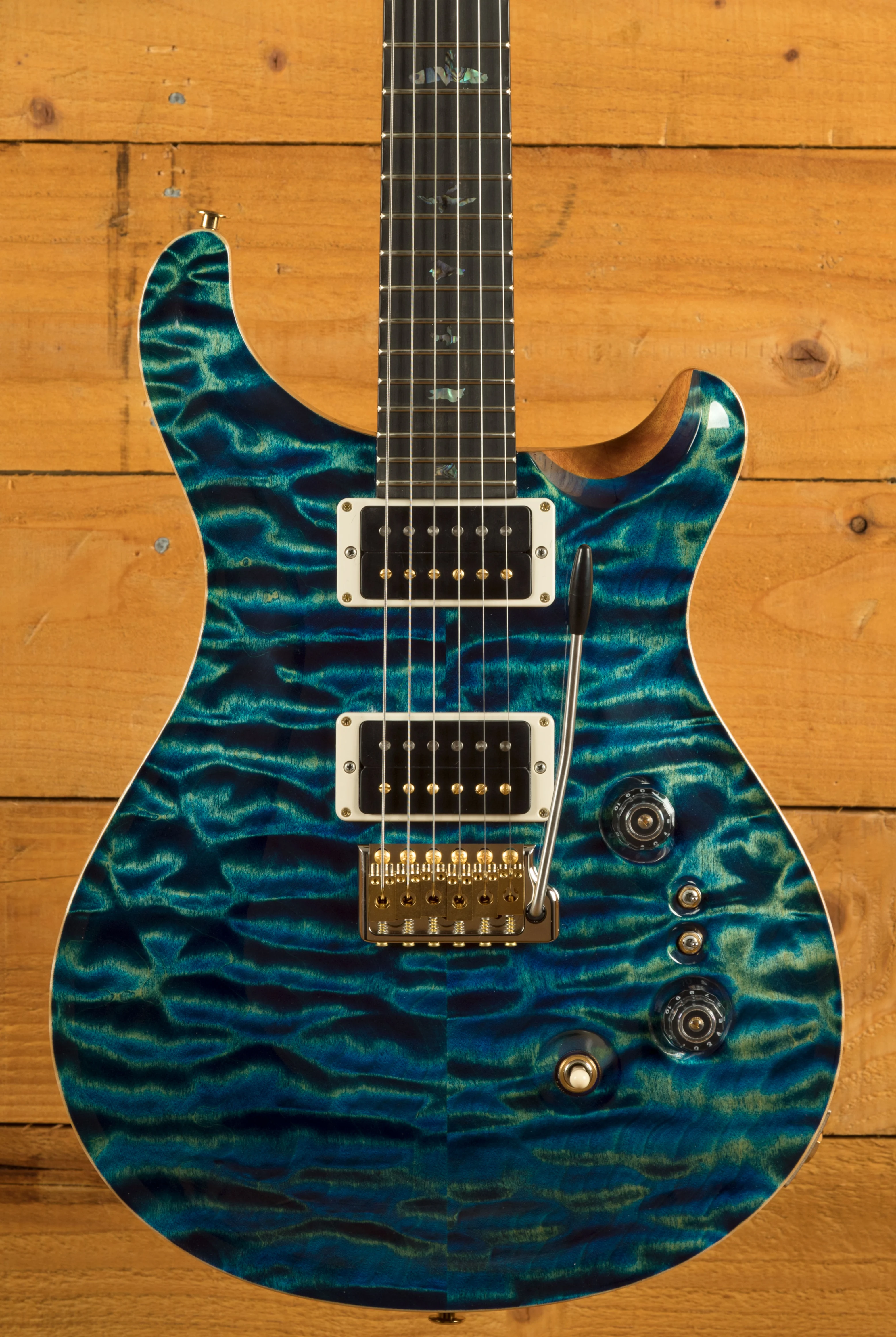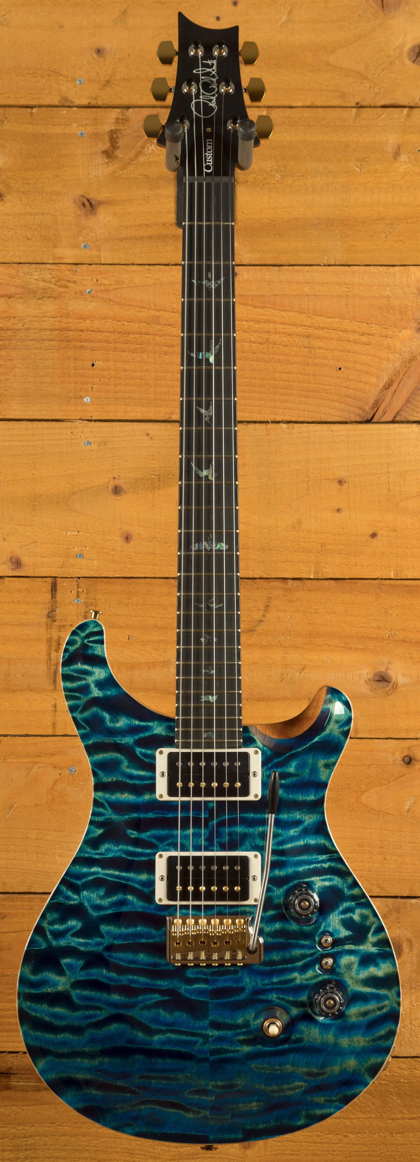 With a stunning carved Wood Library Quilt Maple 10-Top - and a natural One-Piece Mahogany back - finished in River Blue, the Custom 24-08 looks every bit as good as it sounds.