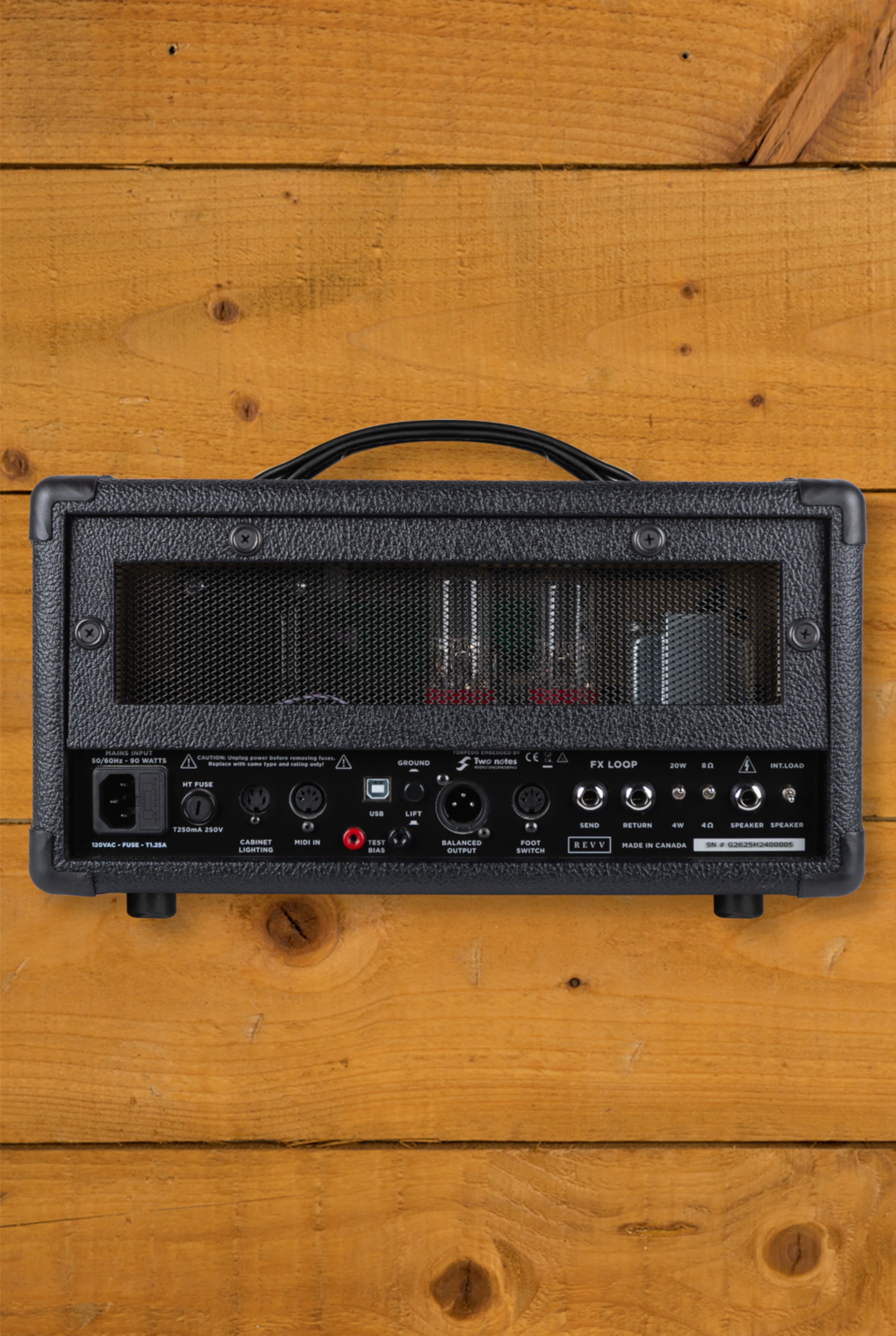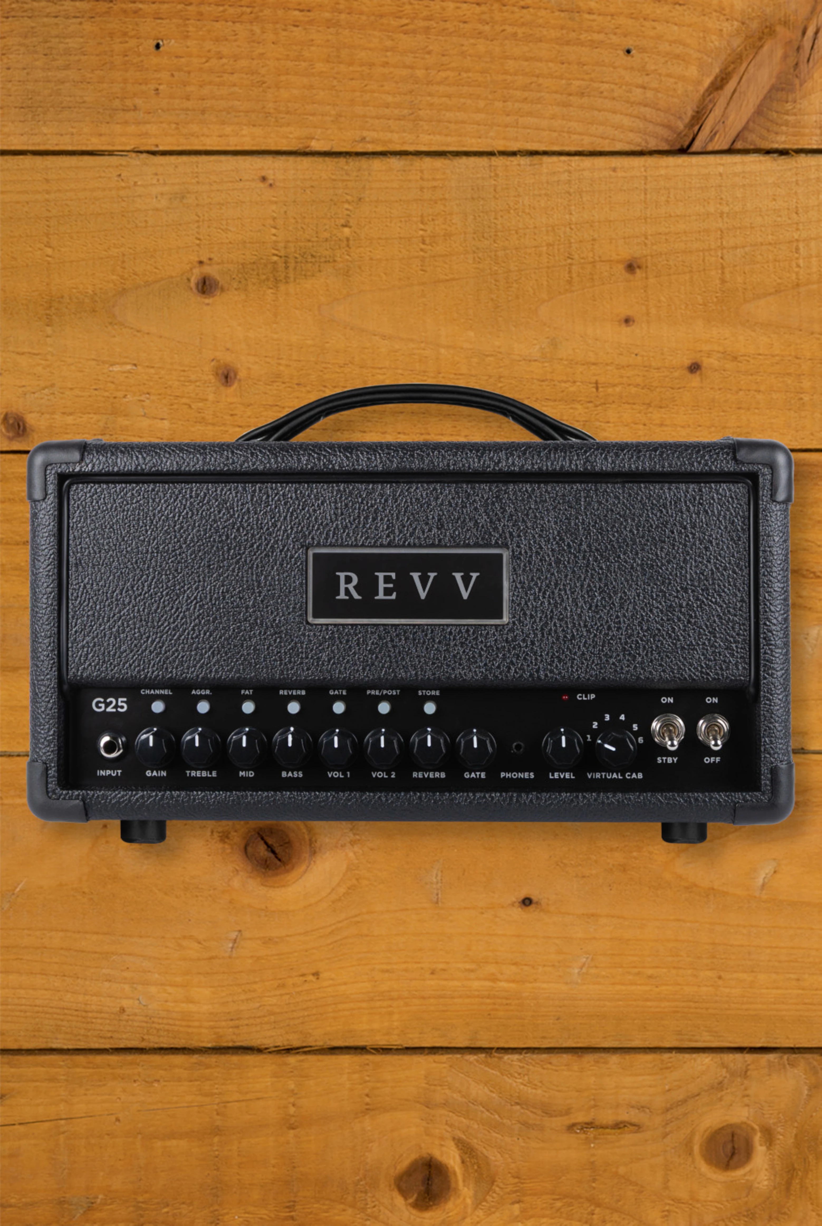 The Revv G25 is a compact, portable medium-wattage valve amplifier designed to deliver high-gain performance alongside modern functionality. It builds on the platform of the G20 with updated voicing and an expanded feature set, all housed in a durable, compact headshell. The amp features two channels with a shared EQ section and independent volume controls, allowing players to precisely balance clean and driven sounds without needing external adjustments. Additional built-in features such as an integrated noise gate, MIDI programmability, included footswitch, switchable low-power mode, and studio-quality digital reverb make the G25 a highly flexible solution for both live and studio use.