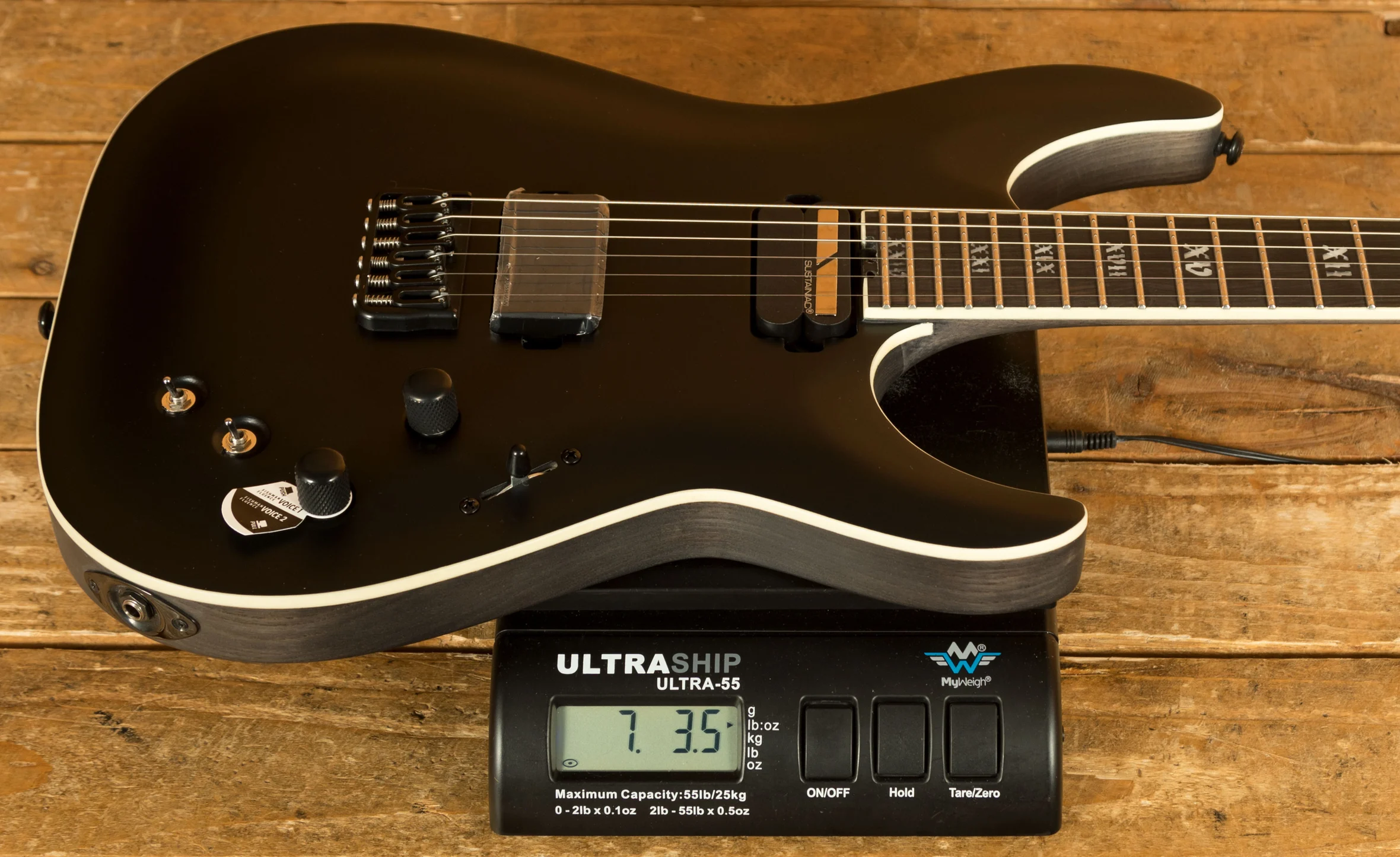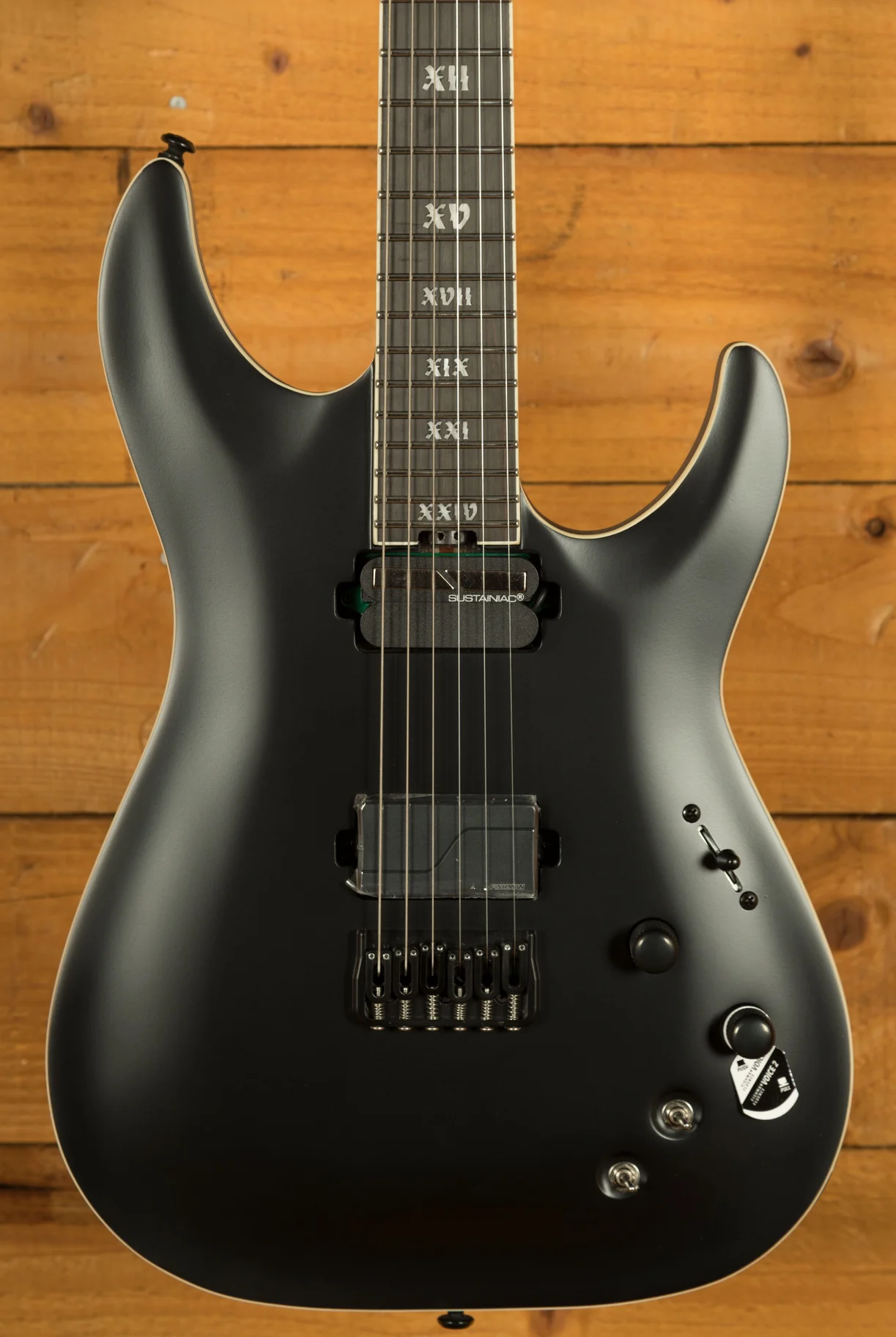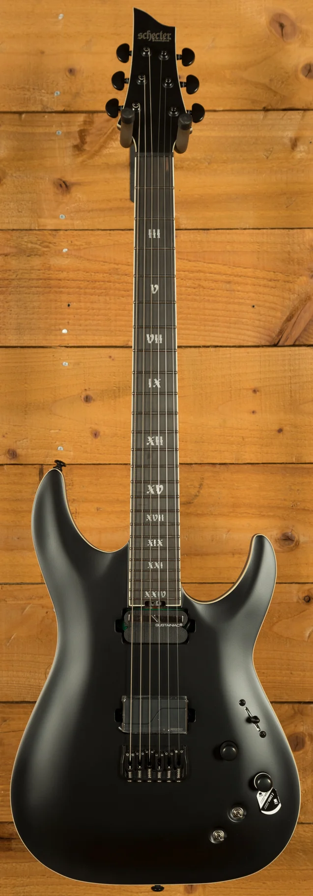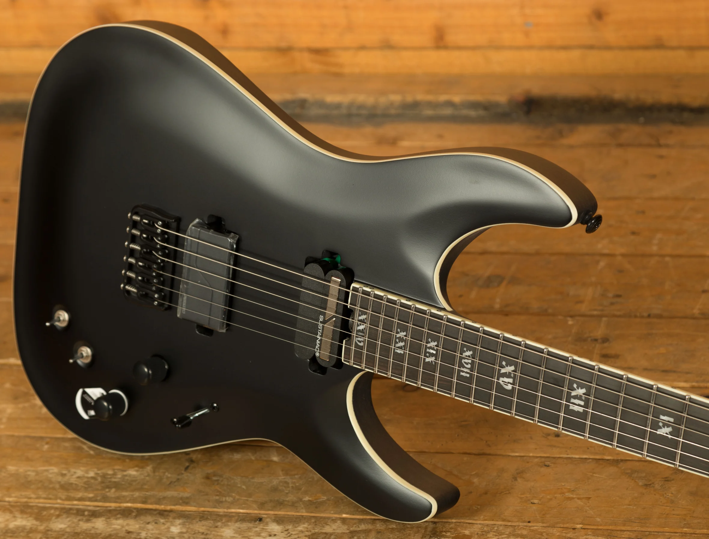 In terms of features there is nothing holding you back. 24 X-Jumbo Stainless Steel frets with excellent access, locking tuners and compensated Ernie Ball nut for accurate pitch stability, carbon fibre in the (ultra-thin "C") neck for stability, glow in the dark side dots for stage navigation, a Hipshot hardtail string-thru body bridge for being able to switch to drop tunings without the other strings going out of tune, a Fishman Fluence Modern pickup with two voicings to be able to nail high-gain tones and present the clarity for modern clean lines... the list goes on. What is especially cool is that this guitar has a Sustainiac neck pickup but without a Floyd Rose. Often with Schecters the two go hand in hand. However, in this instance you can make the guitar sustain as long as you want and howl into harmonic feedback-like screams, all whilst enjoying the comfort and stability of a fixed bridge.