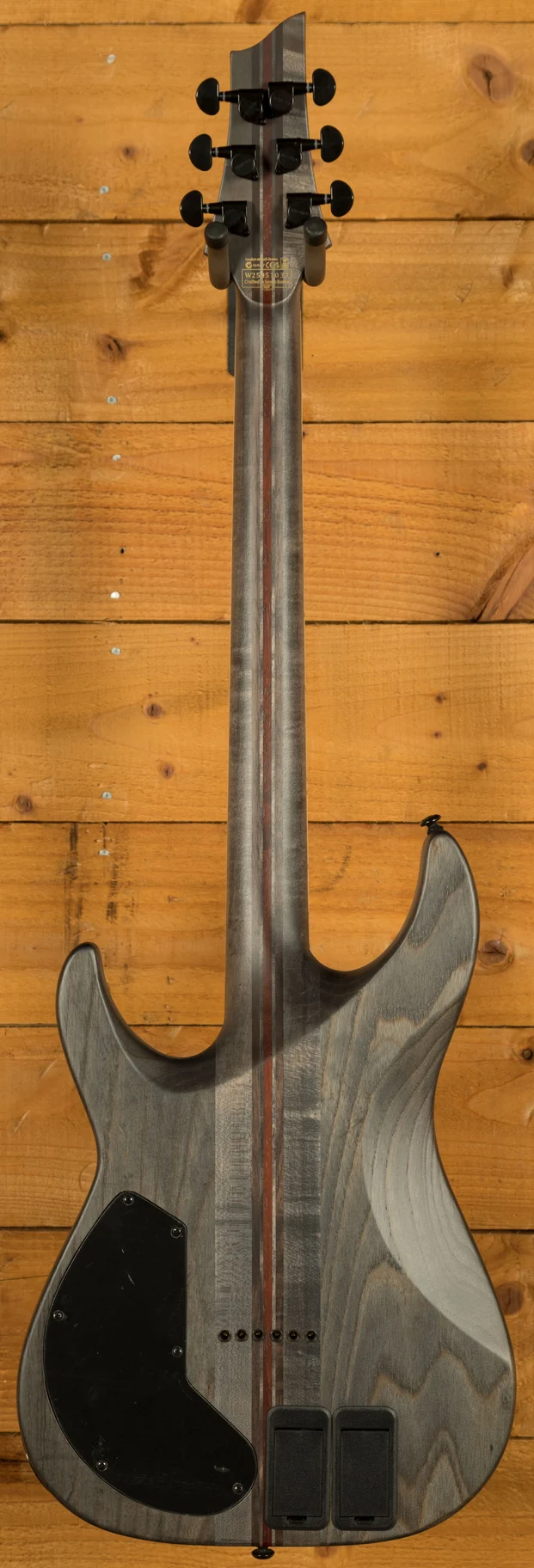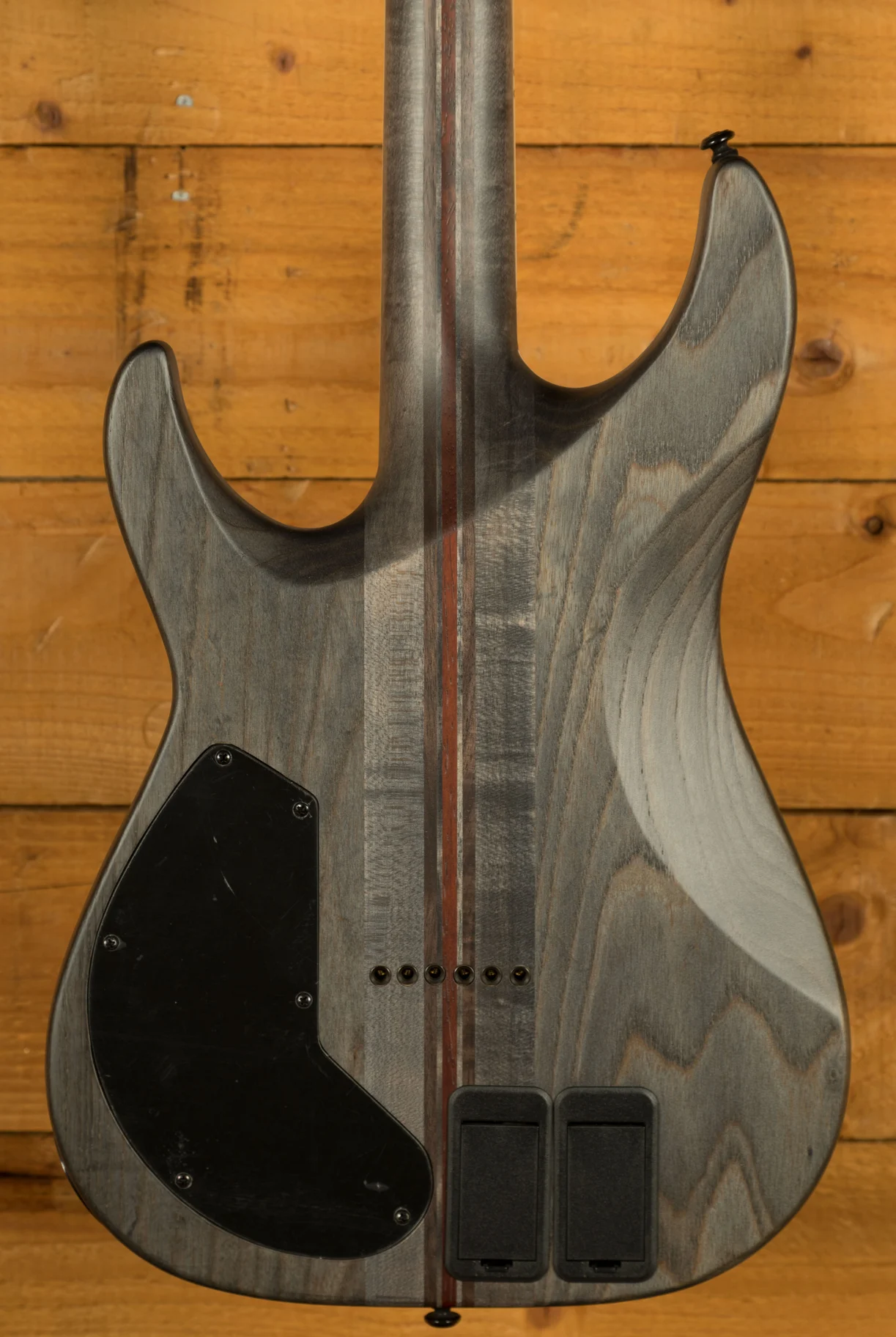 The aesthetic is beautiful - Satin Black with an arched top, a dark Ebony fingerboard but then highlighted with Ivory style binding. The inlays lend a touch of metal influence but without being garish or over-the-top. Flip it around and see a much lighter finish that reveals the Swamp Ash body and Neck-Thru construction. So cool.