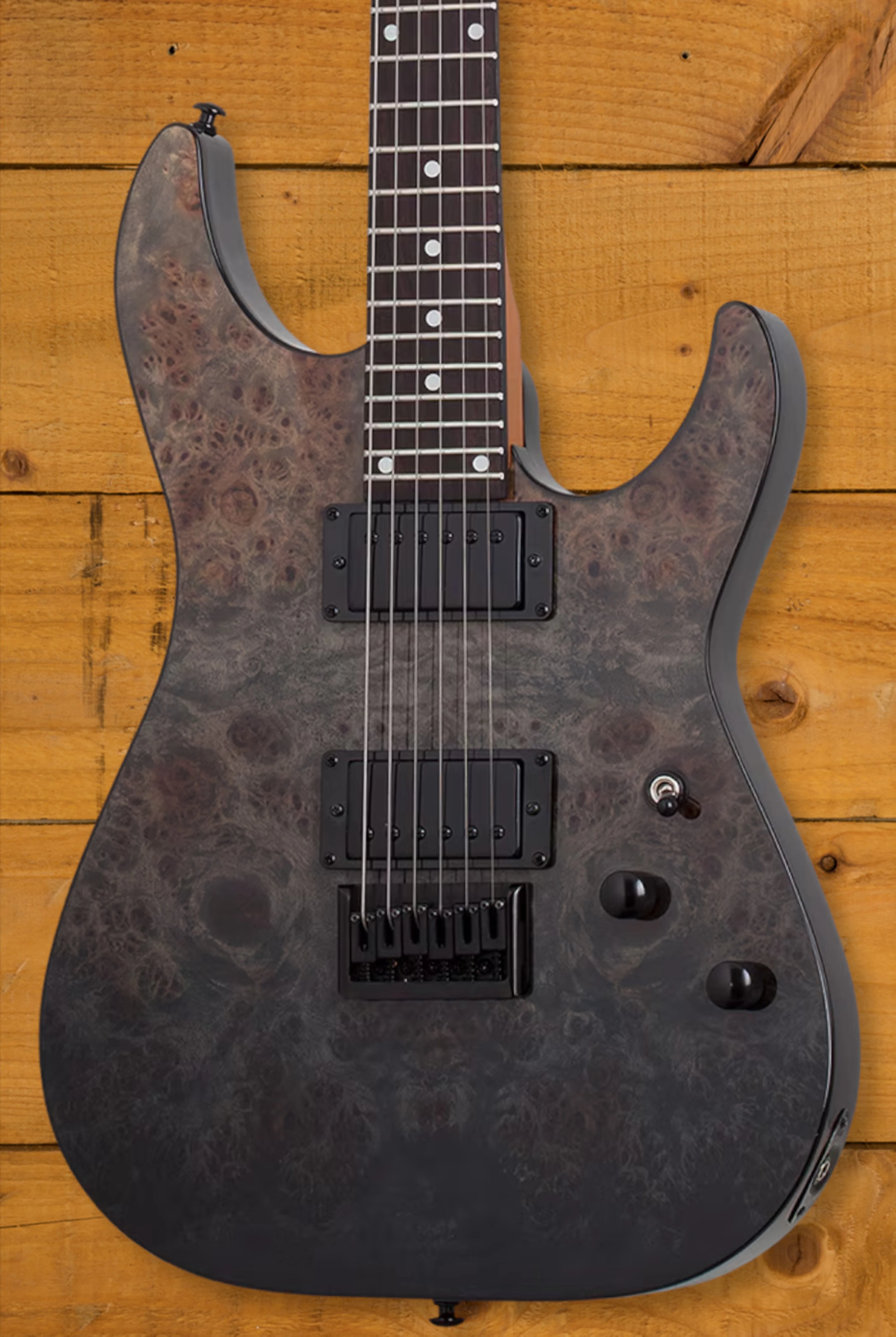The Schecter C-1 Standard in Black Fade Burst Burl is a bold, modern take on the classic double-cutaway design. With a mahogany body and a figured burl top, it delivers a rich, resonant tone with plenty of sustain and visual flair. The black binding on the body and neck adds a touch of elegance to its aggressive styling.