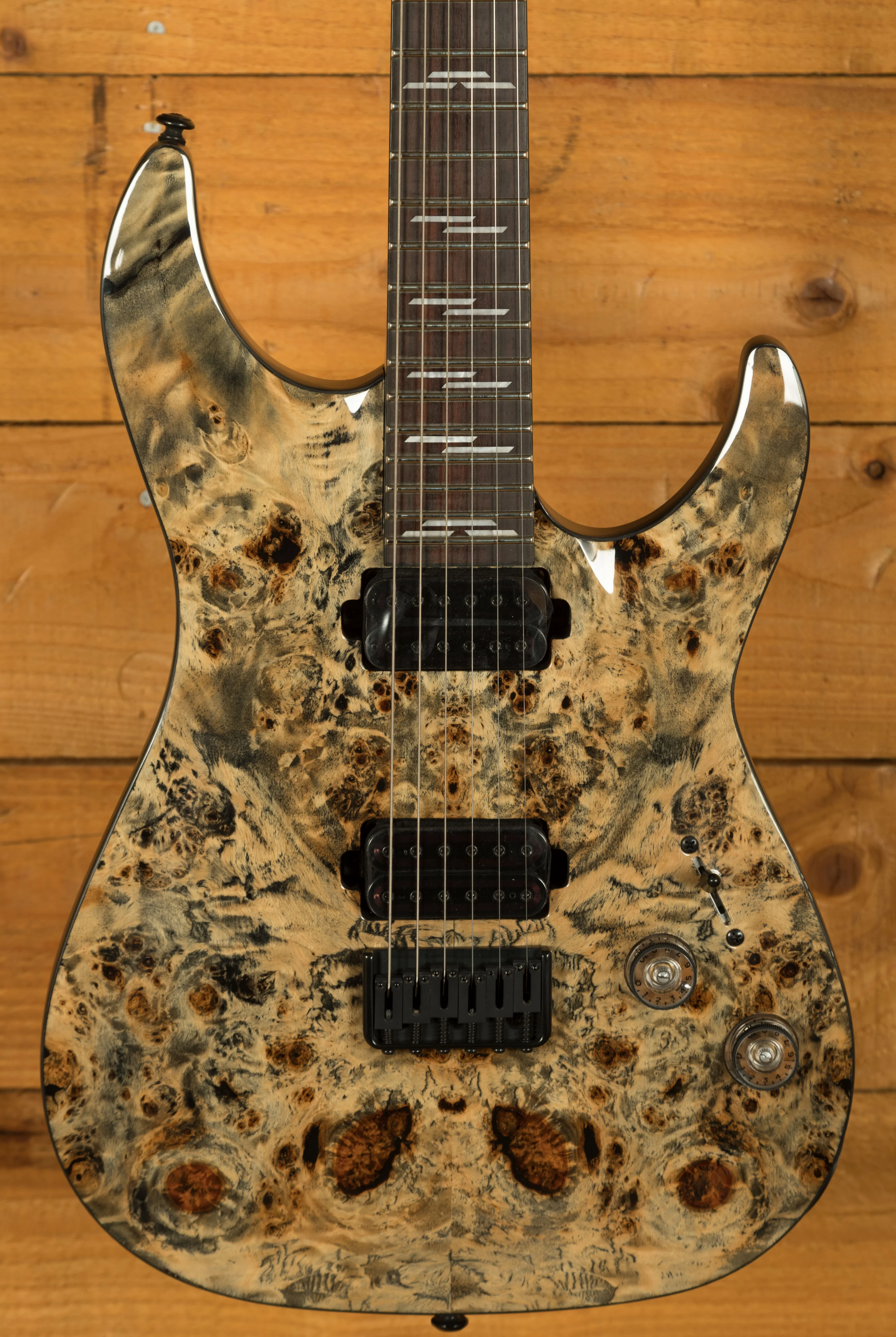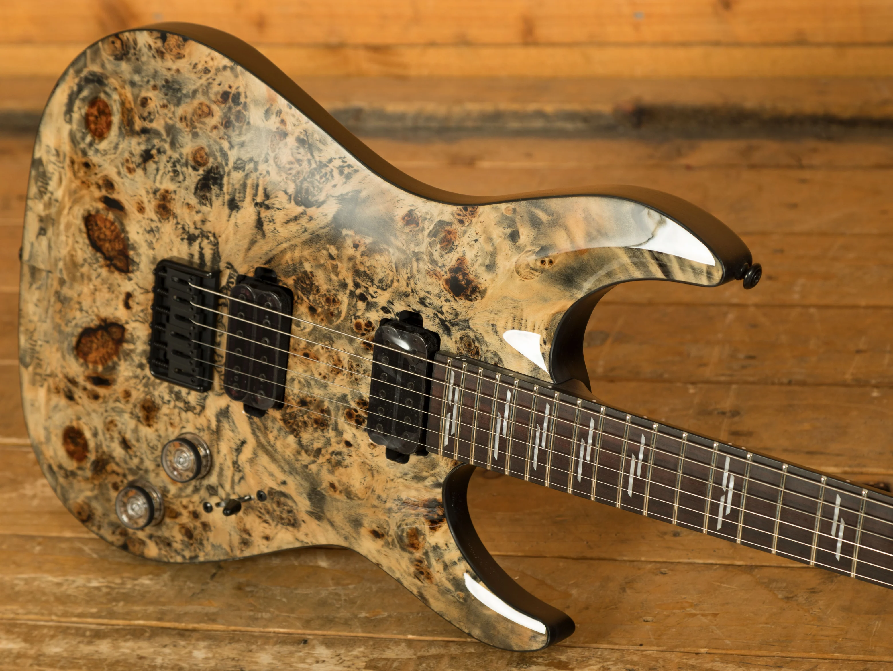 The Maple neck is super snappy, providing great articulation. The Rosewood fingerboard boasts Pearloid Line inlays and a Thin C profile, 24 X-Jumbo frets and a 14" radius, it's fast and comfortable.