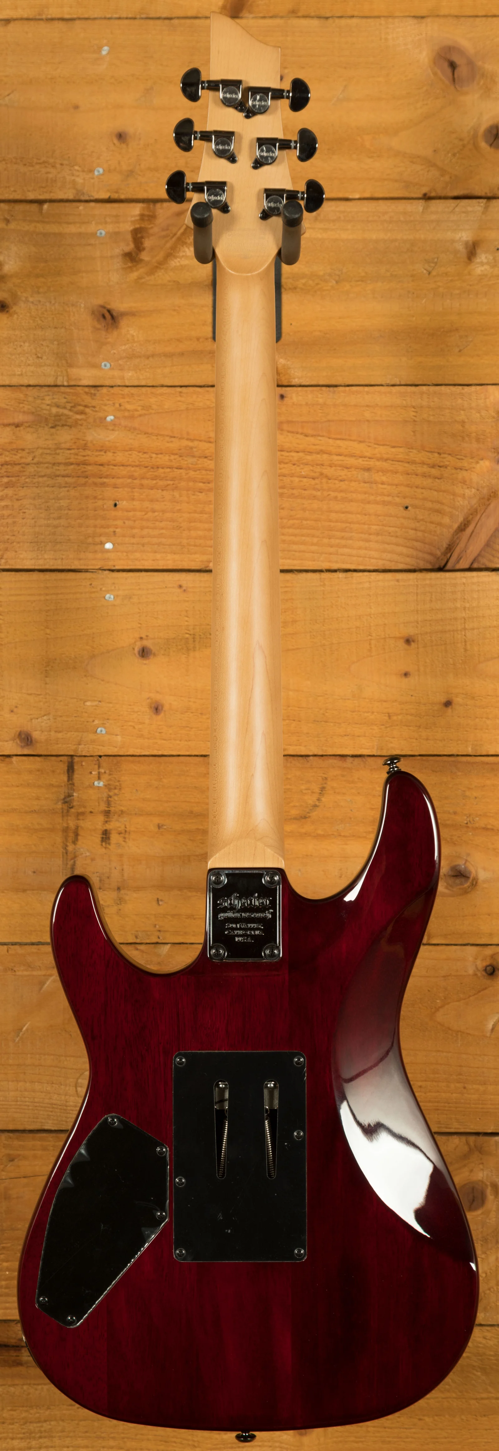With a Mahogany body with a sweet quilted Maple top, this modern shape guitar has a lush natural tone. Finished in Black Cherry, it looks a million dollars. The Thin "C" Maple neck features a crisp Rosewood fingerboard with unique Pearloid and Abalone inlays, and with its 25.5" scale length, 14" fingerboard radius, and 24 X Jumbo frets, it plays as great as it looks!