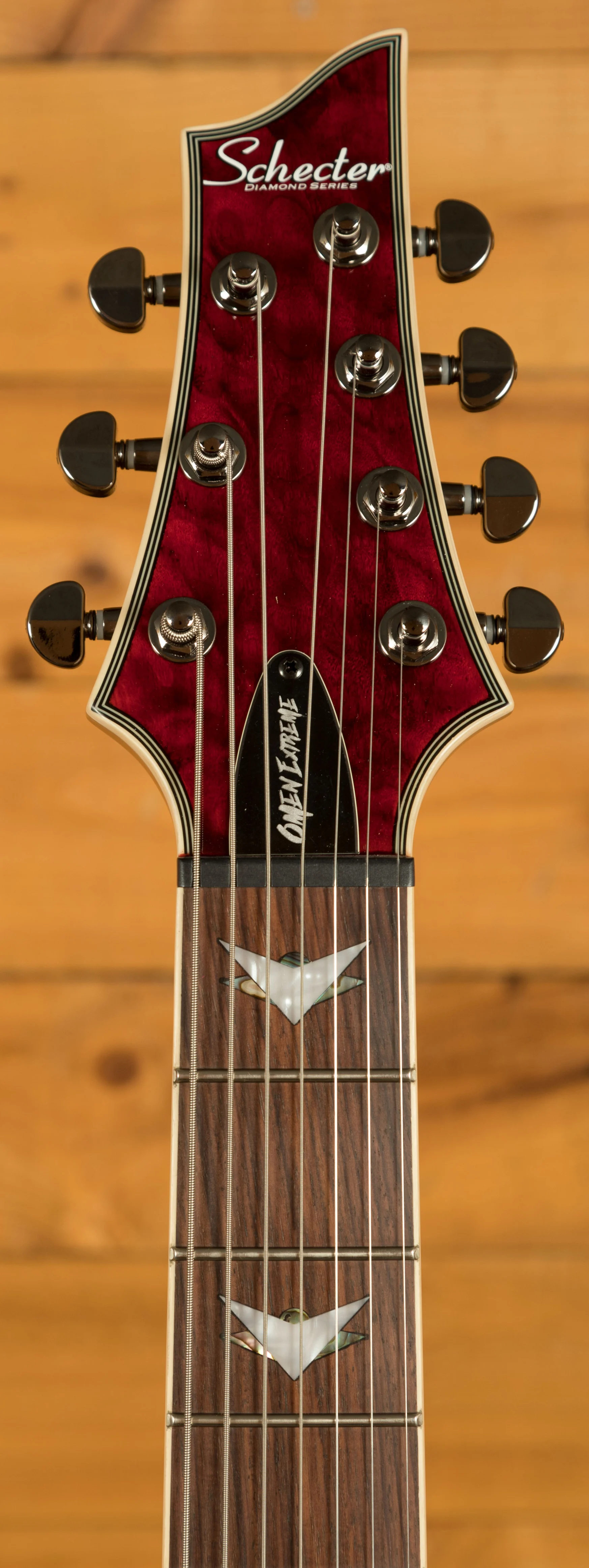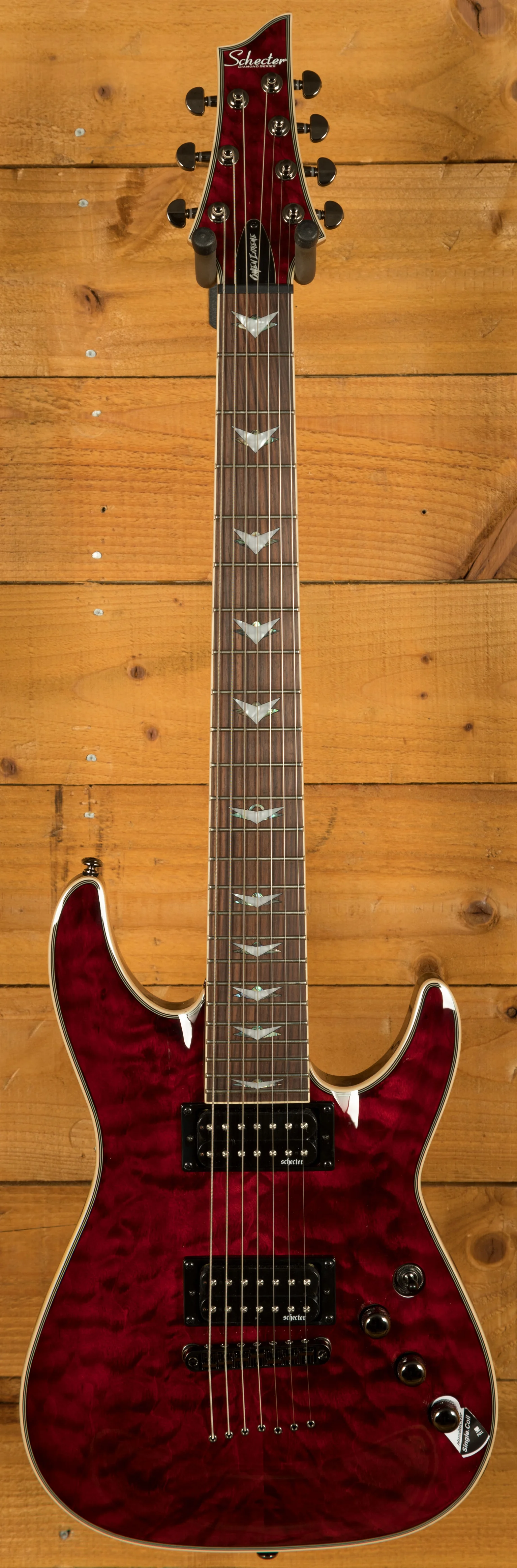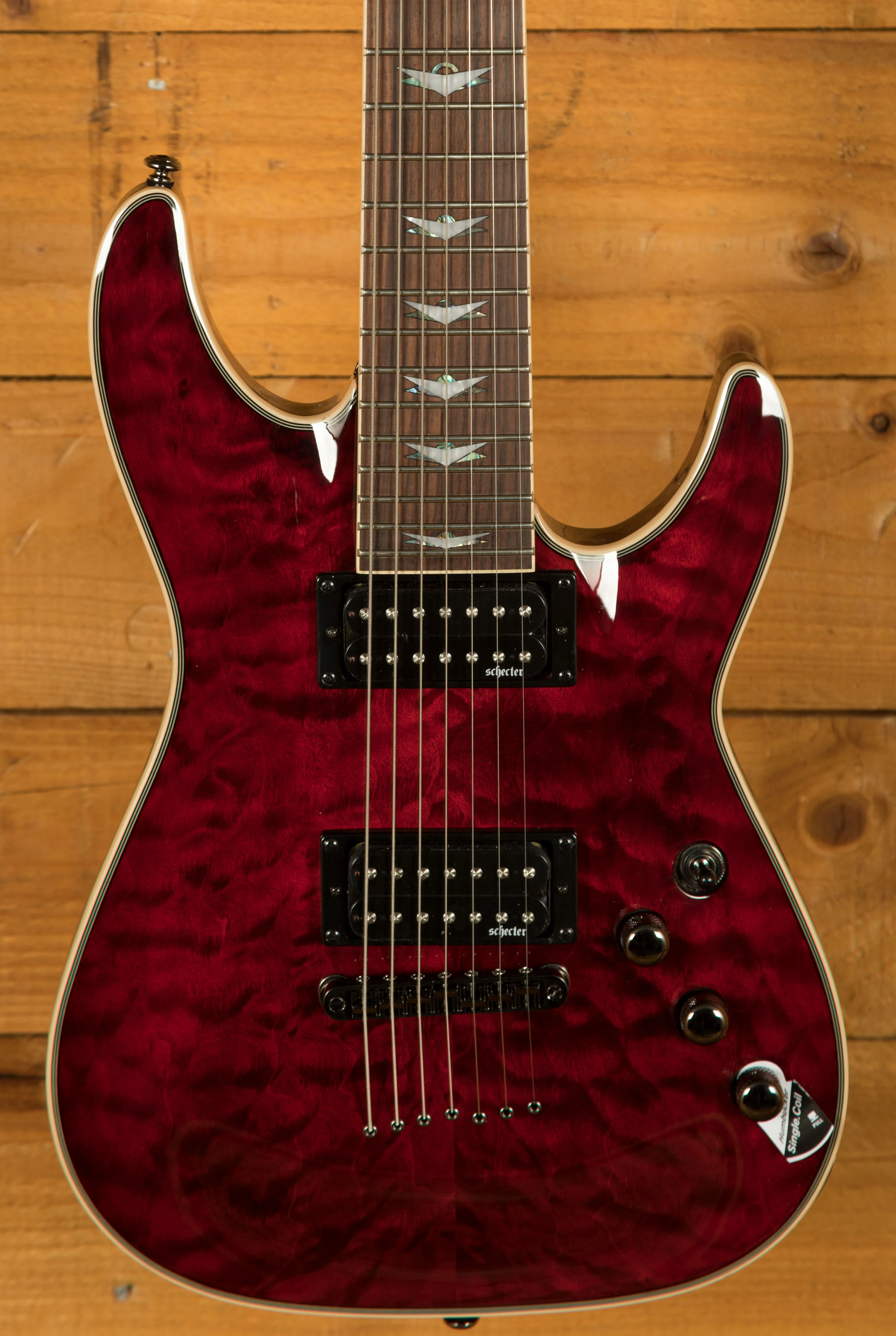 The Schecter Omen Extreme-7 in Black Cherry is a bold, high-performance 7-string built for players who want extended range without sacrificing comfort or style. With its quilted maple top over a mahogany body, this guitar looks as aggressive as it sounds, and the multi-ply crème binding adds a touch of class to its dark, modern aesthetic.
