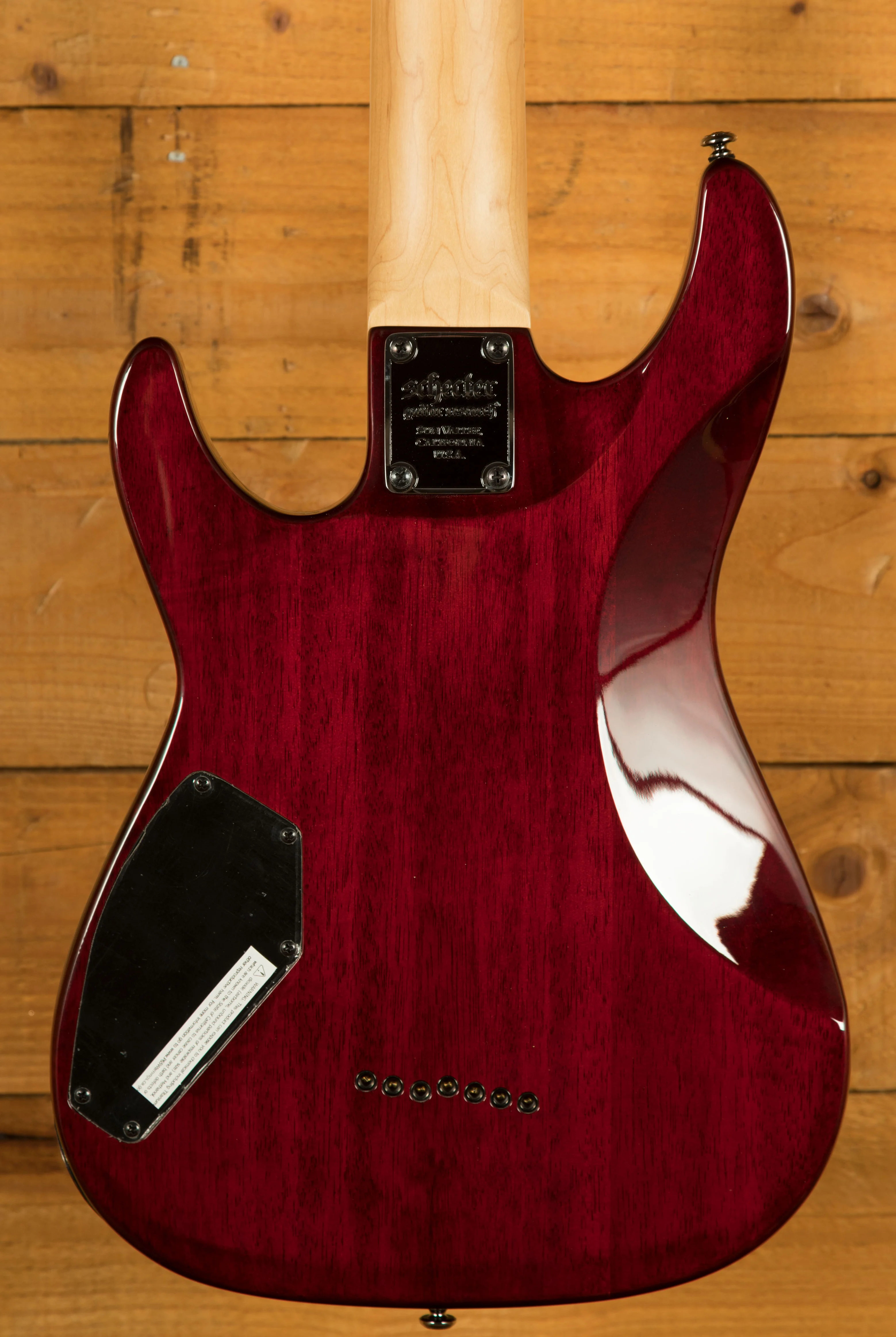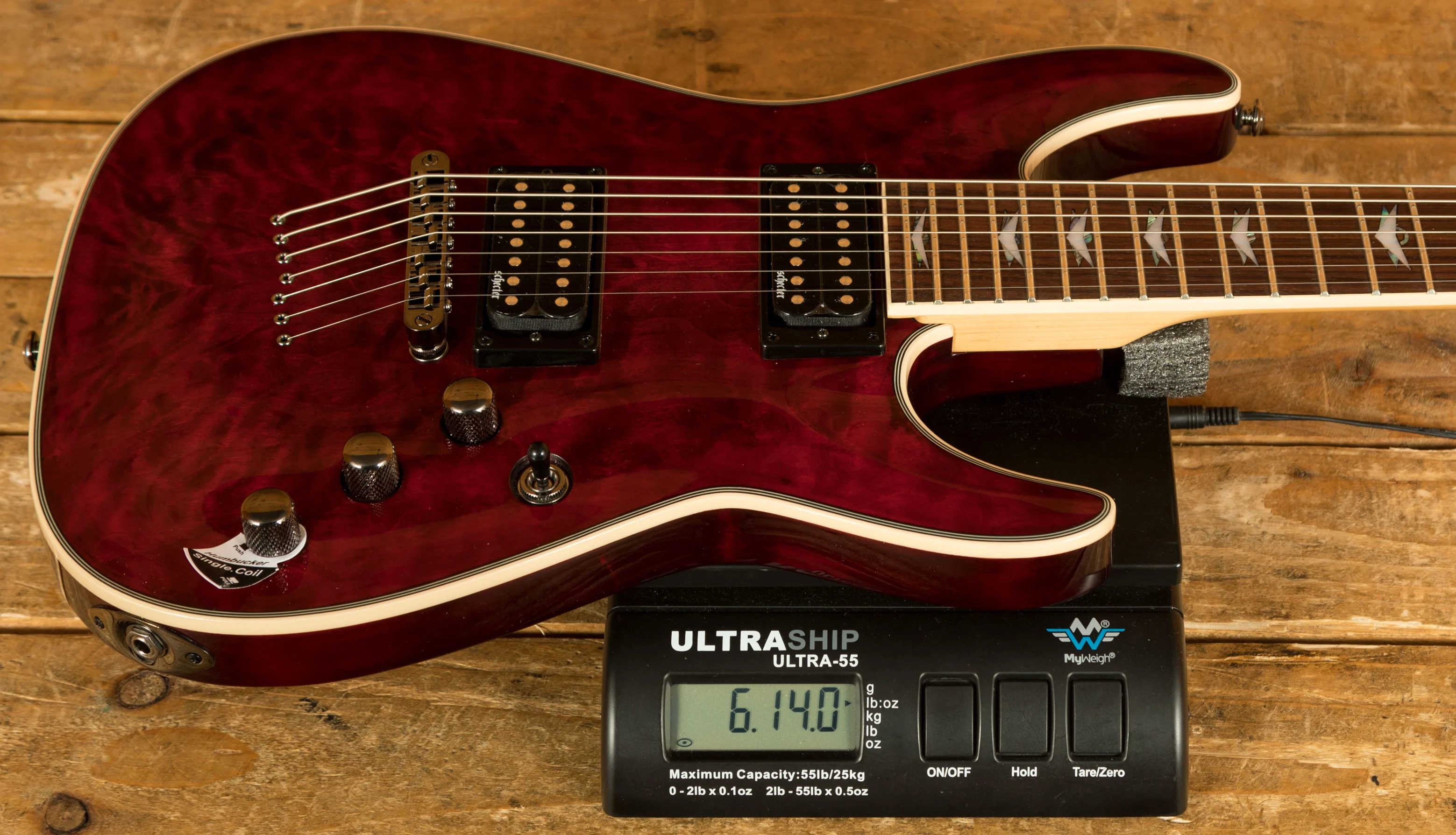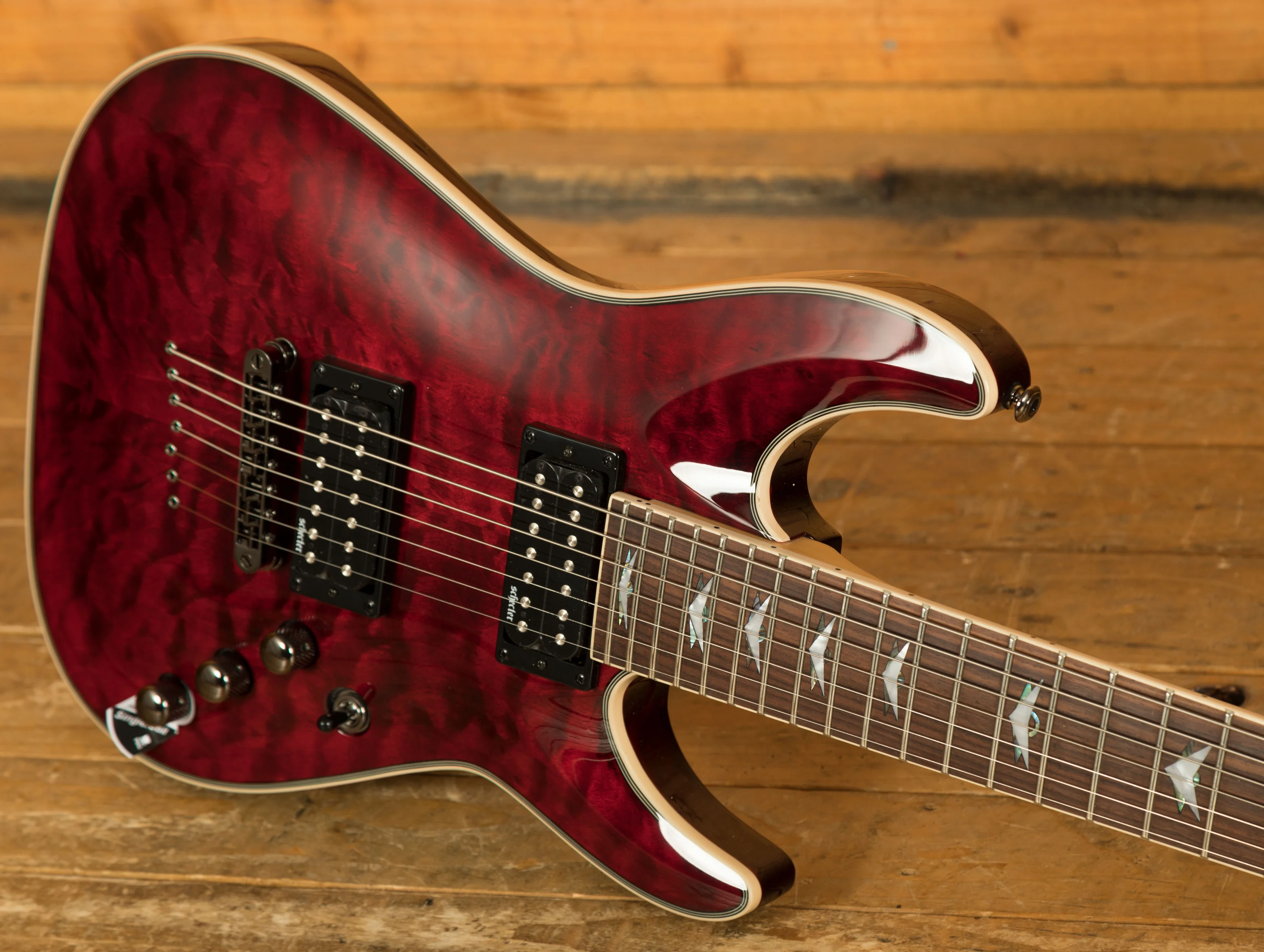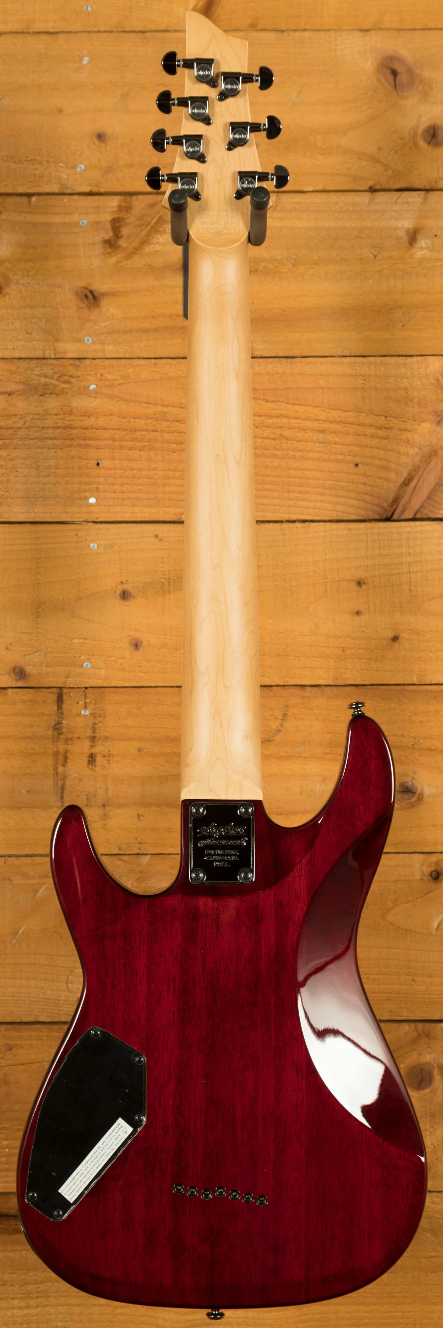 The Schecter Omen Extreme-7 in Black Cherry is a bold, high-performance 7-string built for players who want extended range without sacrificing comfort or style. With its quilted maple top over a mahogany body, this guitar looks as aggressive as it sounds, and the multi-ply crème binding adds a touch of class to its dark, modern aesthetic.