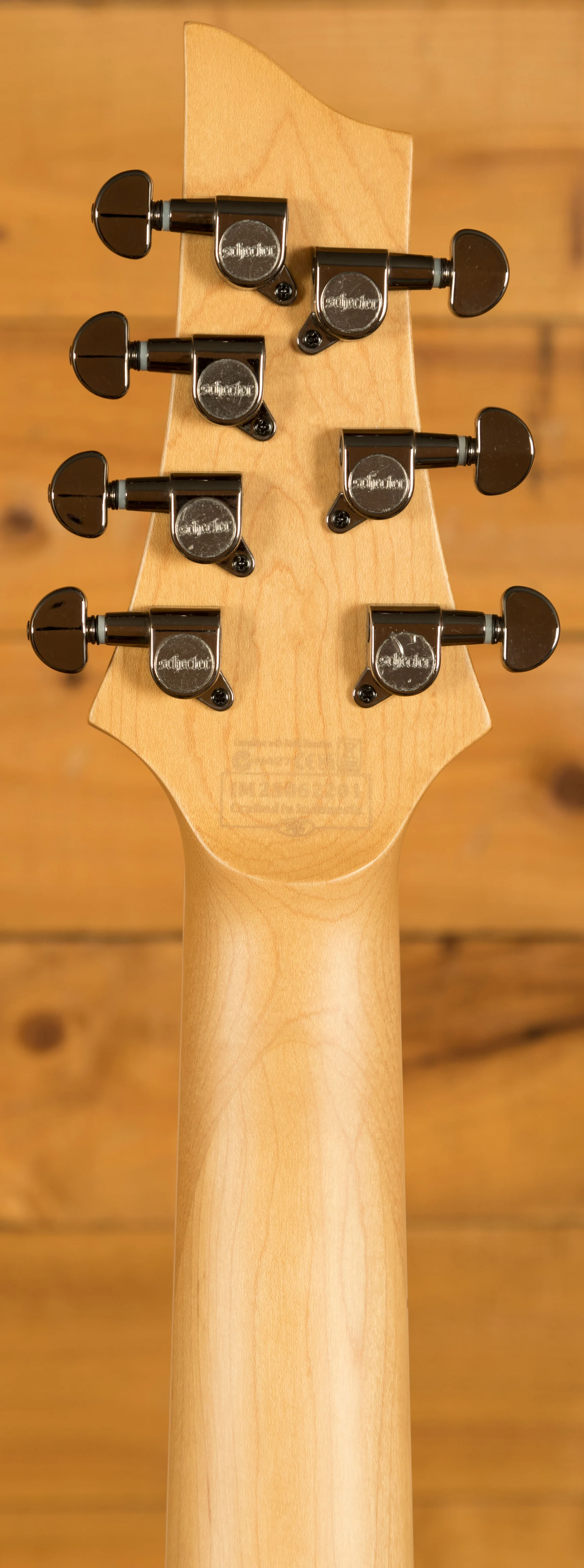 Loaded with a pair of Schecter Diamond Plus humbuckers, the Omen Extreme-7 delivers tight lows and searing highs. The push-pull tone control unlocks coil-split functionality, giving you access to crisp single-coil tones alongside full-throttle humbucker aggression. A Tune-o-Matic bridge with string-through body ensures rock-solid tuning and sustain, while black chrome hardware completes the look.