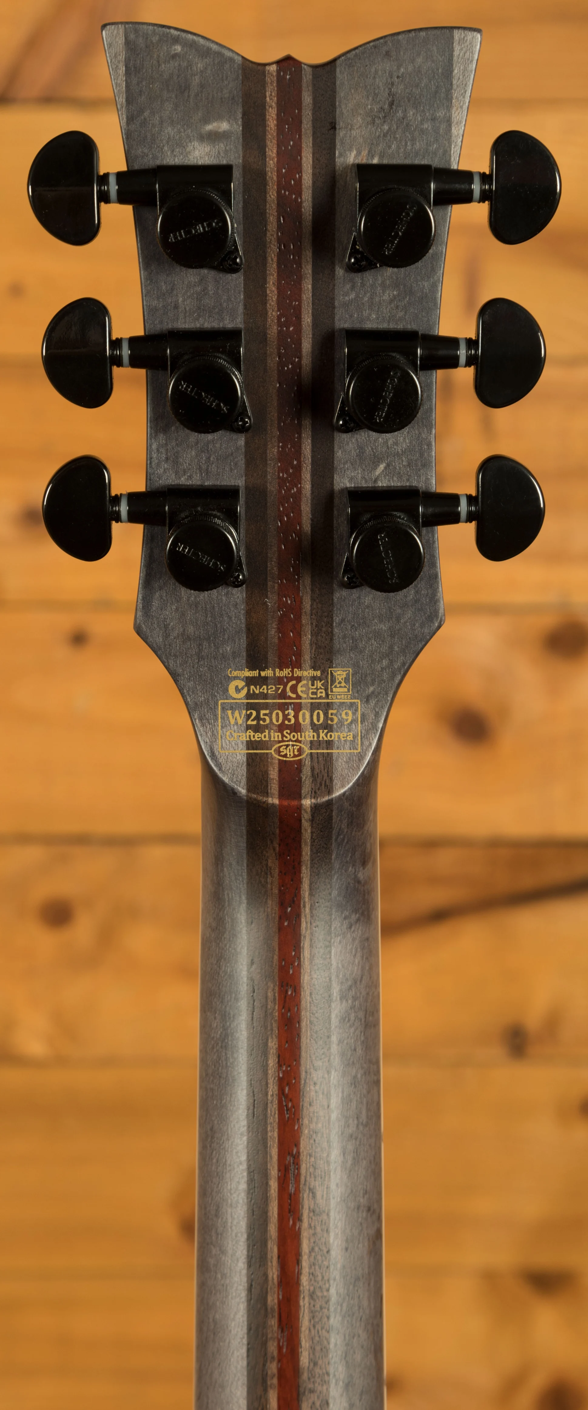 The Maple/Walnut/Padauk neck features carbon fibre reinforcement rods for a secure playing experience. The Ebony fingerboard boasts Roman Numeral inlays and a Thin C profile, 24 X-Jumbo frets. Its fast and comfortable.