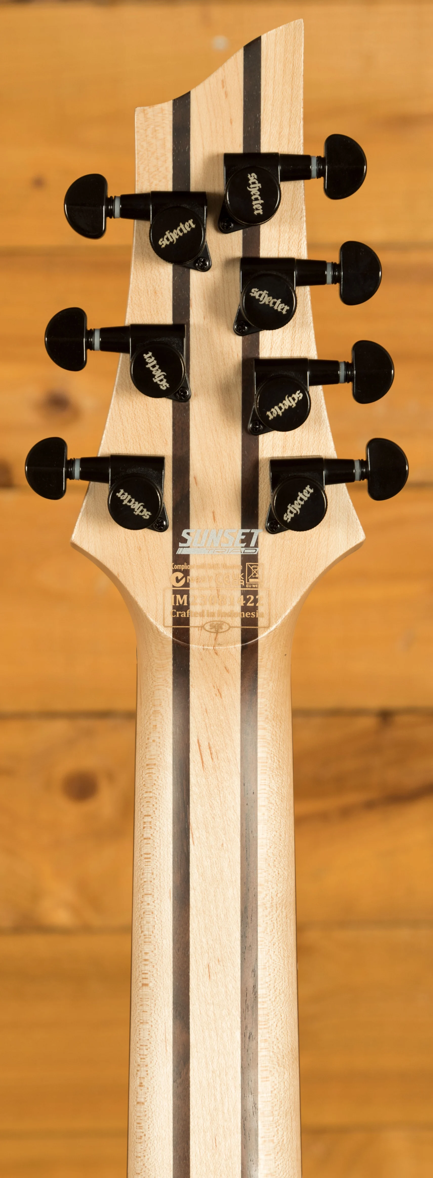 The Schecter Sunset-7 Triad is a meticulously crafted guitar with several notable features. Its flat top design with bevelled edges not only adds to its aesthetics but also enhances playability. The bolt-on construction with ultra access ensures you can effortlessly reach higher frets. Crafted from Nyatoh, the body of this guitar offers a sturdy and resonant foundation.