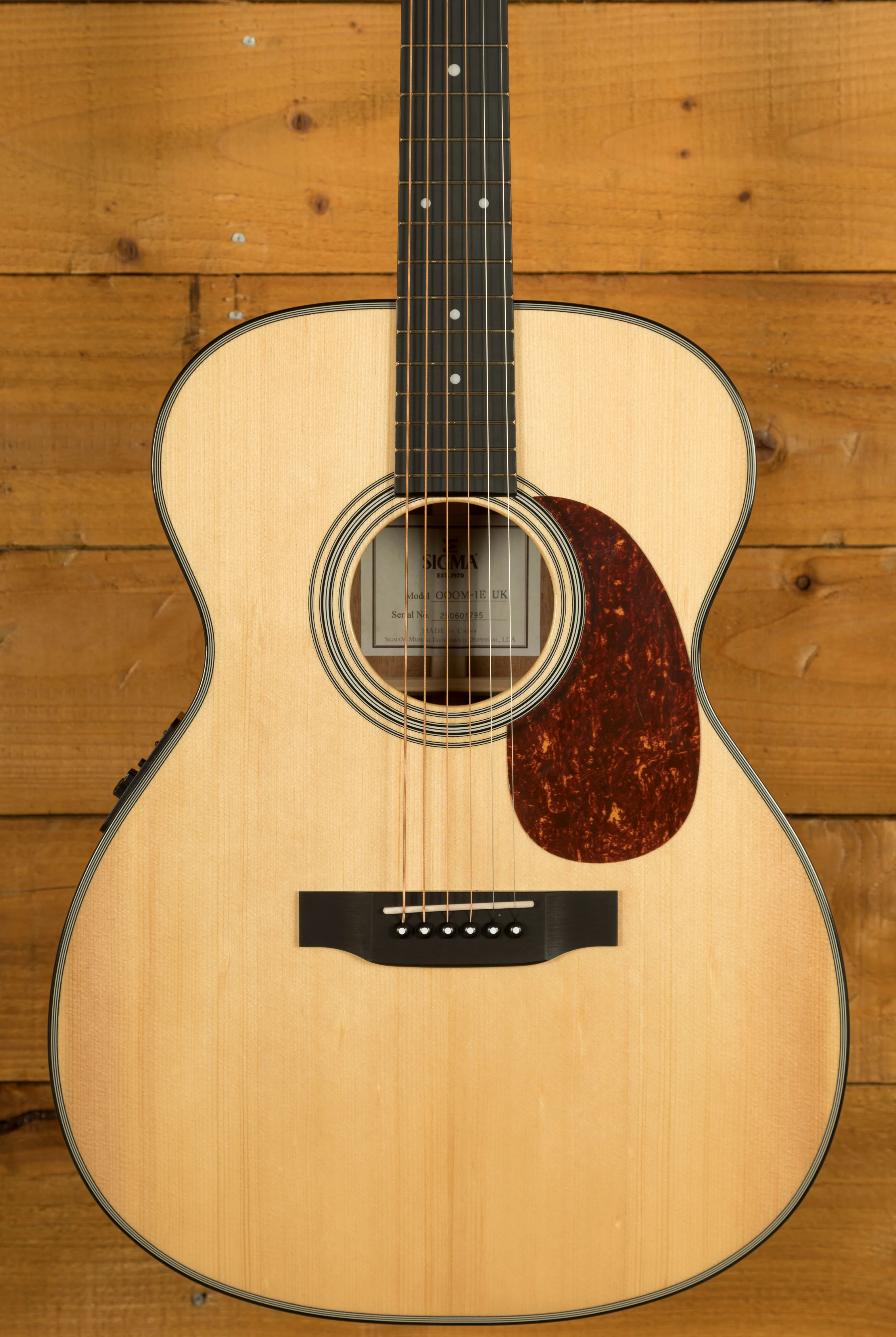 The Sigma 1 Series 000M-1E features a 000-14 fret body size and is constructed with a dovetail neck joint. It has a solid Sitka spruce top and mahogany back and sides, providing a rich and resonant sound. The low-profile mahogany neck, bone nut and saddle, and Micarta fingerboard and bridge ensure durability and excellent playability. The guitar has a scale length of 25.4 inches (645 mm) and a neck width at the nut of 1-11/16 inches (42.9 mm), with a two-way truss rod for precise adjustments.