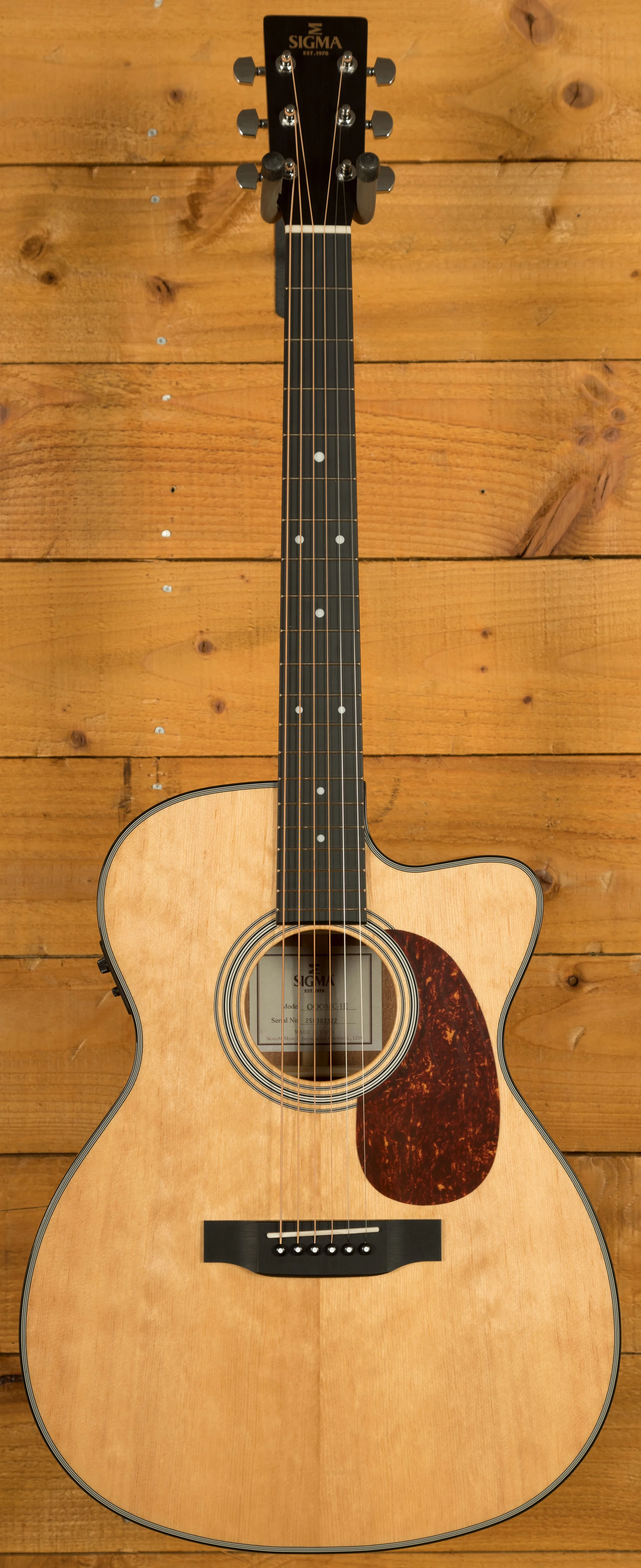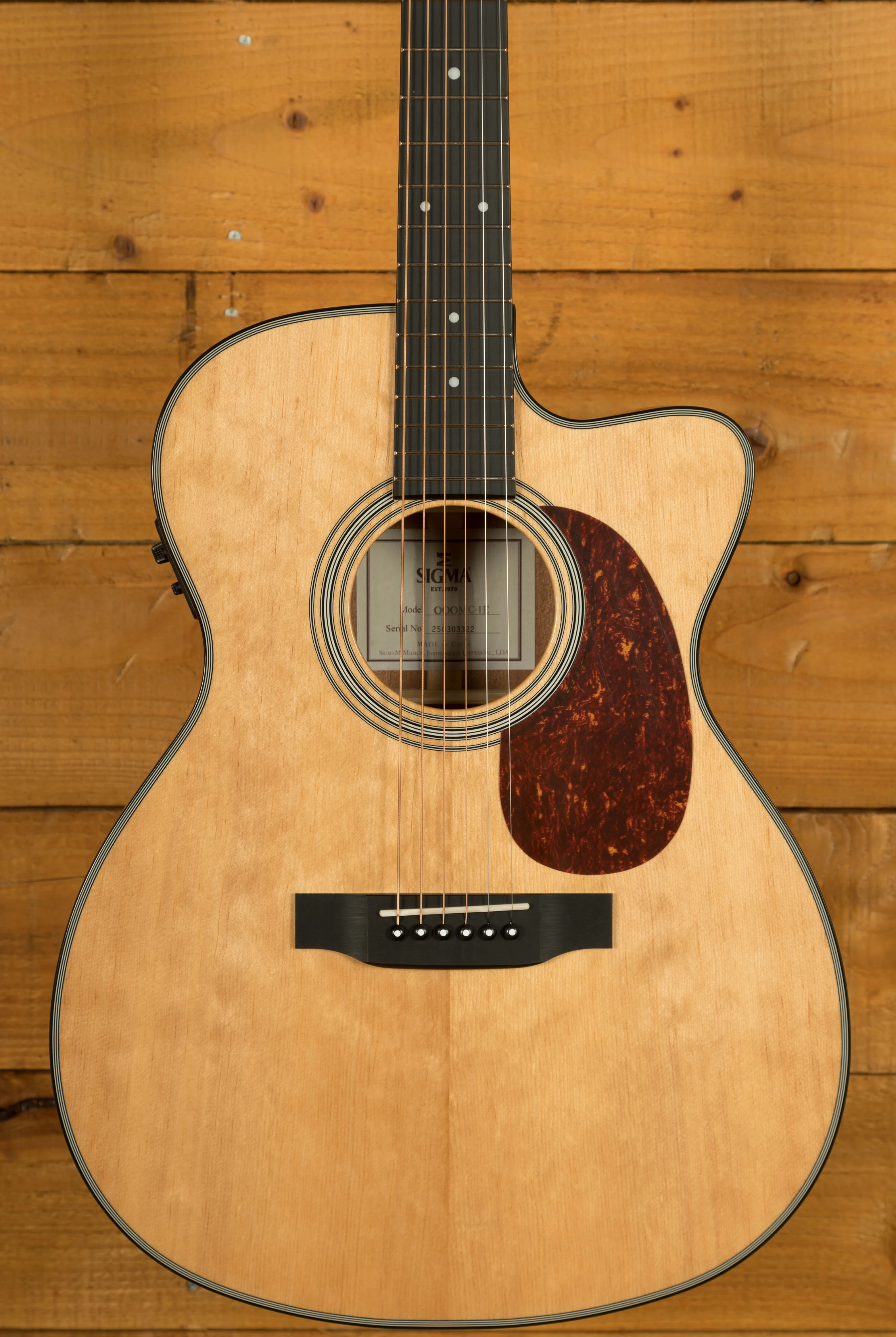 The Sigma 1 Series 000MC-1E features a 000-14 fret body size and is constructed with a cutaway and a dovetail neck joint. It has a solid Sitka spruce top and mahogany back and sides, providing a rich and resonant sound. The low-profile mahogany neck, bone nut and saddle, and Micarta fingerboard and bridge ensure durability and excellent playability. The guitar has a scale length of 25.4 inches (645 mm) and a neck width at the nut of 1-11/16 inches (42.9 mm), with a two-way truss rod for precise adjustments.