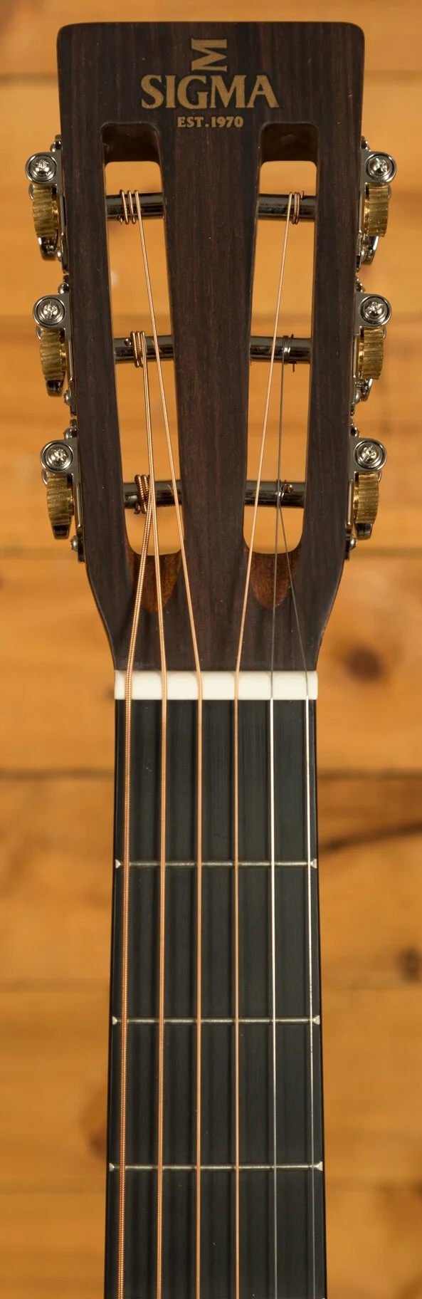 Crafted with precision and attention to detail, the Sigma 000T-28S features a dovetail neck joint for enhanced stability and resonance. The neck, constructed from high-quality mahogany, offers a low-profile design that promotes effortless playability across the entire fretboard. Equipped with bone nut and saddle, as well as Micarta fingerboard and bridge, this guitar ensures optimal tone transfer and sustain, allowing your music to resonate with clarity and depth.