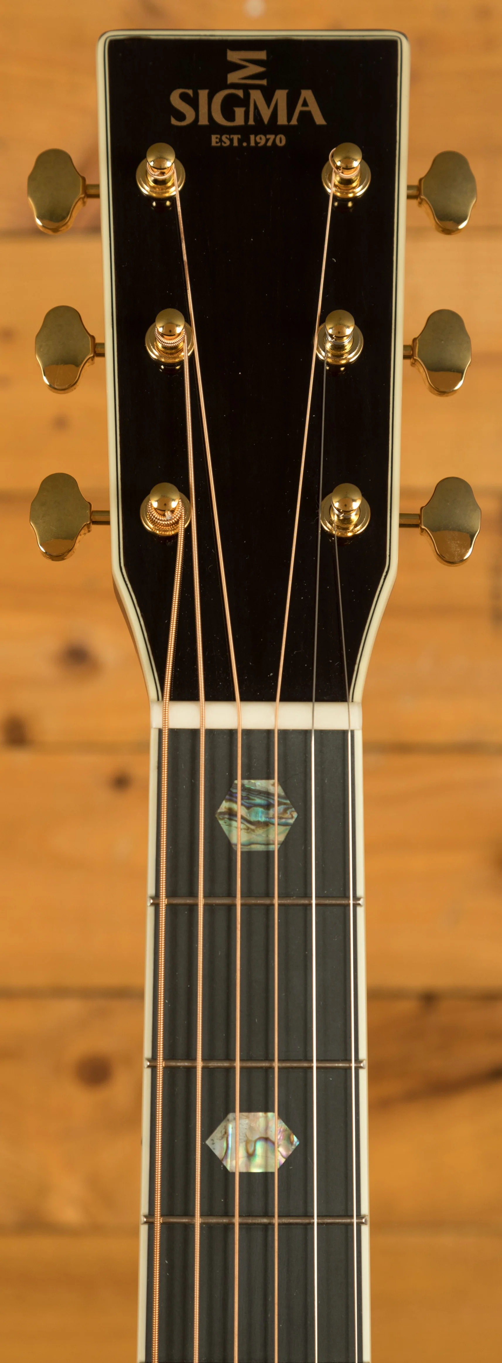 The Sigma DT-41 is a standout model in this series. It has a D-14 fret body size and a dovetail neck joint, ensuring stability and resonance. The top is made from solid Sitka spruce, known for its strength and clarity of sound. The back and sides are crafted from Tilia, providing a balanced tone. The mahogany neck has a low profile for comfortable playability, and the nut and saddle are made from bone, enhancing the guitar's overall sustain and tone.