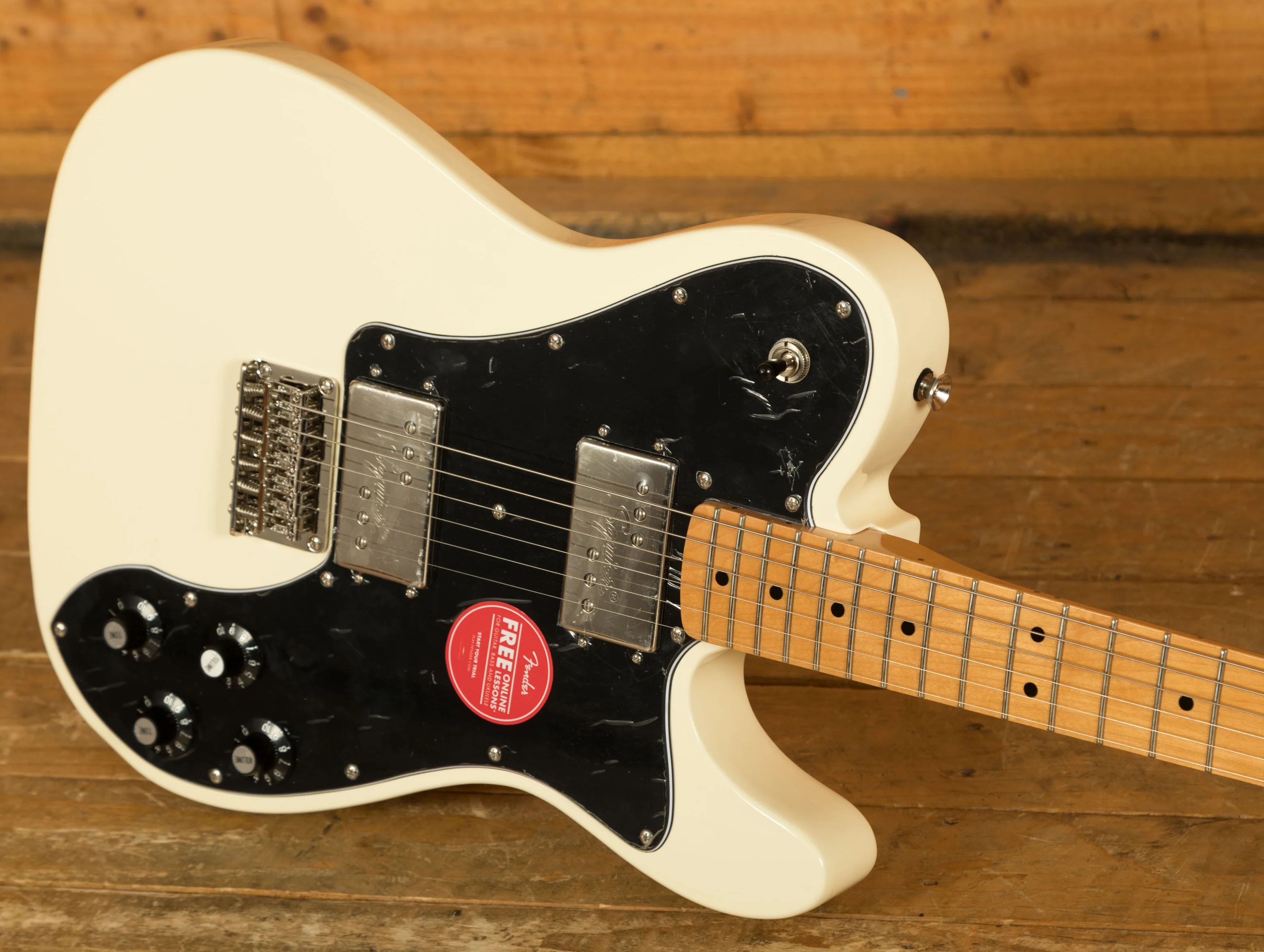 The Poplar body is finished in a crisp Olympic White Gloss, lightweight and finely crafted; it delivers classic Deluxe tones. The Maple neck features a modern C profile, 25.5" scale length, 9.5" radius and 21 narrow tall frets. It's real comfortable, whether you are playing huge chords or smooth lead lines, the Deluxe can deliver it.