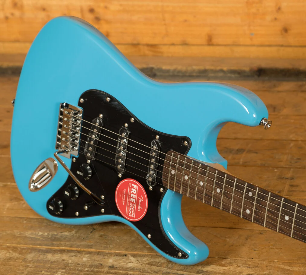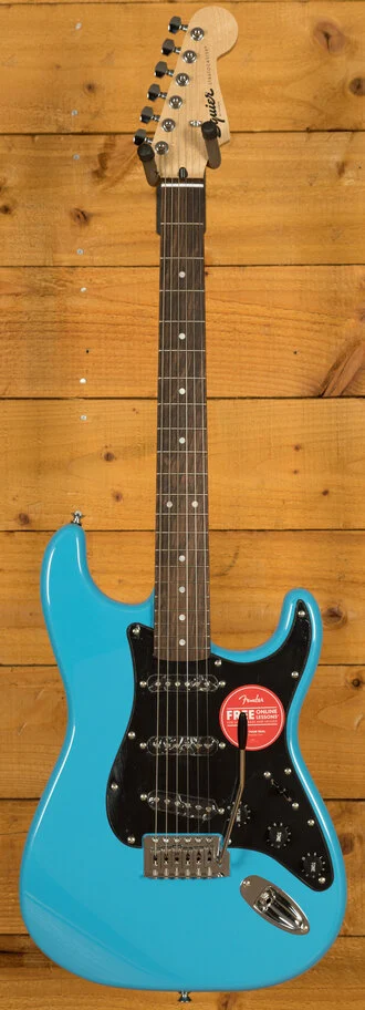 The Squier Sonic series is ready to kickstart your journey to Stardom! With iconic fender style and tone these guitars are aimed at players of all ages and ability. A thin and lightweight Poplar body is beautifully finished in a beautiful California Blue, it is incredibly well weighted and super comfortable.