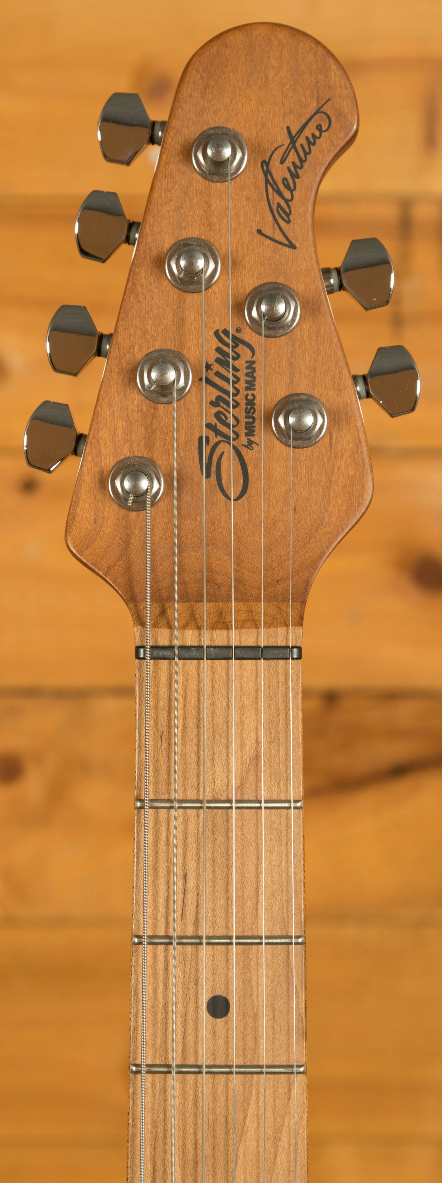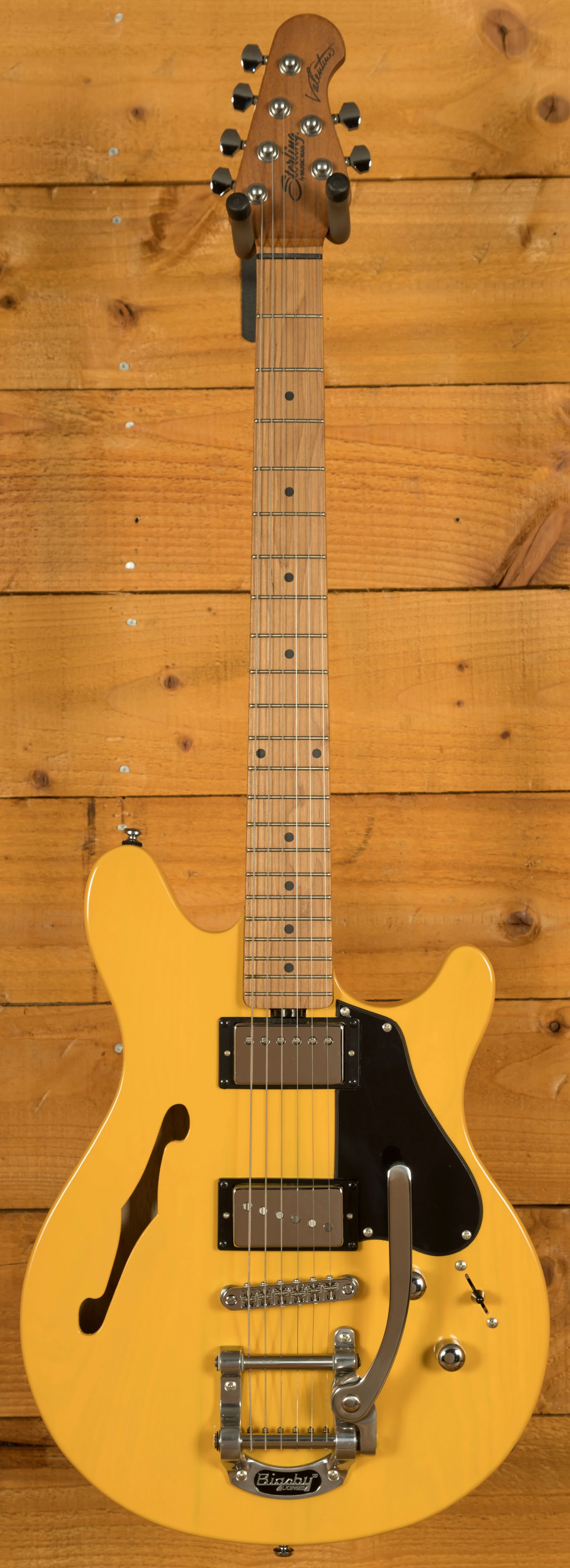The Sterling by Music Man Valentine Chambered Bigsby is the latest evolution in the acclaimed Valentine Collection, designed in collaboration with Grammy Award-winning guitarist James Valentine. This model builds on the original's renowned features - including a White Ash body, roasted maple neck, and 12dB push-push boost - while introducing thoughtful updates for enhanced tone and performance. Its new chambered body design not only reduces weight for improved comfort but also increases resonance, delivering a more dynamic and responsive acoustic character. The inclusion of an f-hole adds to its tonal depth and visual appeal, giving players a lively and articulate instrument suited for both studio and stage.