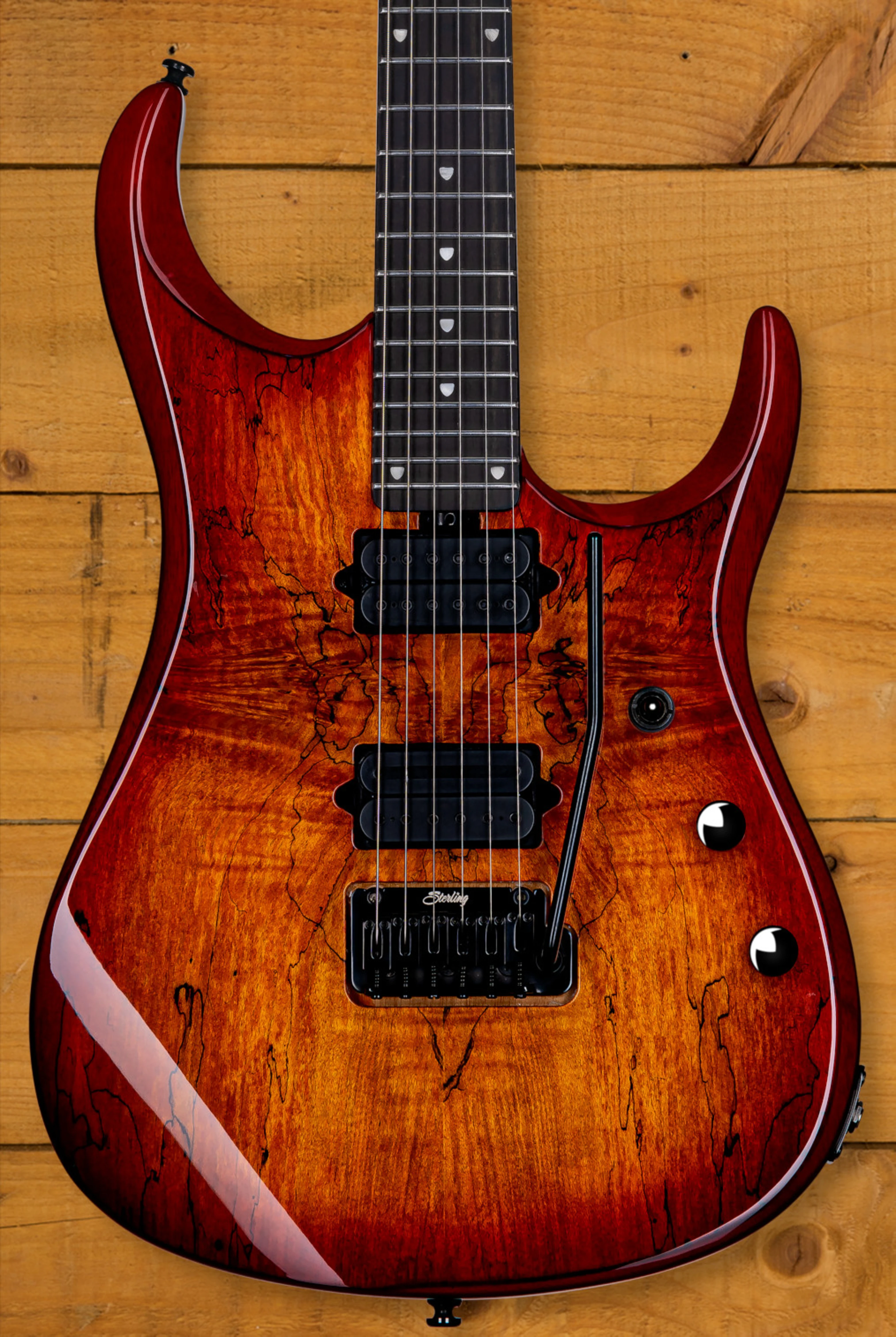 The Sterling John Petrucci JP150 DiMarzio is a sleek and ergonomic powerhouse. Its body is constructed from Nyatoh with a spalted maple veneer top, providing a balanced tone with clear low-end response and bright, articulate highs. The 25.5" scale length combined with a bolt-on roasted maple neck ensures precise intonation, stability, and durability while maintaining the smooth playability John Petrucci is known for.