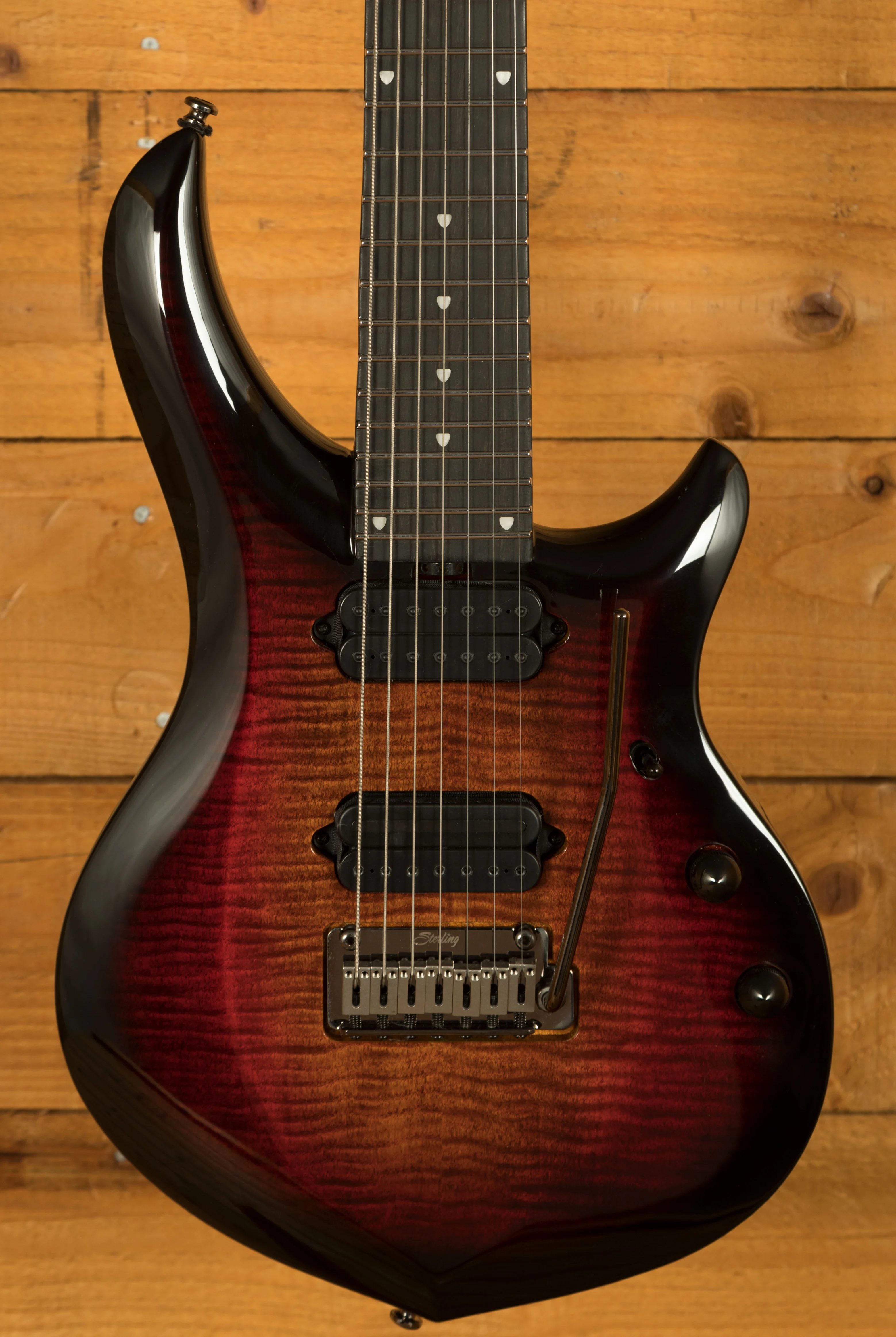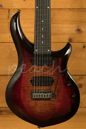 The Sterling by Music Man John Petrucci Majesty 7 DiMarzio is a high-performance 7-string electric guitar designed in collaboration with John Petrucci to deliver precision, tone, and reliability. Built with a nyatoh body and a flamed maple veneer top, this instrument offers a balanced tonal foundation with striking aesthetics. Its 25.5" scale length and 3-piece nyatoh neck ensure stability and sustain, while the set-in neck design enhances resonance and smooth upper-fret access, ideal for demanding modern players.