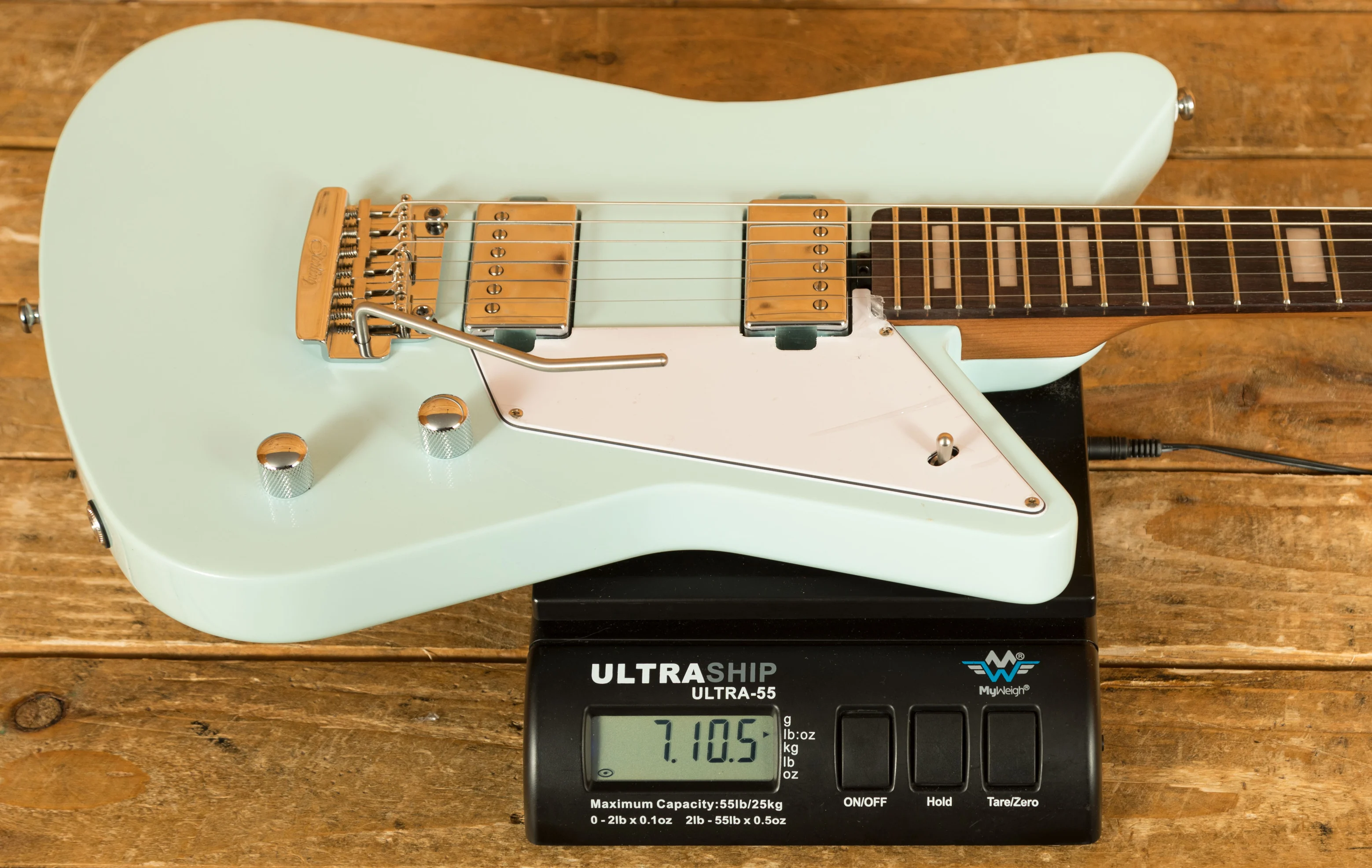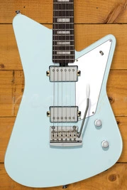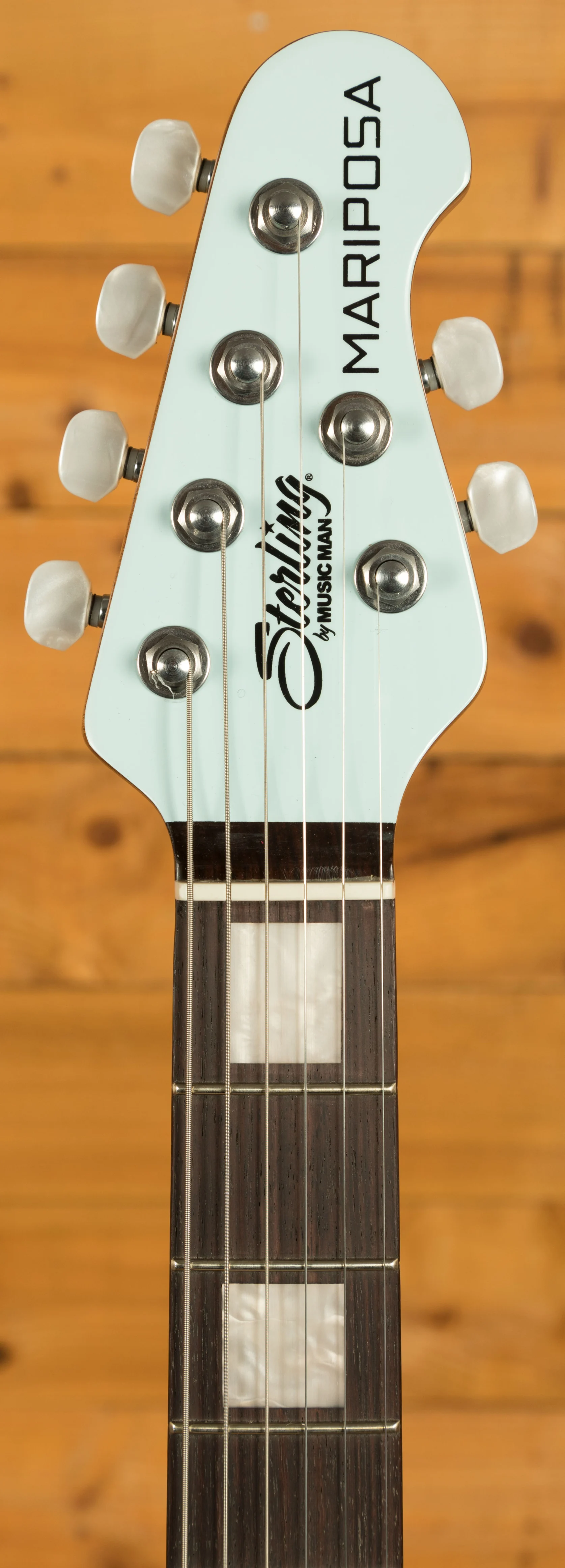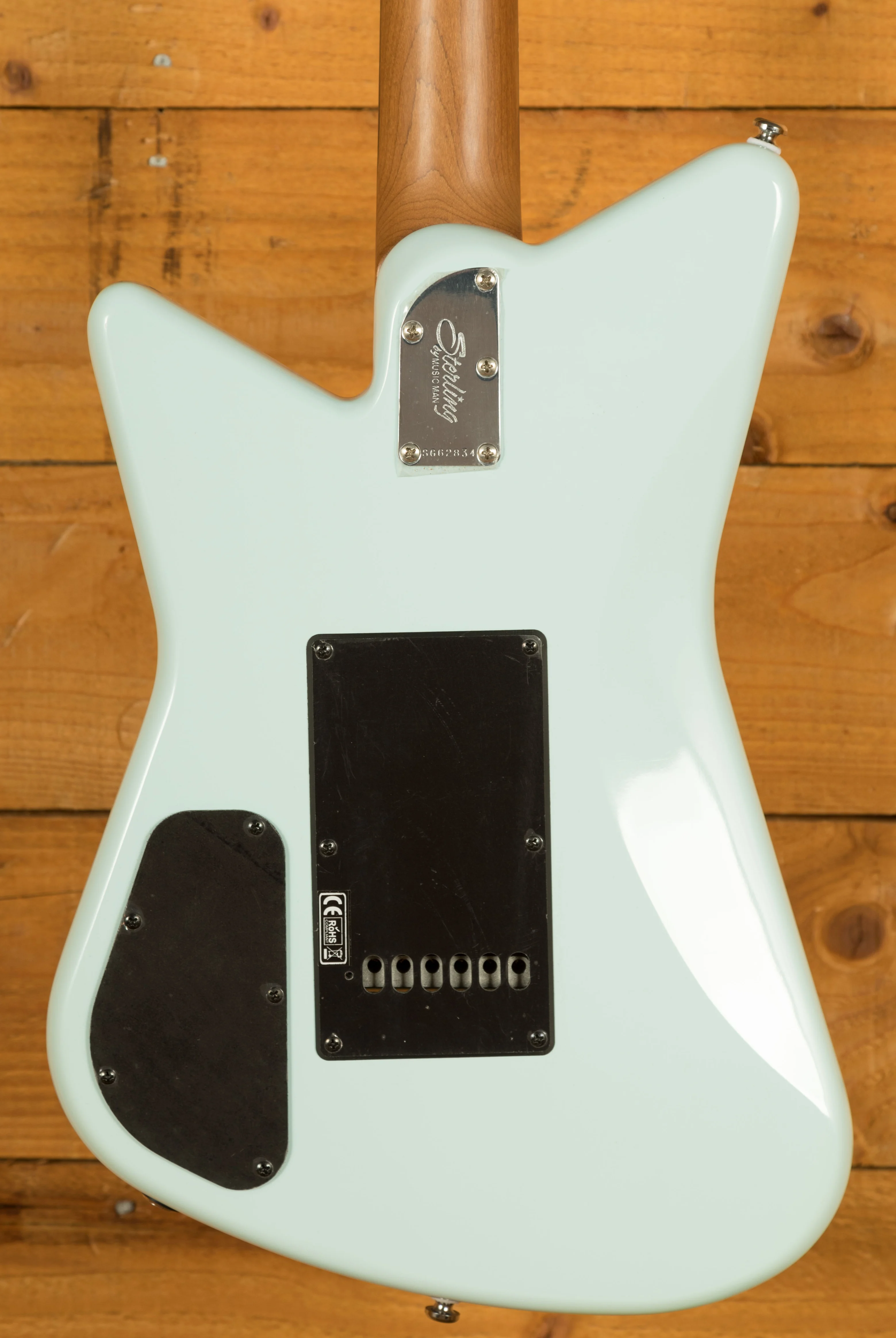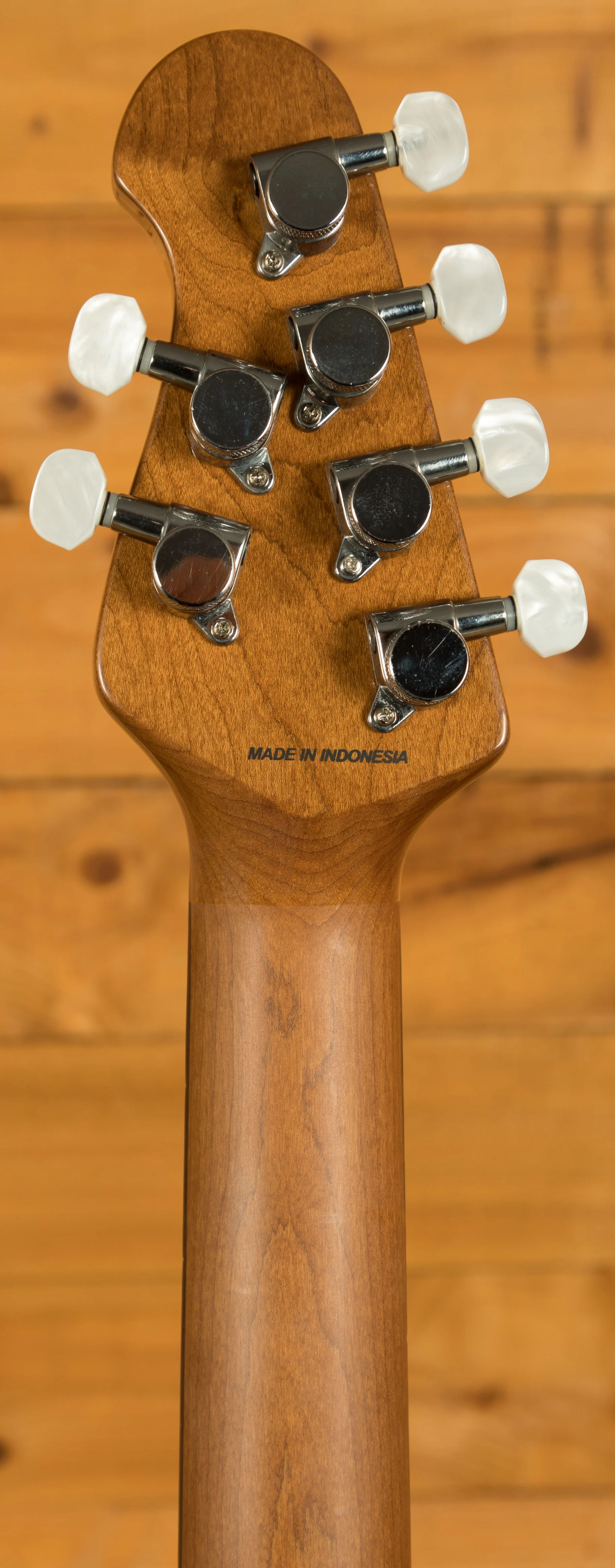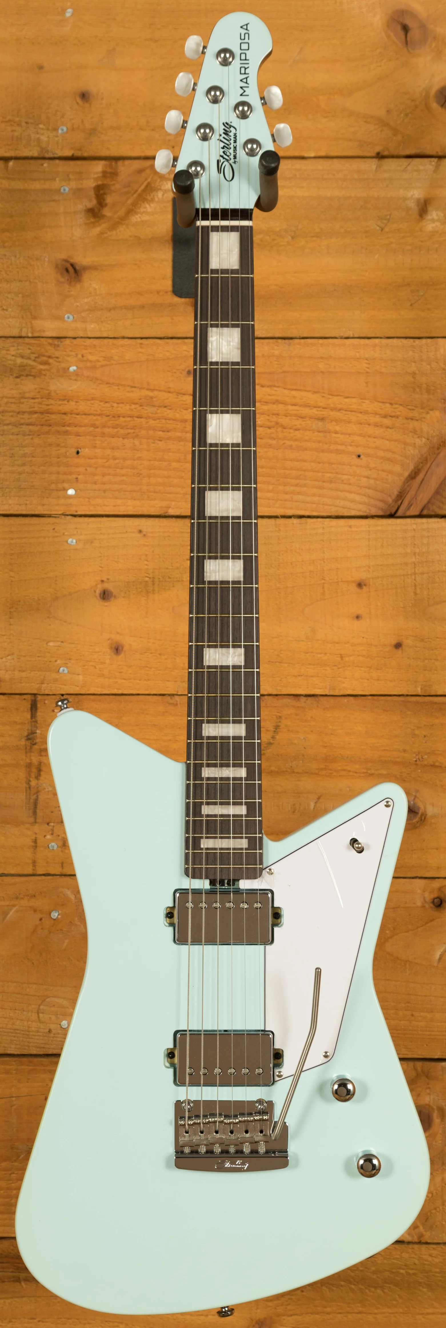 The Sterling Mariposa is a professional-grade electric guitar developed in collaboration with Omar Rodríguez-López, guitarist of Mars Volta and At the Drive-In. Its distinctive offset body is crafted from Nyatoh, providing a balanced tone with strong midrange response. The guitar features a 25.5" scale length and a rosewood fingerboard with a 12" radius, offering a comfortable playing surface for both complex chord work and fast lead lines. With 22 medium-high frets and white pearloid block inlays, the Mariposa delivers precise intonation and clear visual markers for accurate navigation across the fretboard.