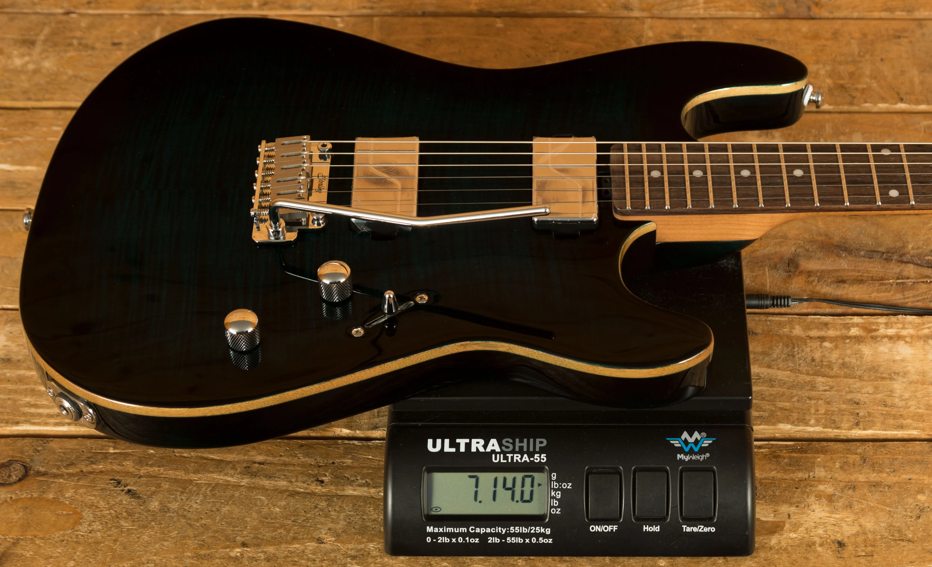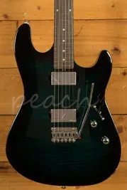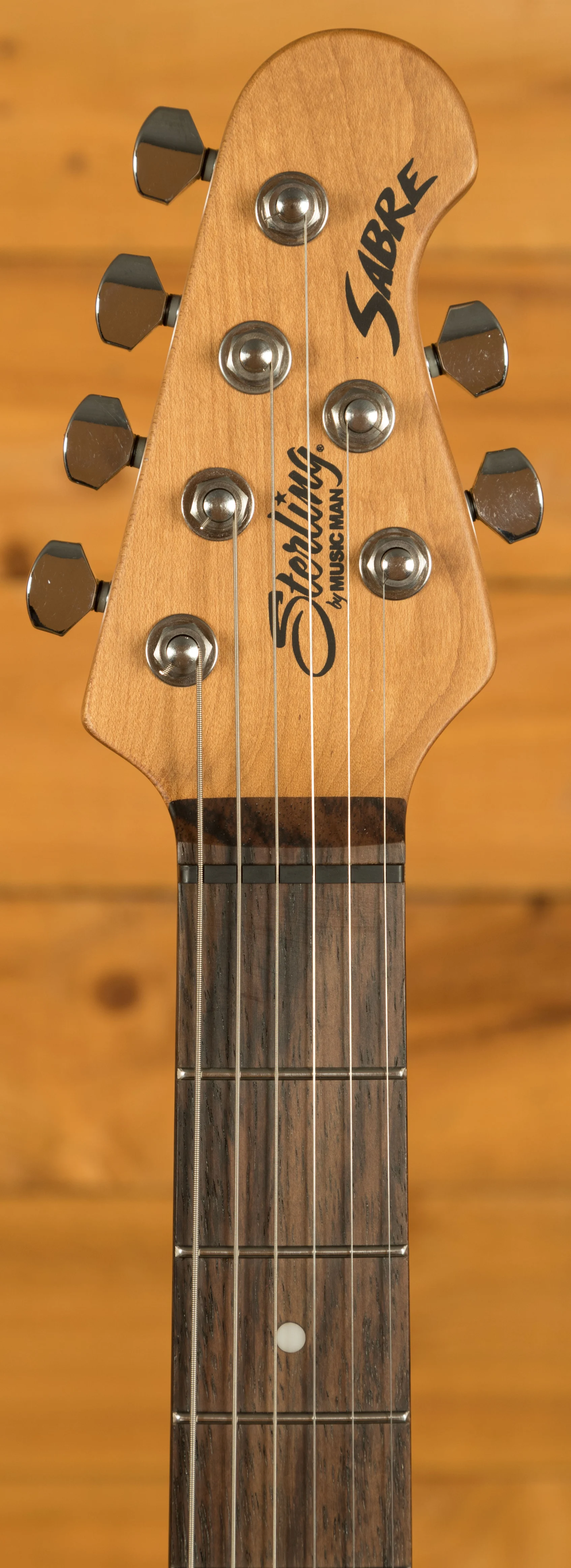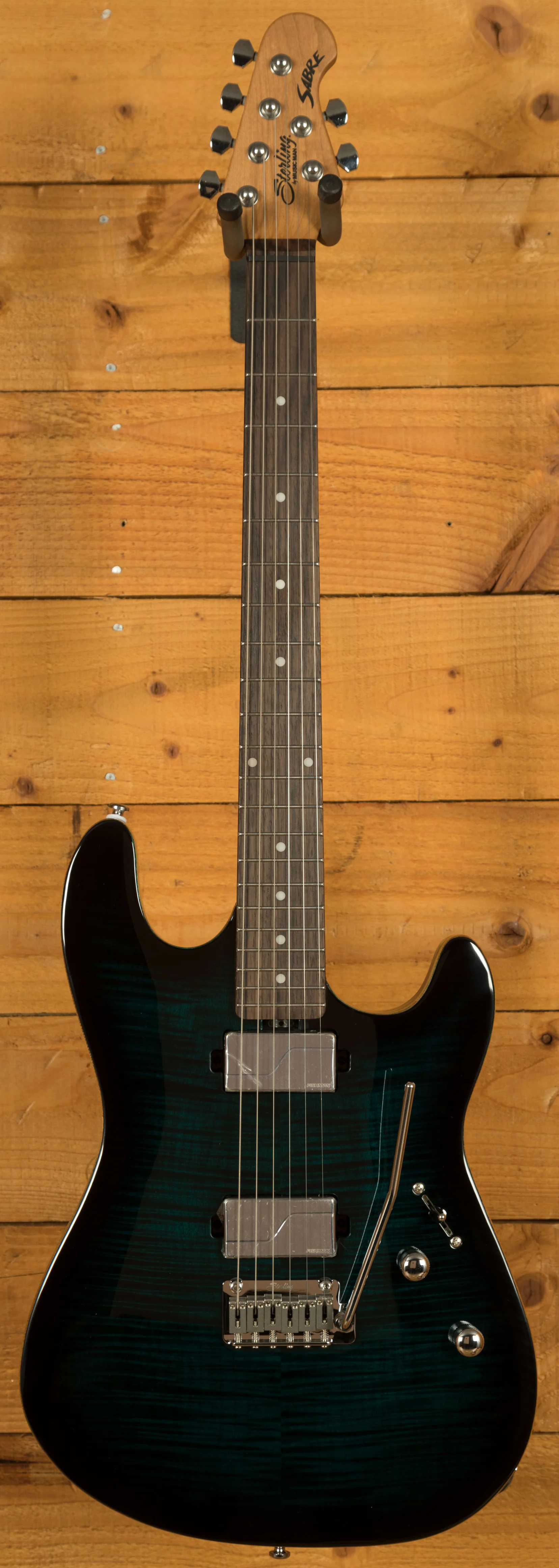 The Sterling Sabre is a high-performance electric guitar designed for modern players. It features a nyatoh body with a flame maple top, offering both durability and a visually appealing finish. The body is shaped for comfort and ease of access to higher frets, making it suitable for long playing sessions. Its 25.5" scale length and 12" fingerboard radius combine with a modern C-shaped roasted maple neck and 22 medium-high stainless steel frets to provide smooth playability, fast action, and precise intonation across the entire neck. The 5-bolt neck attachment ensures stability, while the white dot fret markers offer clear visual guidance.