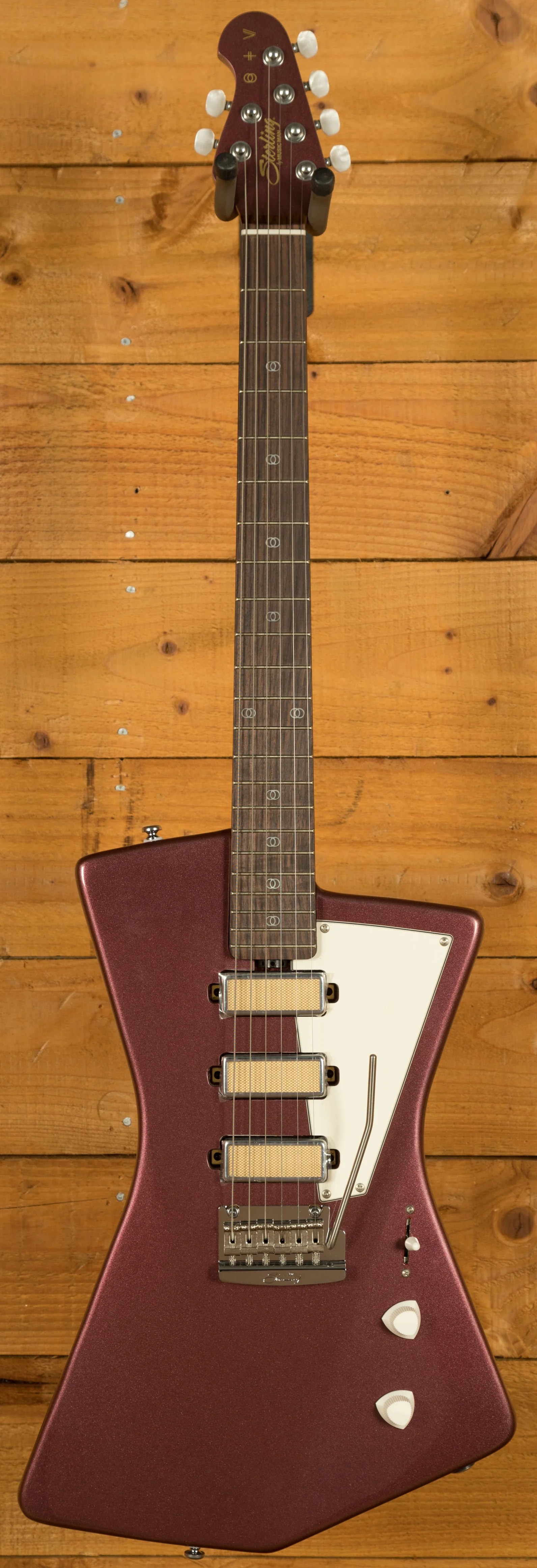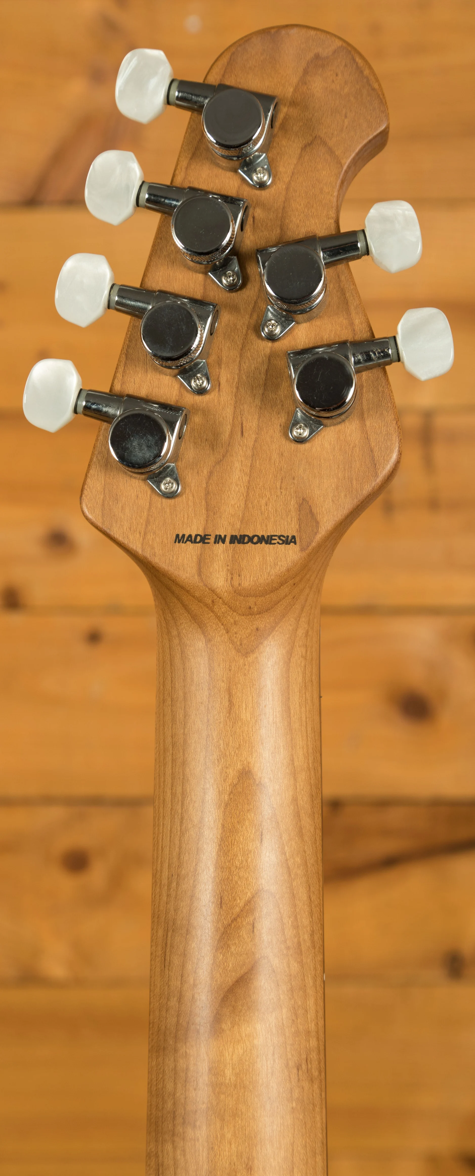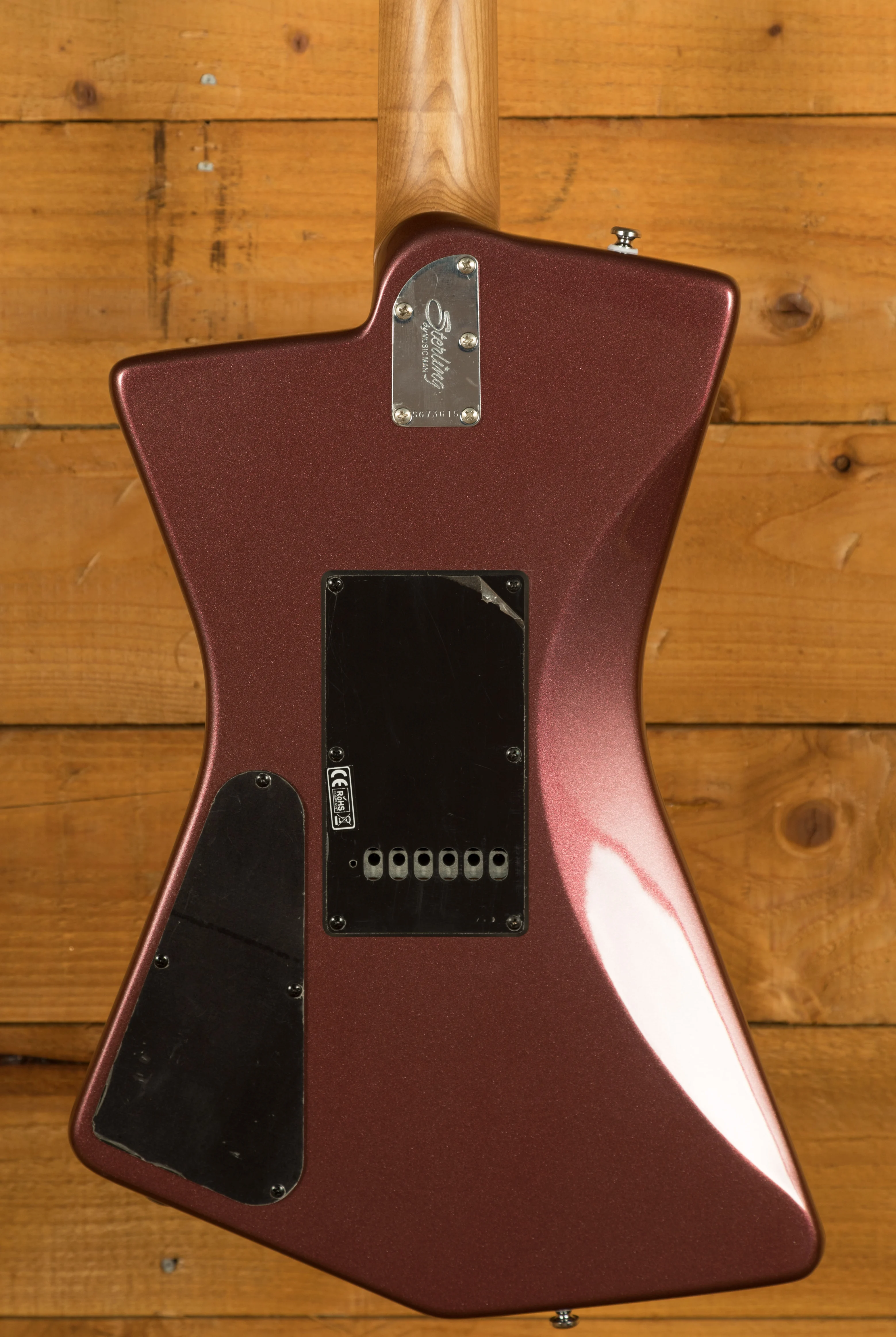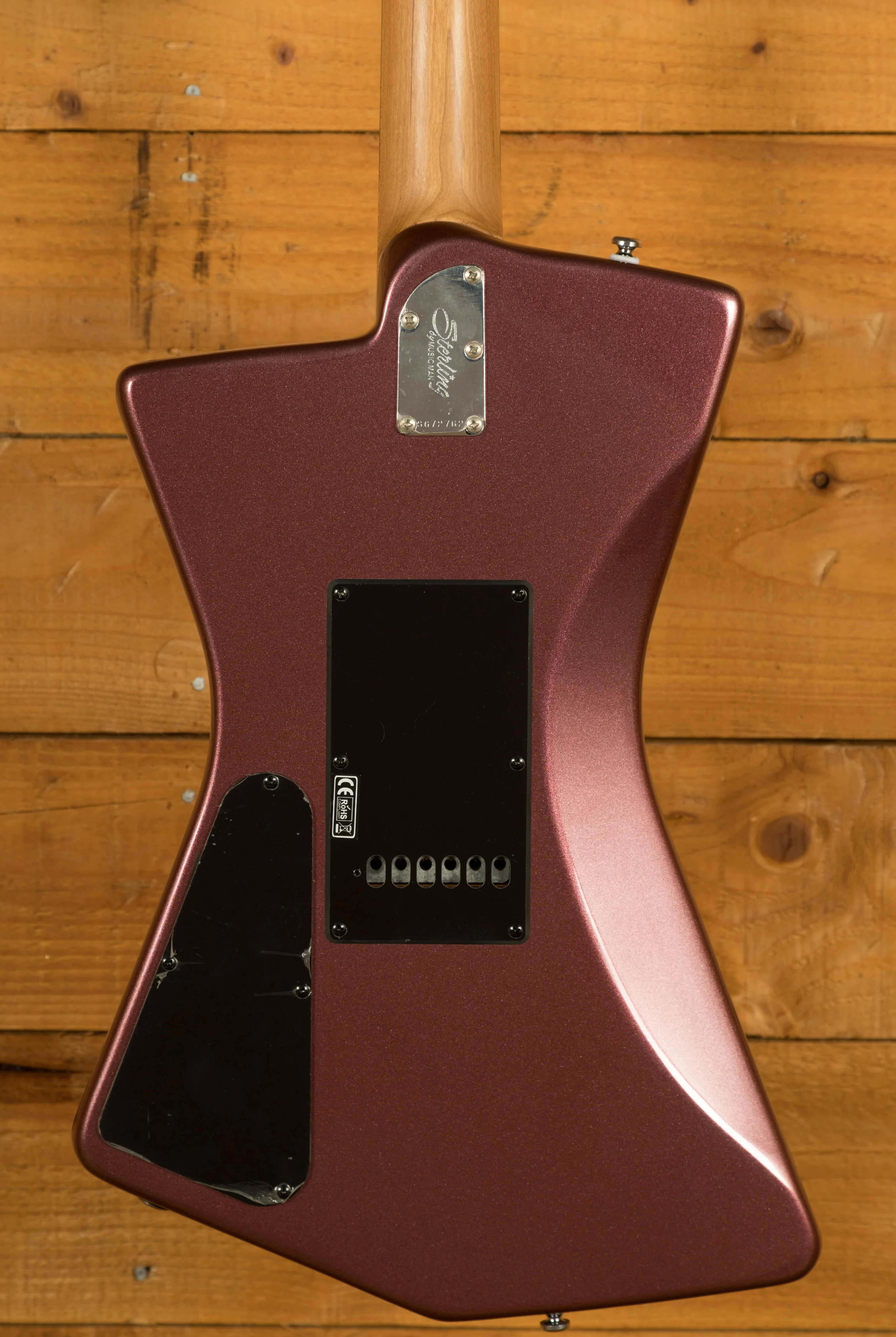 With a Nyatoh body, finished in Velveteen, the design for the St Vincent signature is super ergonomic and perfectly balanced. Unlike almost anything else on the market, it has a real modern feel but with a vintage heart. Features like the oversized reverse headstock with matching finish and the custom shaped control knobs really make this guitar unique in the Sterling catalogue.