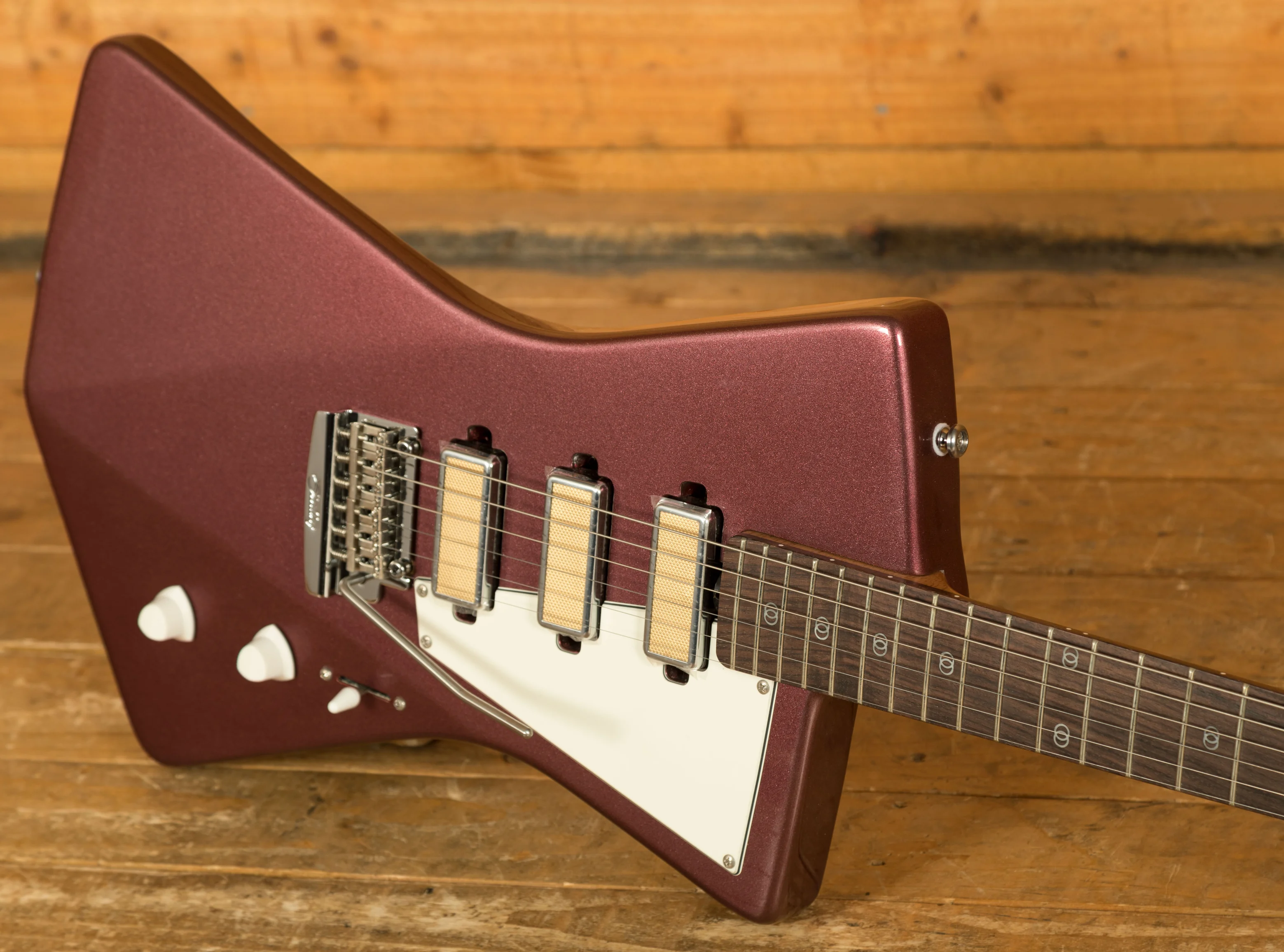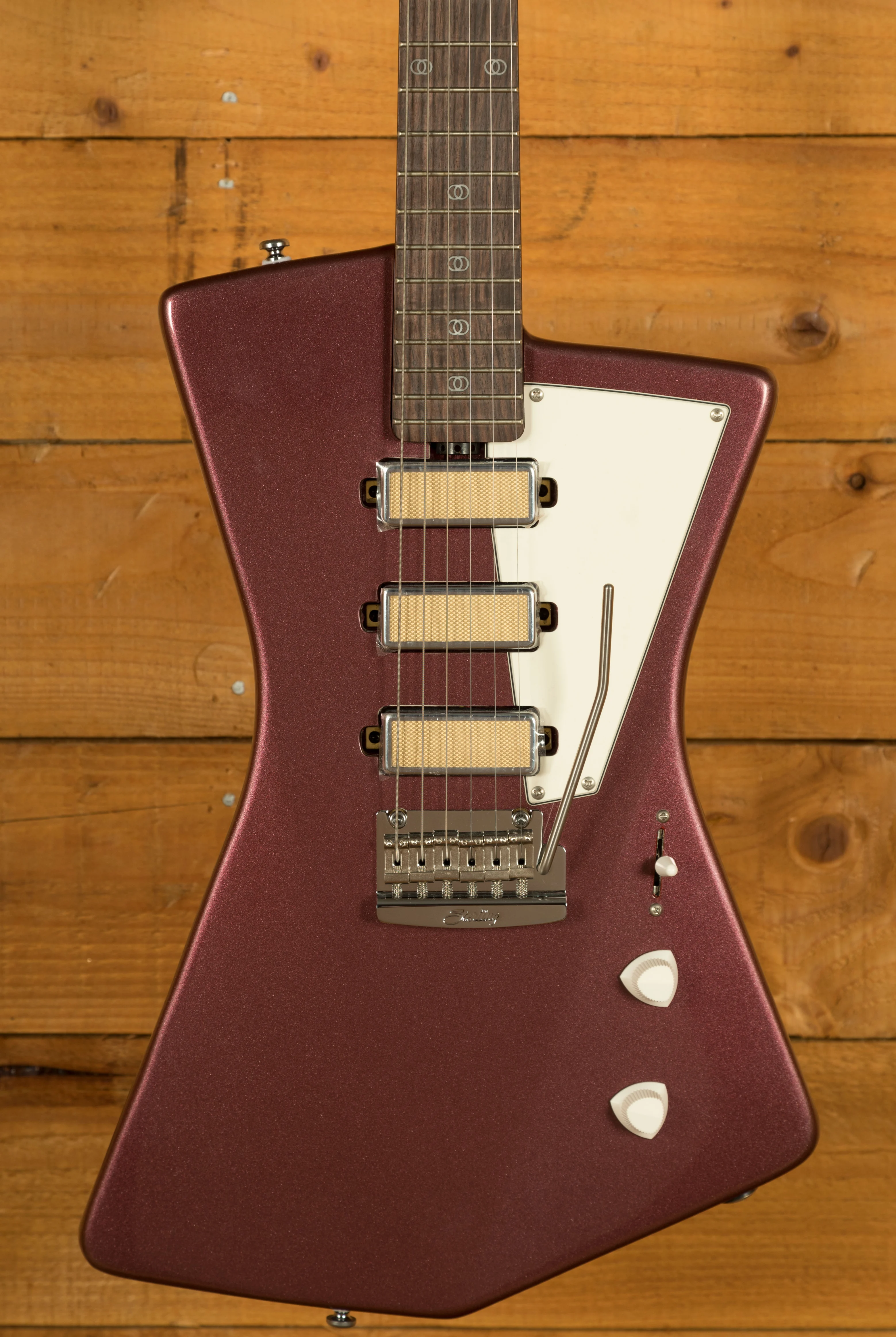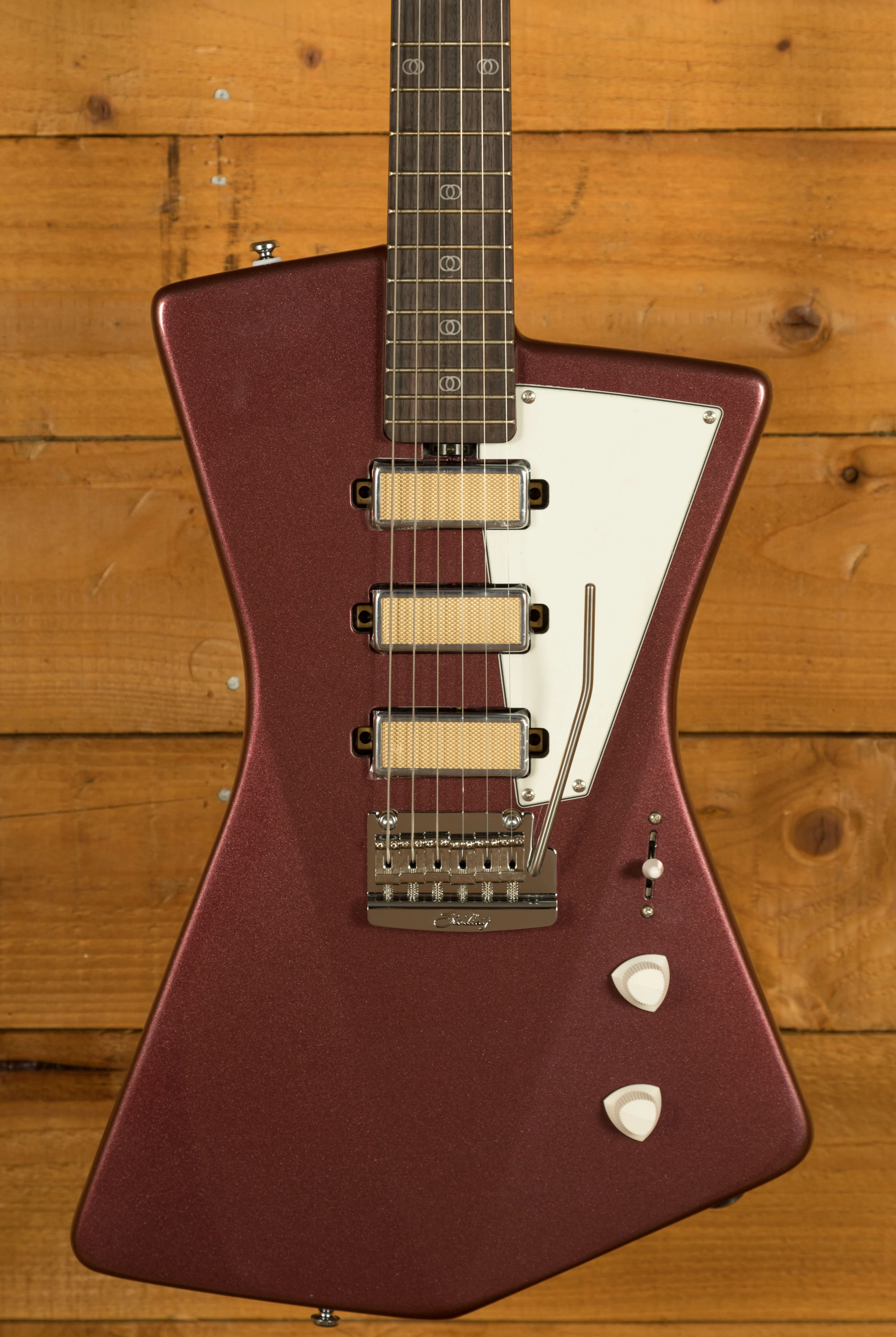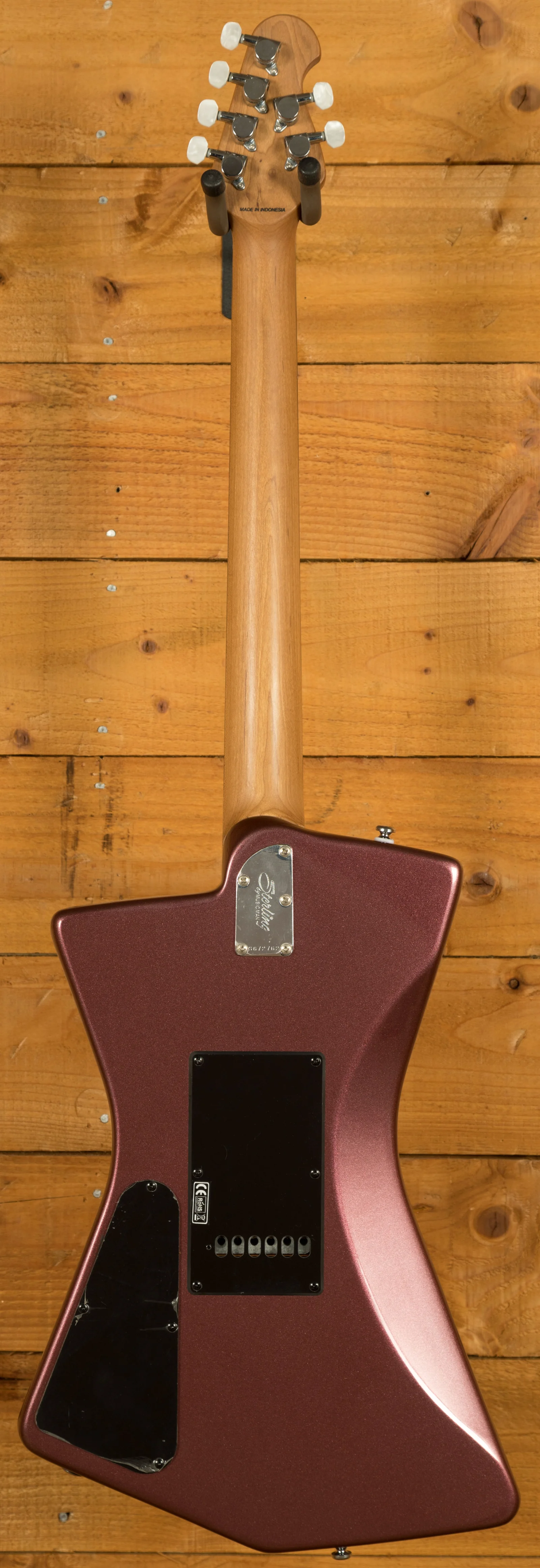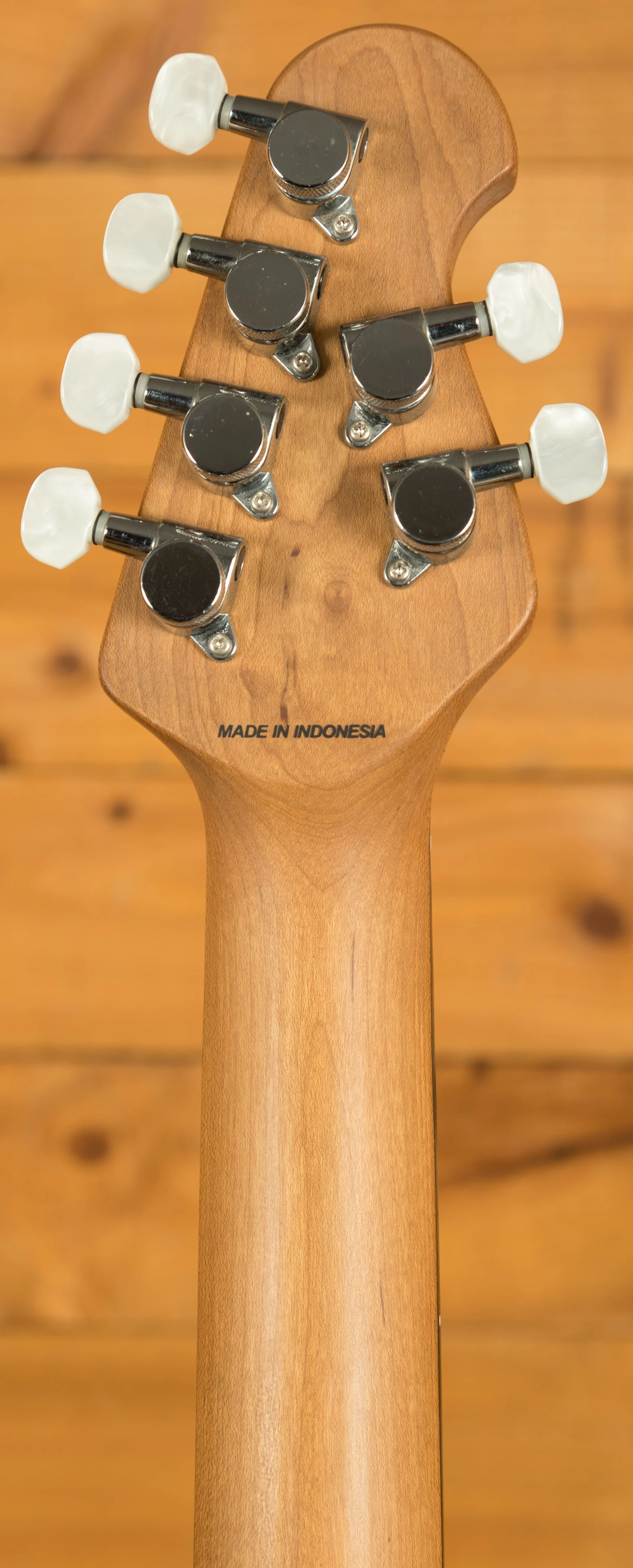 With a Nyatoh body, finished in Velveteen, the design for the St Vincent signature is super ergonomic and perfectly balanced. Unlike almost anything else on the market, it has a real modern feel but with a vintage heart. Features like the oversized reverse headstock with matching finish and the custom shaped control knobs really make this guitar unique in the Sterling catalogue.
