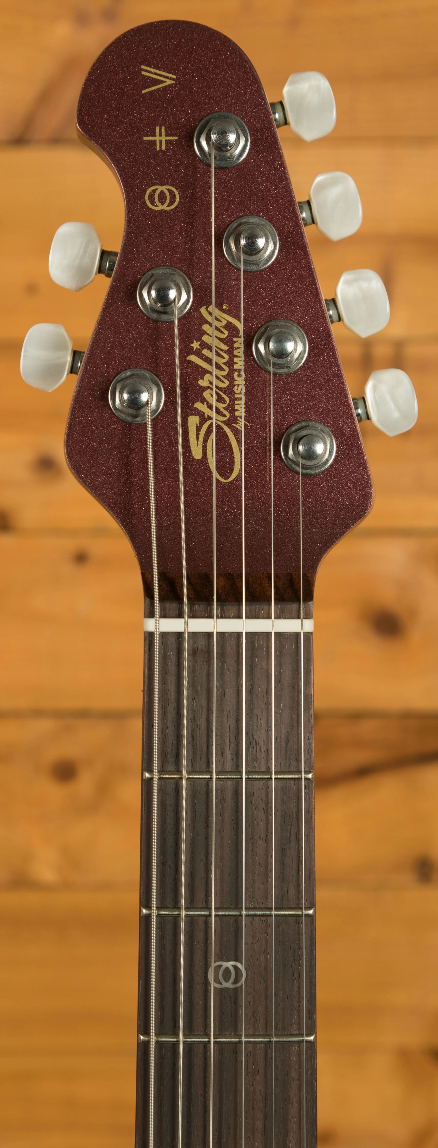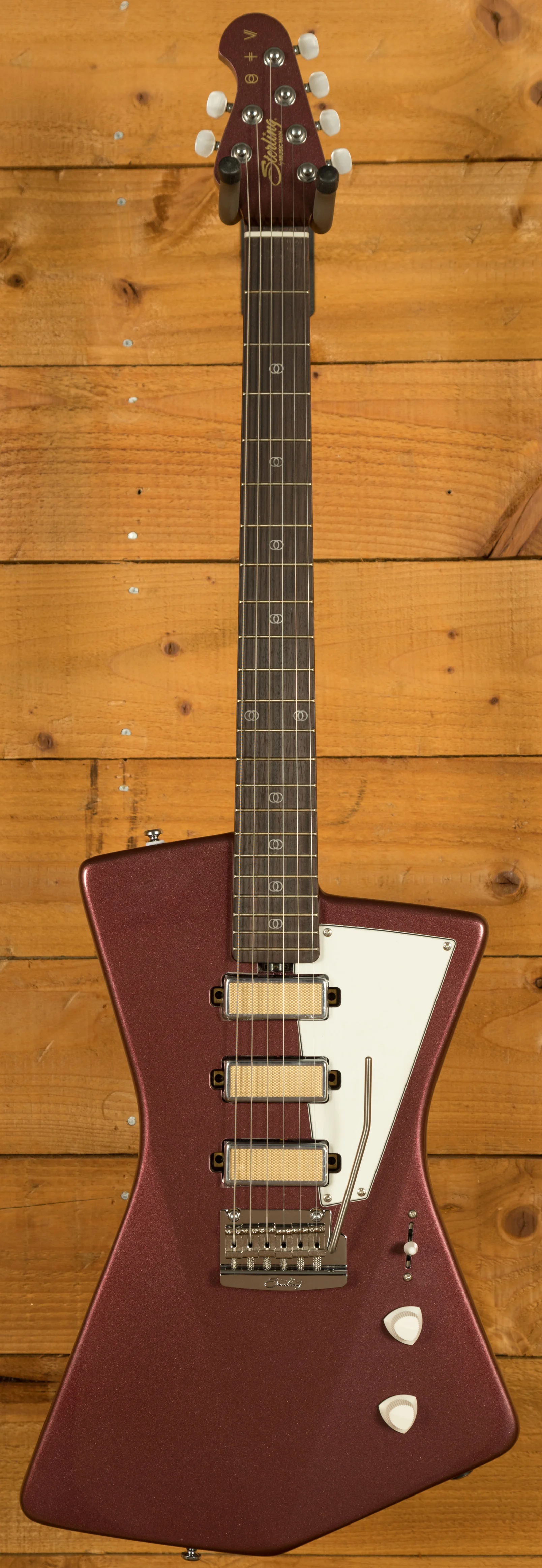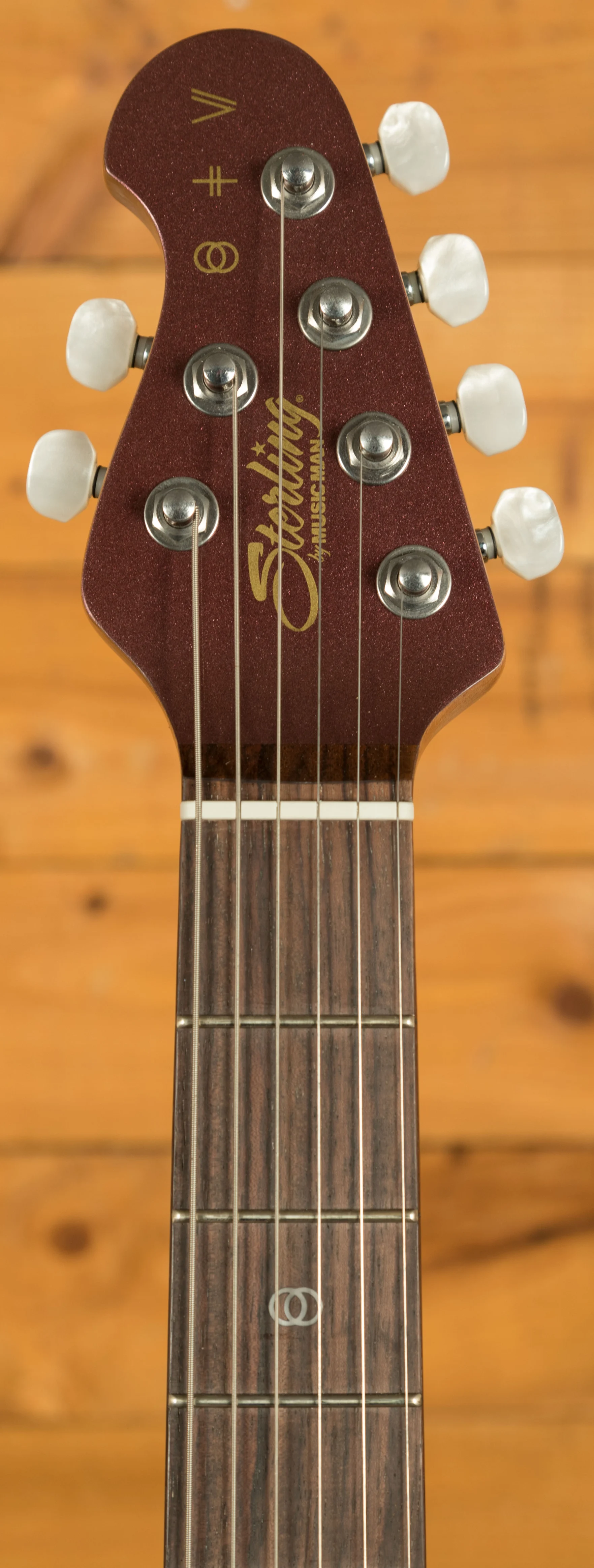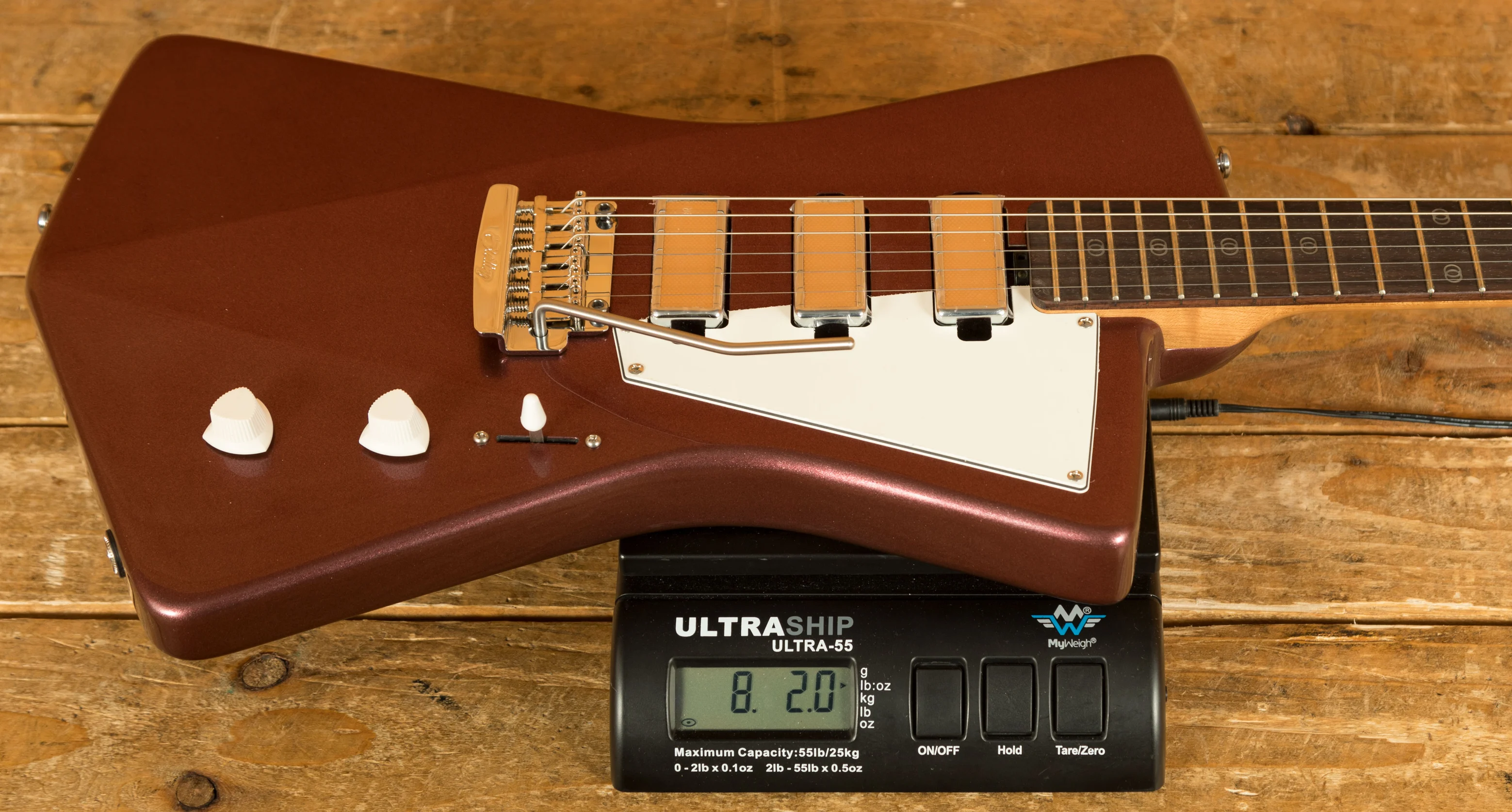 With a Nyatoh body, finished in Velveteen, the design for the St Vincent signature is super ergonomic and perfectly balanced. Unlike almost anything else on the market, it has a real modern feel but with a vintage heart. Features like the oversized reverse headstock with matching finish and the custom shaped control knobs really make this guitar unique in the Sterling catalogue.