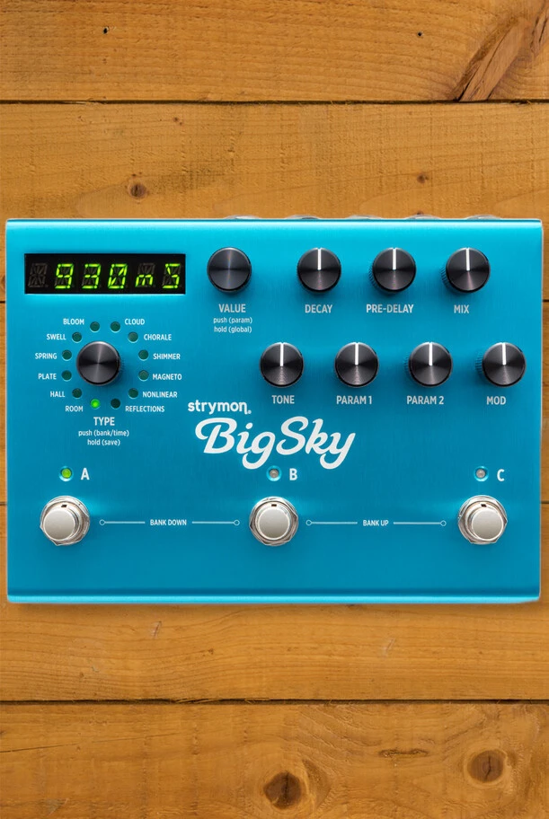 - LED display for preset info, reverb decay time, and extended parameter control