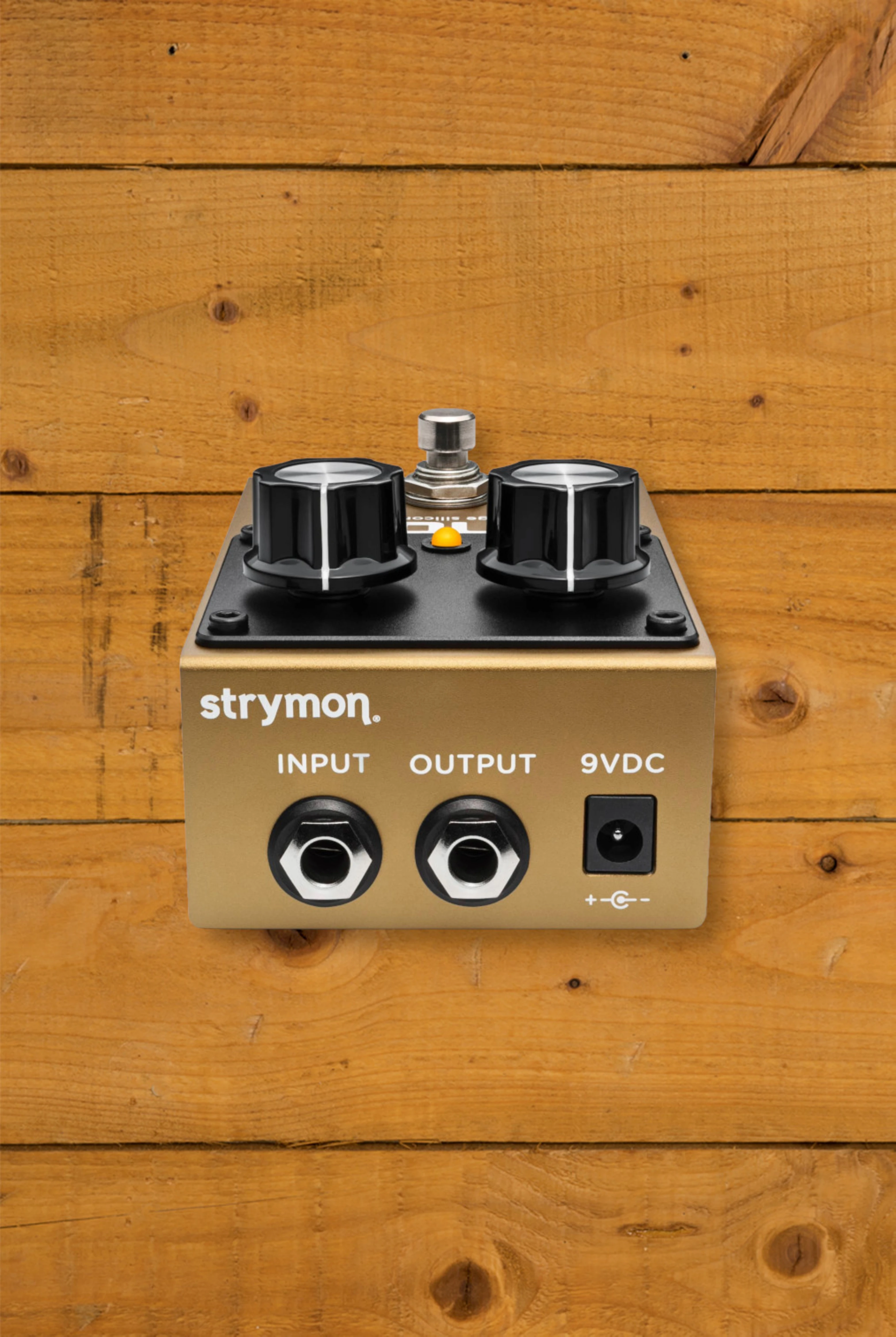 The Canoga is designed to integrate effectively with a wide range of amplifiers, especially those with natural overdrive. It enhances an amplifier's existing tonal characteristics by adding harmonic richness and sustain while preserving the core sound. Its high impedance input ensures accurate signal capture from guitar pickups, maintaining detail and responsiveness, while the low impedance output preserves signal strength through longer cable runs and complex pedal chains. As part of Strymon's Series A range, the Canoga uses a fully analogue design with true bypass switching for signal transparency when disengaged.