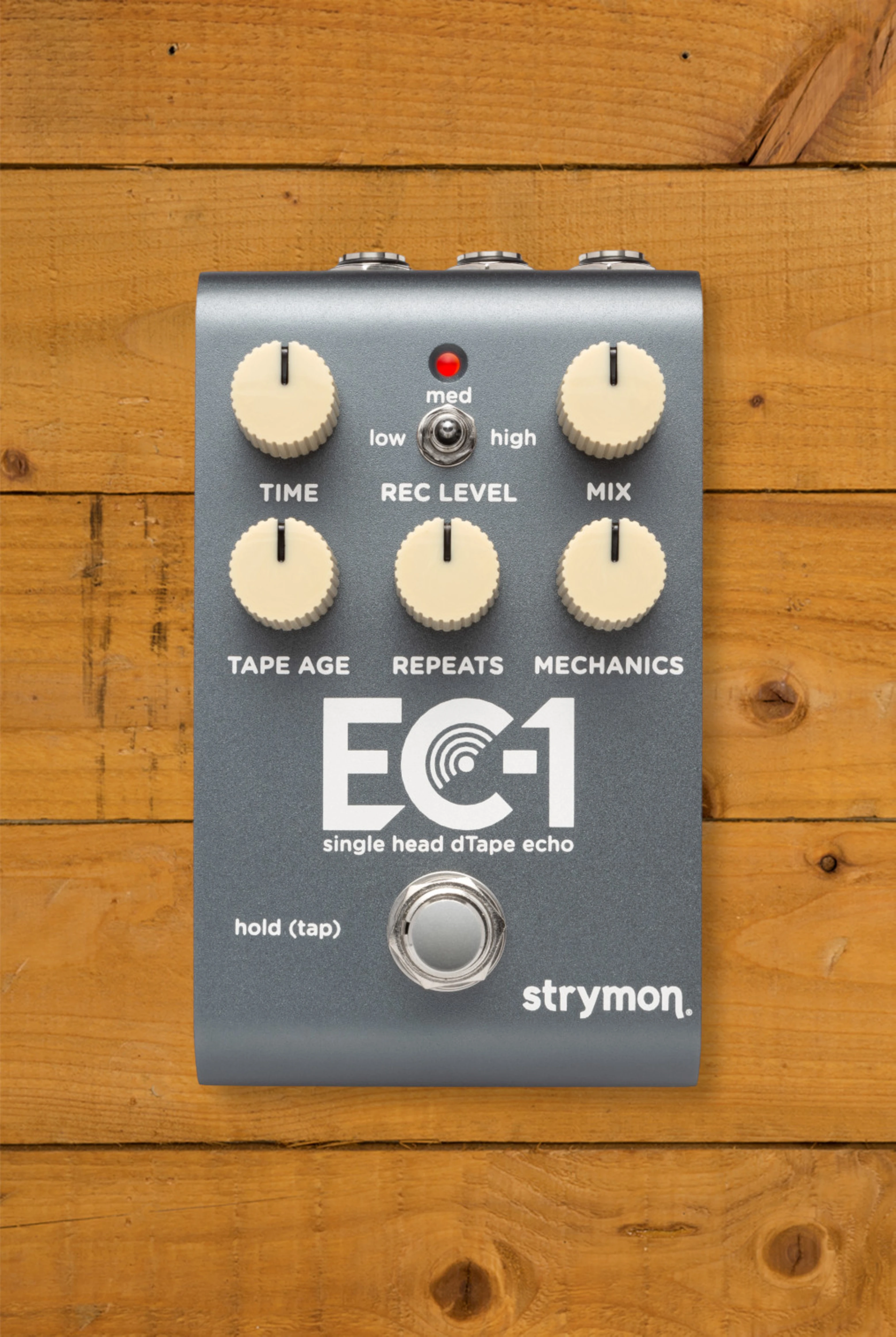 The Strymon EC-1 Single Head dTape Echo pedal offers a detailed recreation of the classic '60s tape echo sound, complete with the rich harmonics of a valve preamp. It captures the subtle mechanical imperfections that contribute to the organic modulation of vintage tape echoes, allowing users to dial in sounds ranging from warm slapback to expansive, feedback-laden echoes with a wide stereo image. The EC-1's design focusses on accurately reproducing the nuances of a meticulously-maintained Echoplex EP-2, including modifications made by technician Cesar Diaz. These modifications, which aimed to combine the best aspects of various Echoplex models, informed the EC-1's development, giving it a unique and nostalgic character.