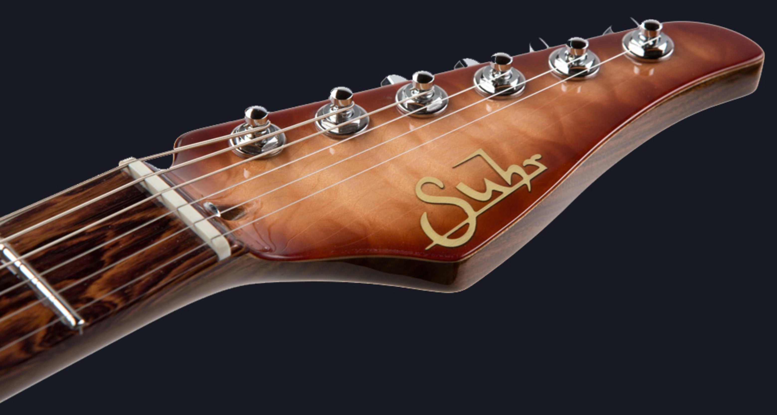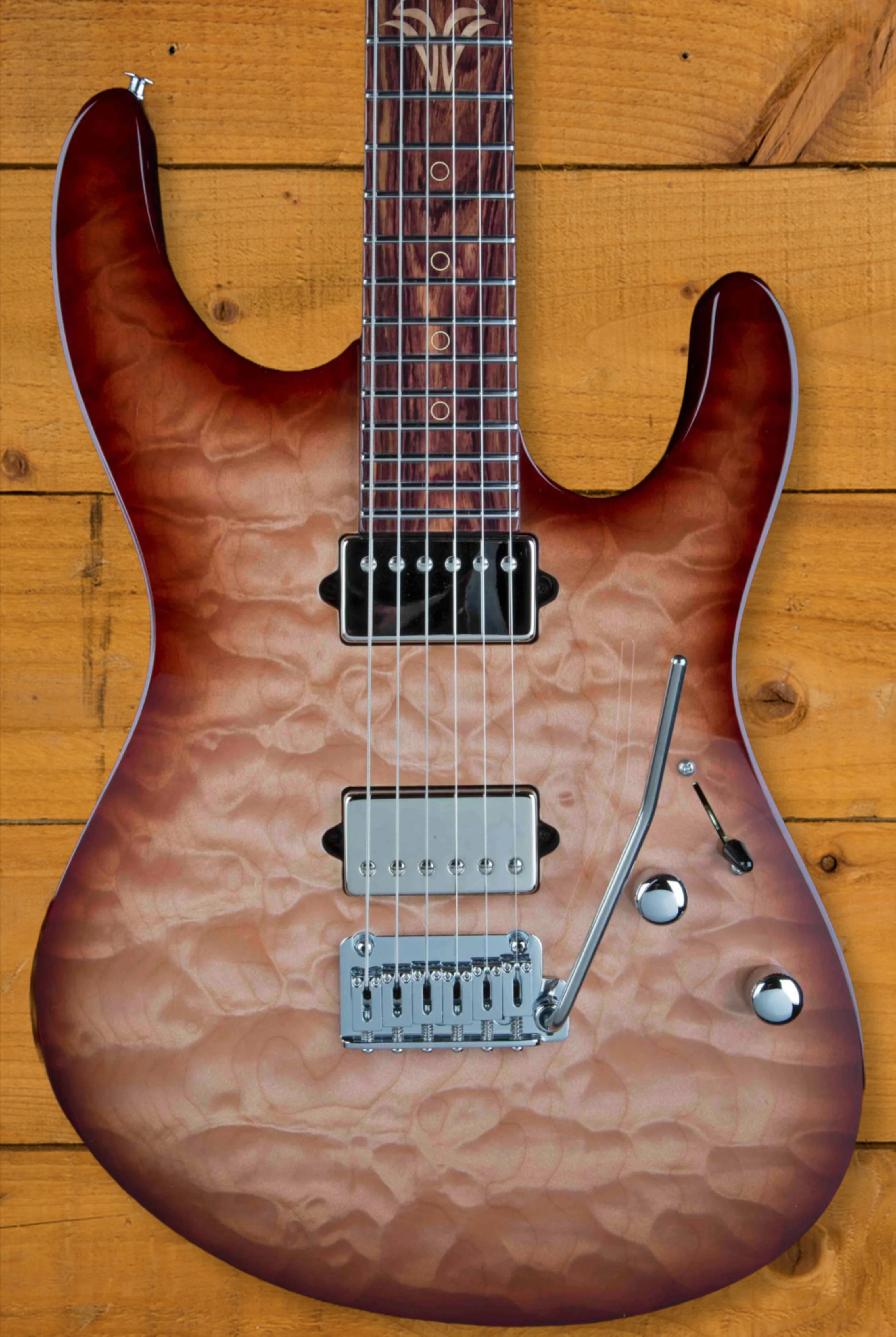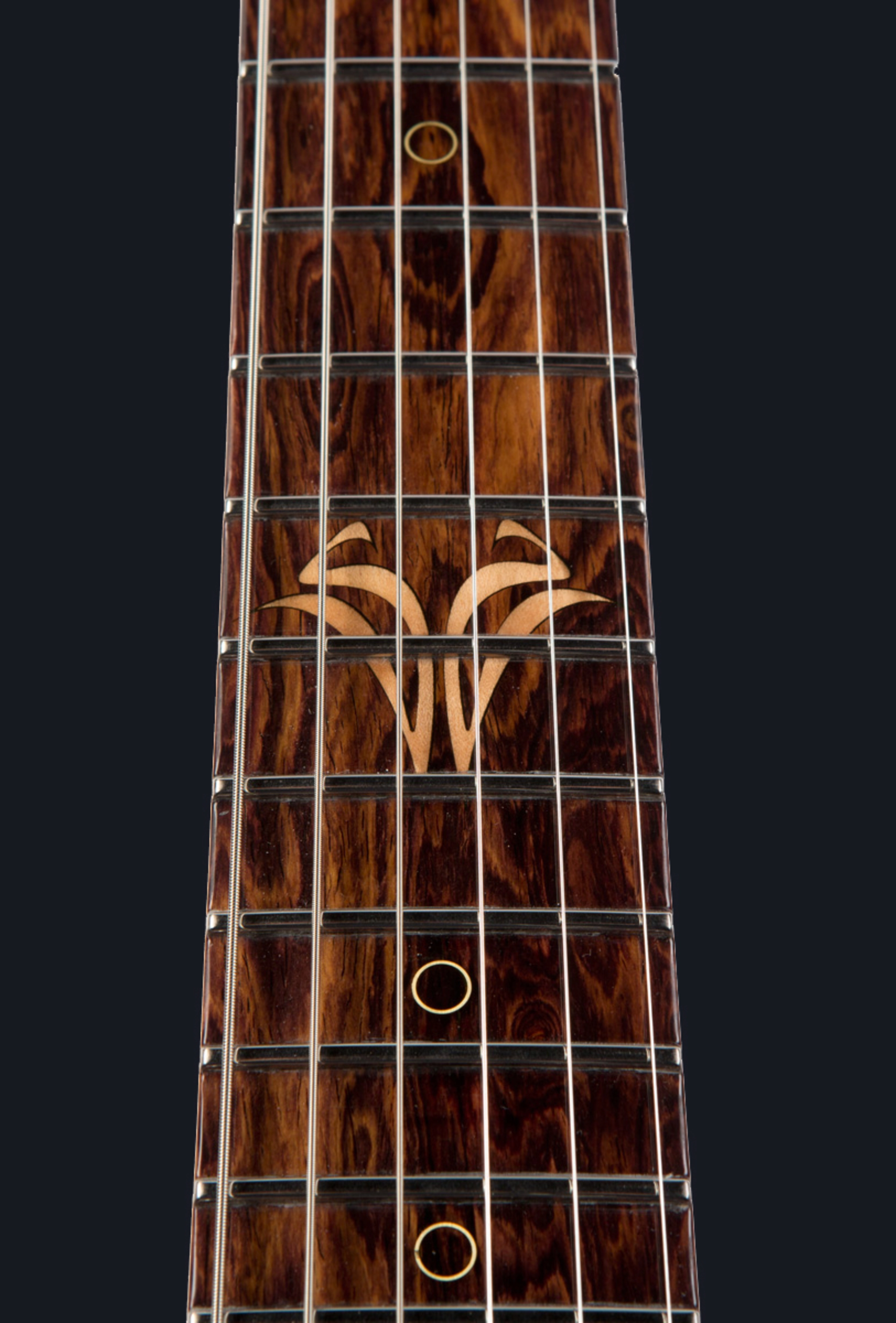 This guitar features a hand-selected one piece Quilt Maple body paired with a Pau Ferro neck and a Mexican Kingwood fingerboard. A Brown Burst finish was selected to set off the incredible figuring of this body wood. The neck is appointed with a Quilt Maple Double S inlay, solid brass side dots, brass ring face dot inlays and solid brass logo.