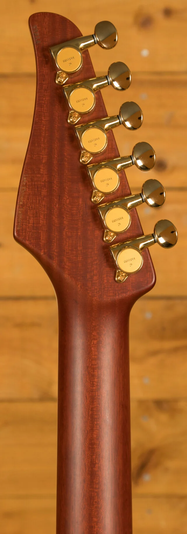 A Genuine Mahogany neck topped with Indian Rosewood fingerboard delivers the ultimate playing platform, it is safe and secure offering the highest quality imaginable. It boasts 22 Medium Nickel frets, a 10"-14" Radius, Ivoroid neck binding and Abalone Inlays. Thanks to the Even "C" profile you can move around freely, nailing those classic Knopfler licks.