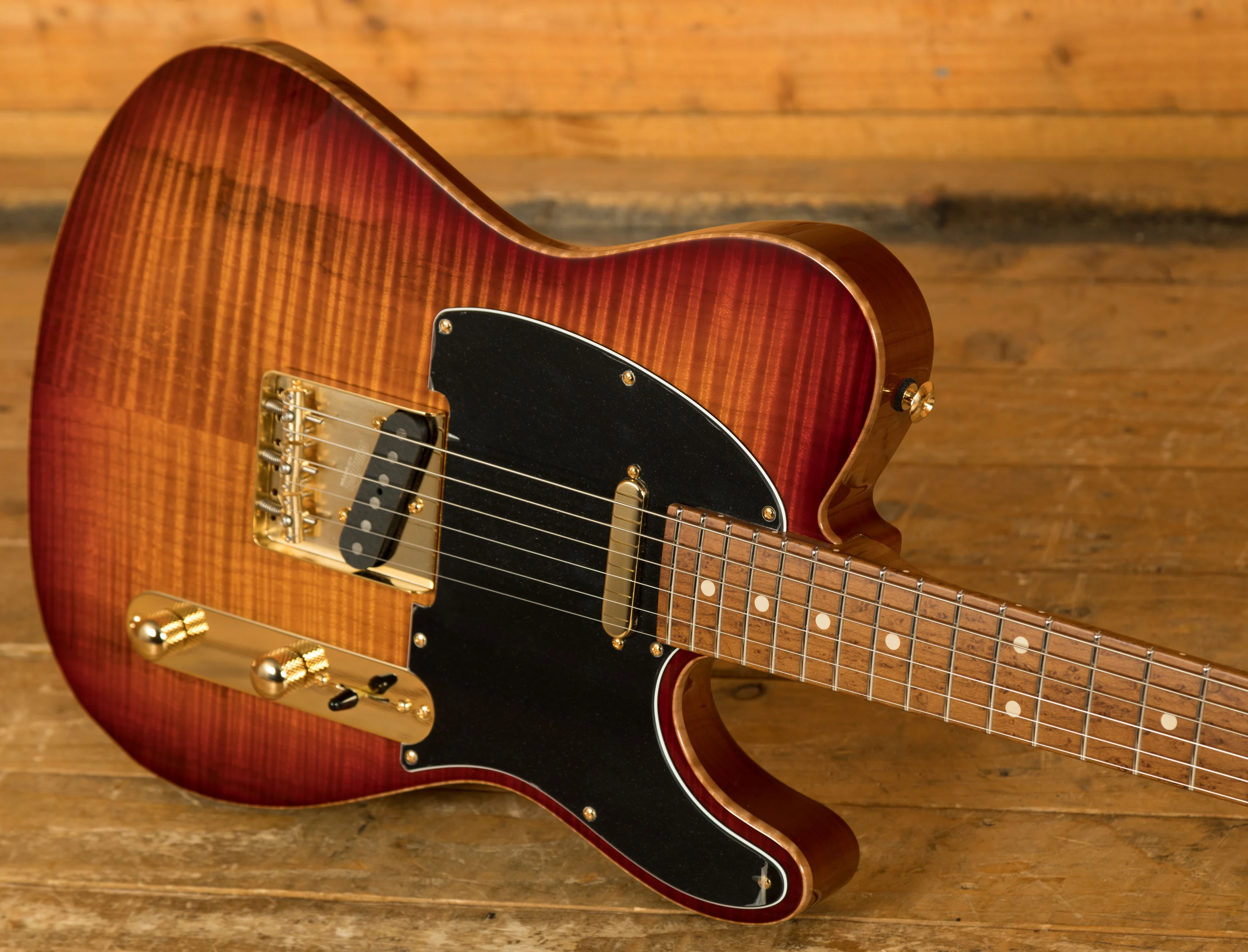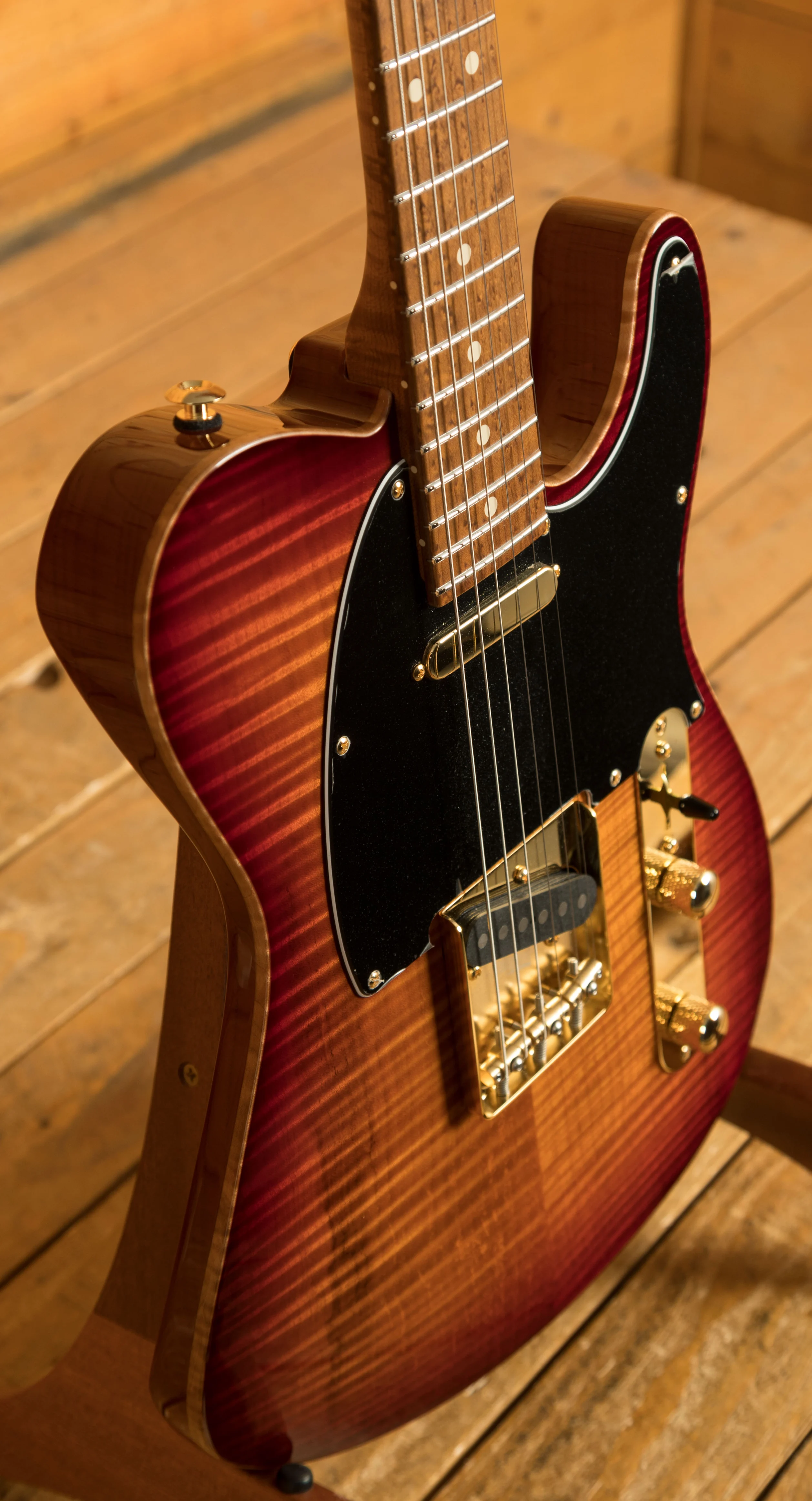 These guitars feature all the vintage elements we all love but back it up with super stable and reliable modern-day benefits. The chambered Swamp Ash Tele body is topped with a handpicked Flame Maple top and finished in an Aged Cherry Burst with scraped binding. The 5A Roasted Birdseye Maple neck has a satin finish for a smooth, slick feel. With a 60's C Vintage Standard (.810"-.930") profile, 22 Heavy stainless steel frets and a compound 9''-12'' radius, this is a substantial but real comfortable guitar.
