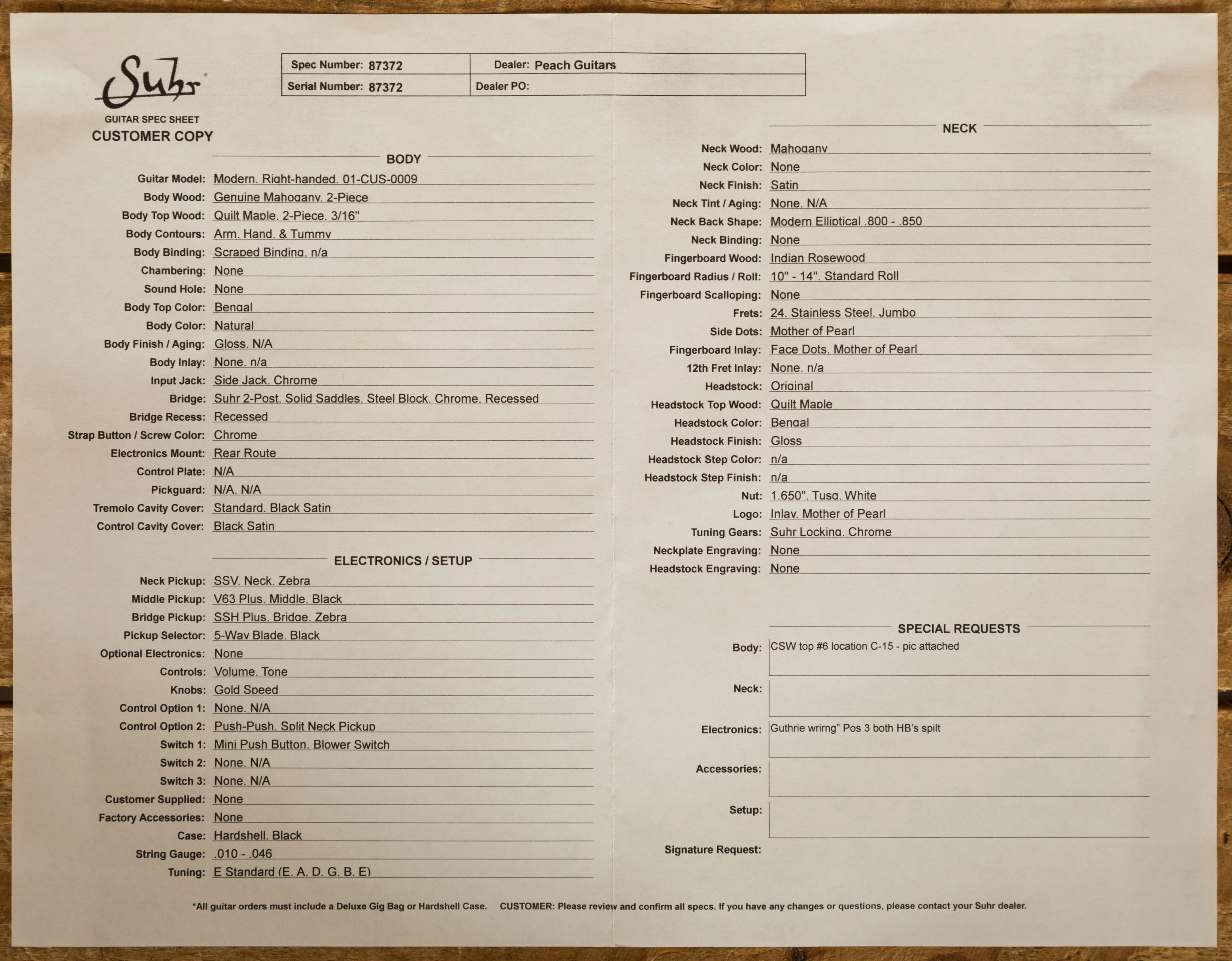 This Suhr Custom Modern is a premium electric guitar designed to deliver exceptional performance, versatility, and precision. Based on the specifications of Guthrie Govan's renowned Suhr Modern, this model offers professional-grade build quality and tonal flexibility suited to demanding players. Every element of this instrument has been engineered for stability, comfort, and responsiveness, making it ideal for both studio and live performance environments.