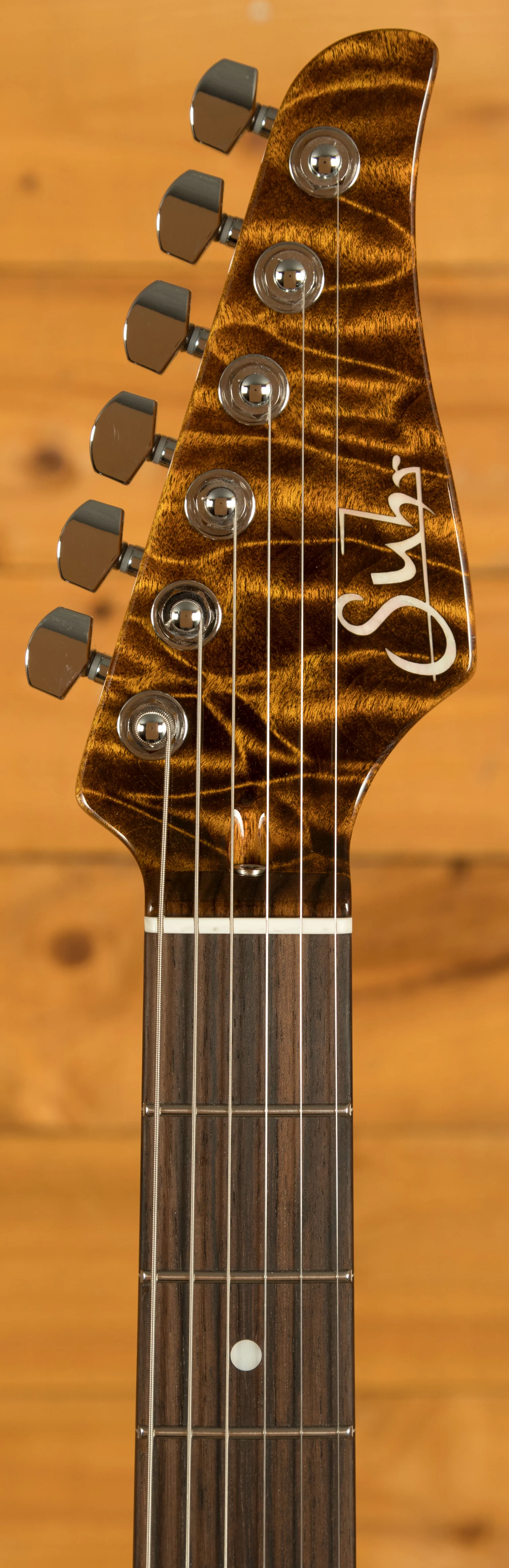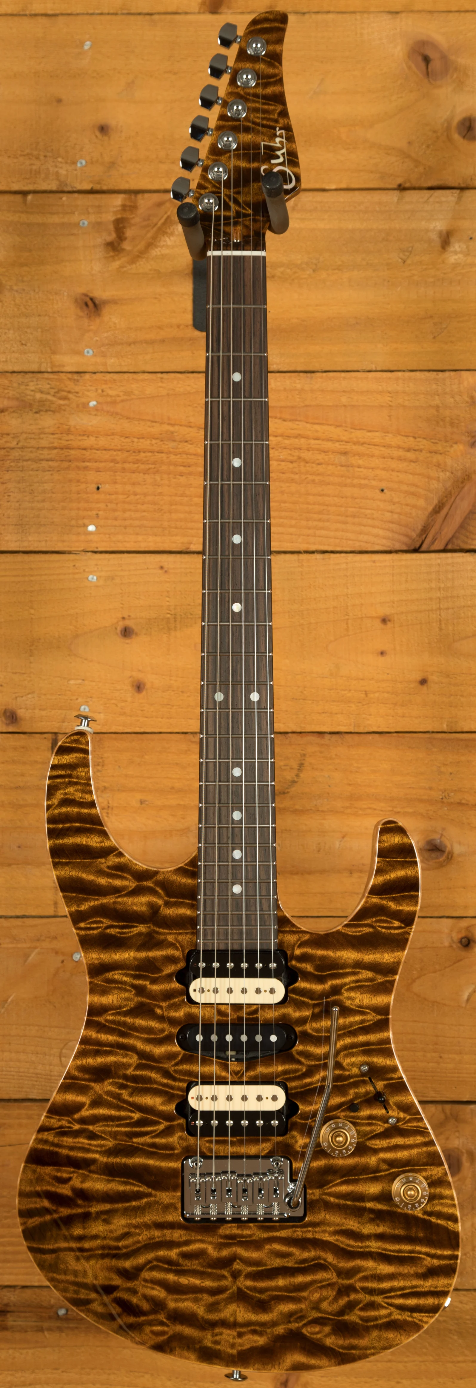 Equipped with a versatile V63 Plus single coil and SSV and SSH Plus humbuckers, the Suhr Custom Modern offers a wide tonal range that covers everything from articulate cleans to powerful high-gain tones. The push-pull tone control enables coil-splitting for the neck, while a dedicated switch instantly engages the bridge humbucker at full output for quick tonal changes. The 5-way selector is custom-wired to offer practical combinations, including dual split-humbuckers in position 3 for greater versatility. A recessed 2-post Suhr tremolo with solid saddles and a steel block, Suhr locking tuners, and a Tusq nut provide outstanding tuning stability and precise intonation, allowing players to perform with complete confidence and control.