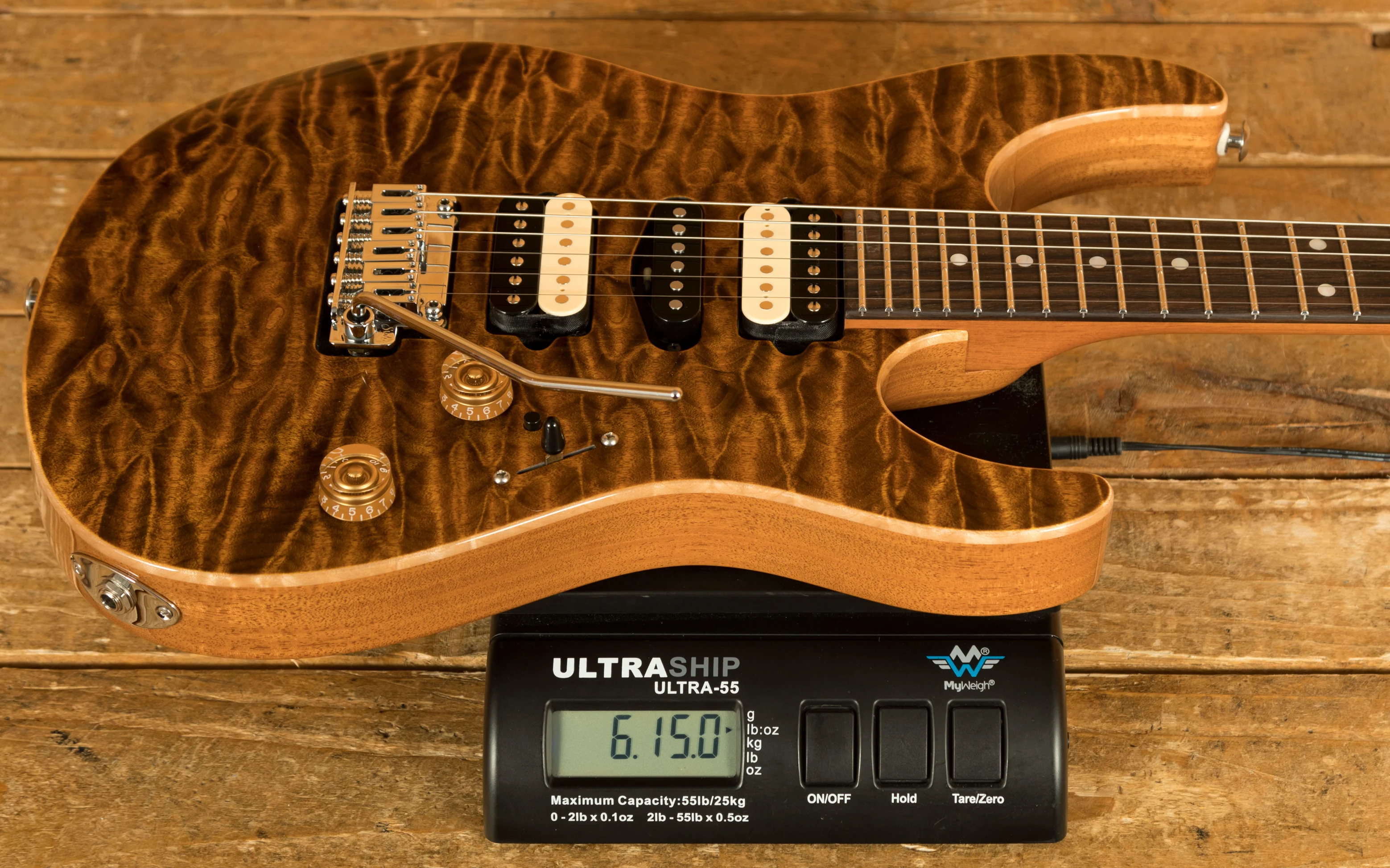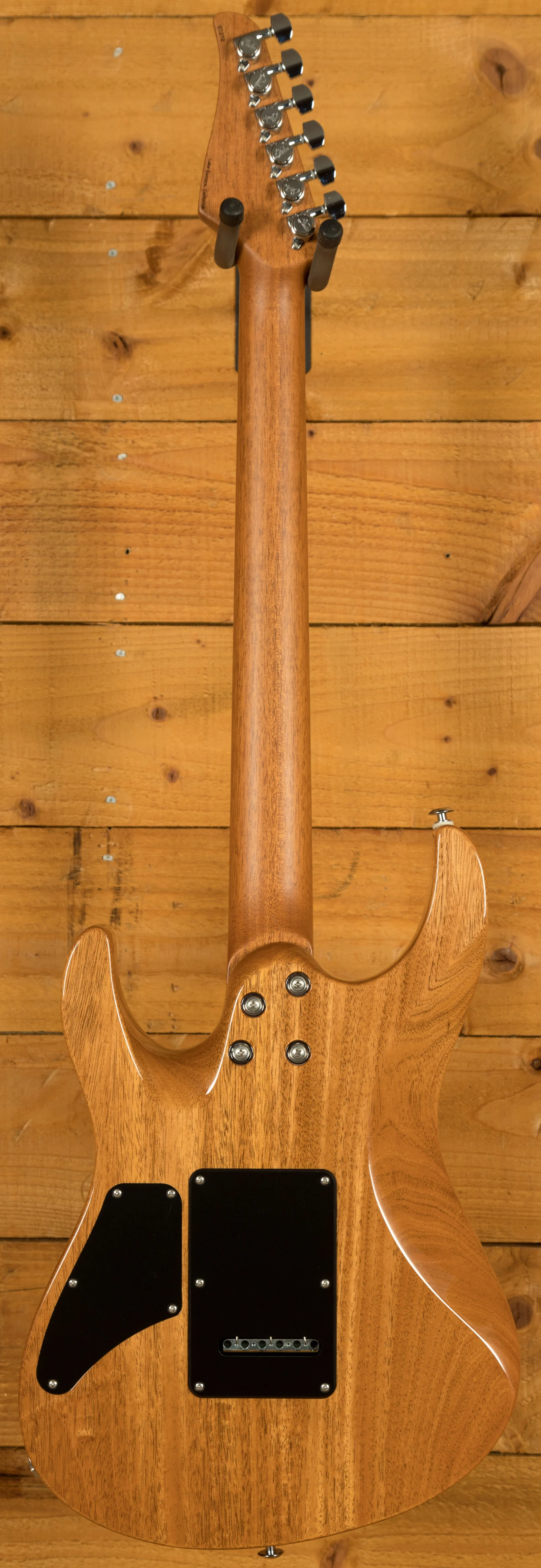 The guitar features a Mahogany body with a stunning Quilt Maple top, providing a strong balance of warmth, clarity, and sustain. Its satin-finished Mahogany neck and Indian Rosewood fingerboard deliver a smooth playing feel, while 24 stainless steel jumbo frets and a 10"-14" compound radius ensure effortless bending and consistent playability across the entire neck. The modern elliptical .800"-.850" neck profile offers ergonomic comfort for extended playing sessions, and refined details such as Mother of Pearl inlays. The solid Bengal finish is a real highlight of this guitar, it does a brilliant job at highlighting the natural figuring of the maple.