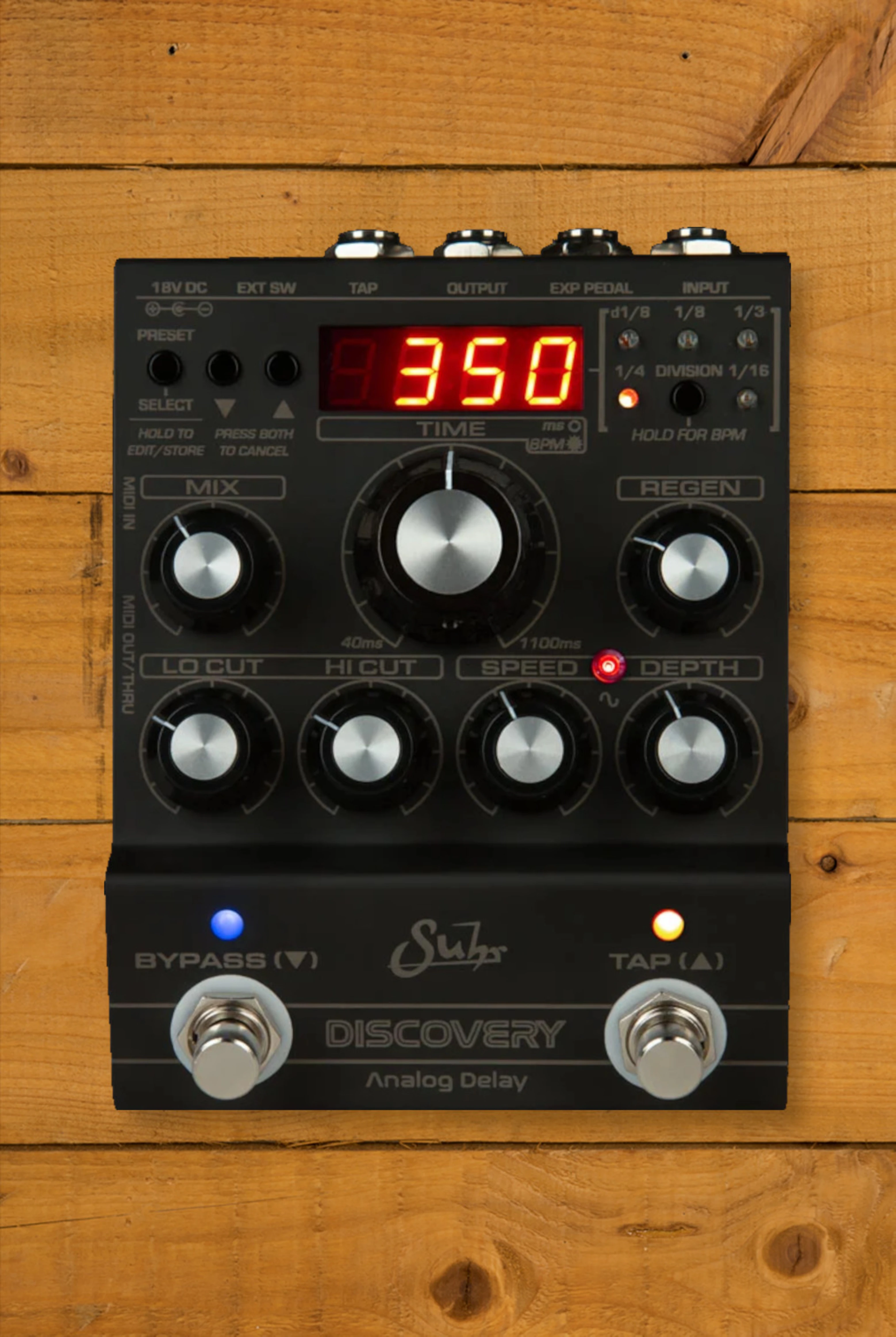 The Discovery Analogue Delay is fully equipped with MIDI capabilities, making it compatible with complex live setups and studio environments. It features 5-pin MIDI in and out/thru, allowing it to send Program Changes to other MIDI-compatible pedals. Whether using a MIDI controller or a DAW, the Discovery integrates seamlessly into any rig.