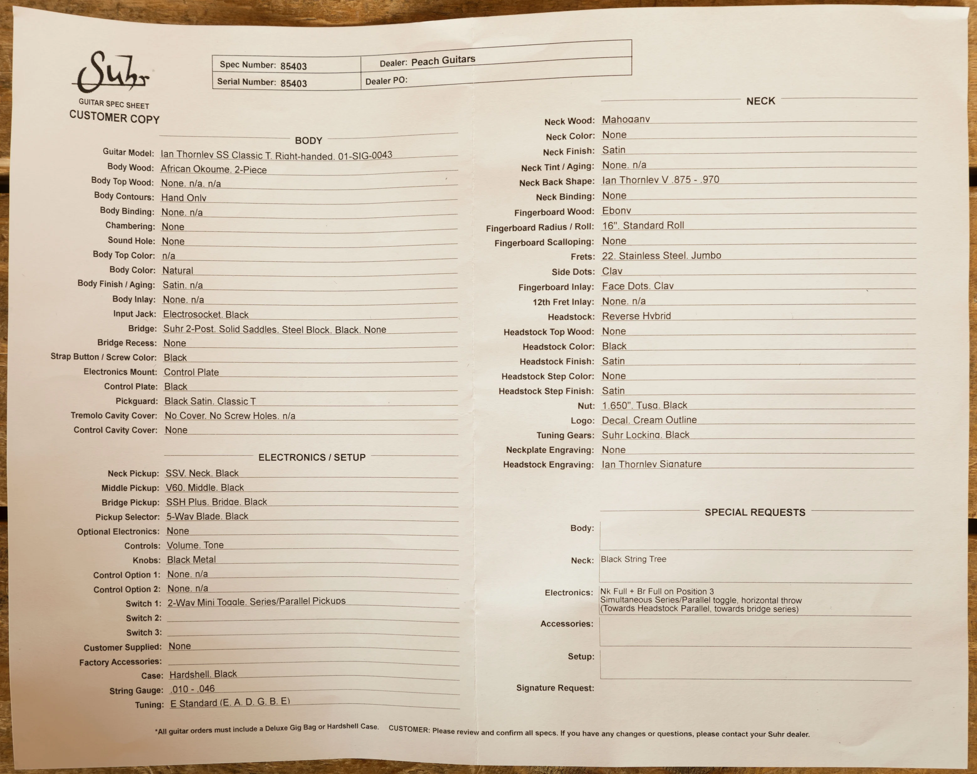Each Suhr Ian Thornley Signature Classic T comes with a Travel Pro premium softshell case, offering lightweight protection for transport and storage. This model represents a top-tier choice for players seeking tonal versatility, superior playability, and professional-grade craftsmanship.