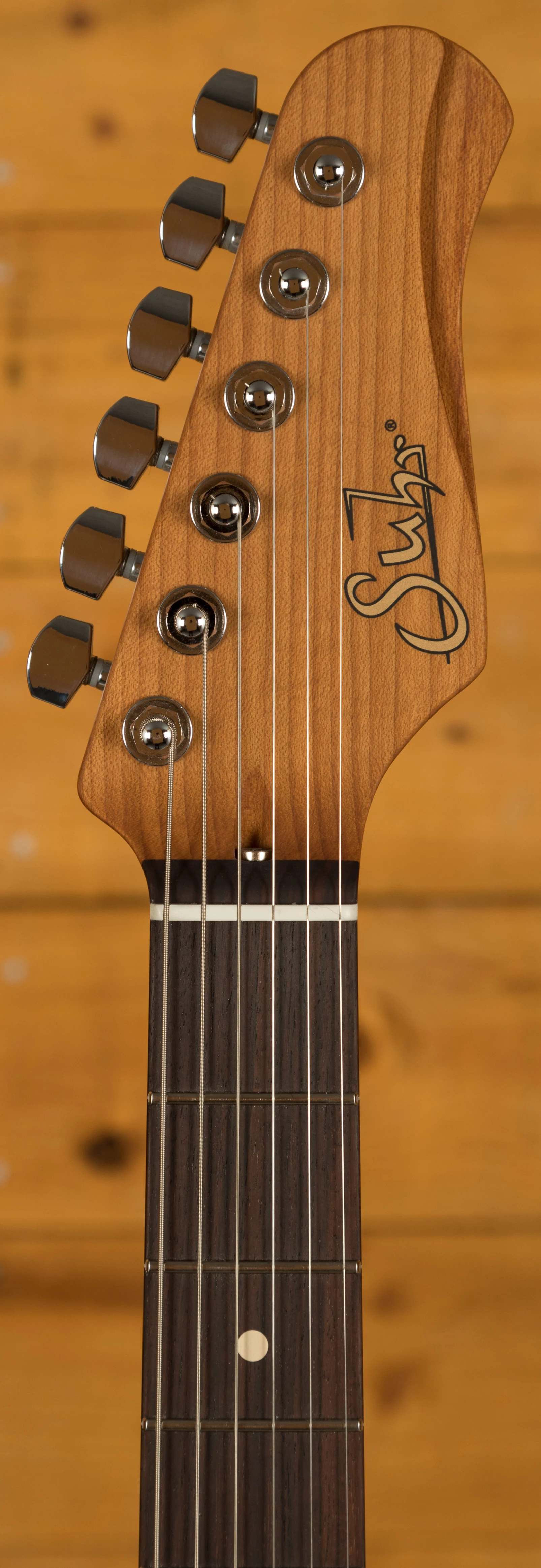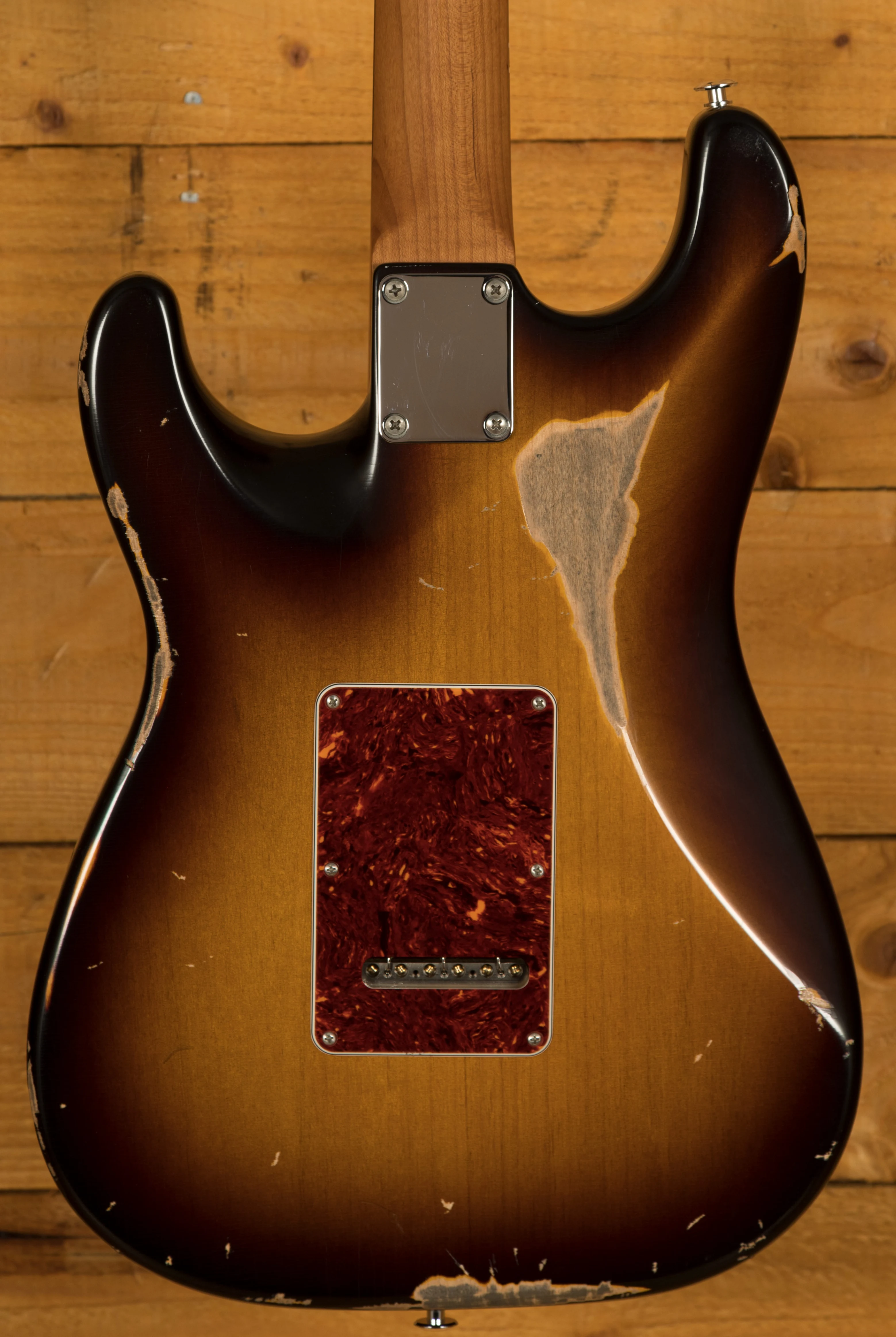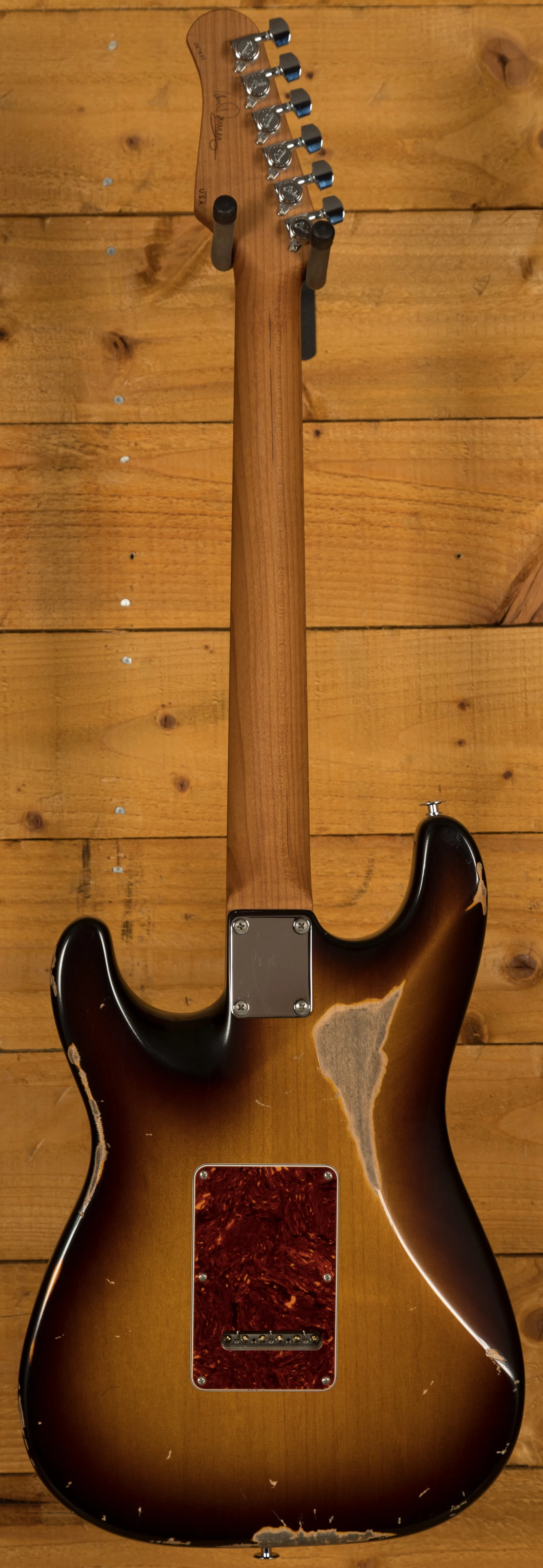 These guitars feature all the vintage elements we love but back it up with super stable and reliable modern-day benefits. The Alder Strat body is finished in a thin lacquer and then subject to Suhr's own antiquing process, The extra heavy relic job done on this 2-tone tobacco burst looks great, it really adds to the character of the guitar. The ultra-thin nitro will wear naturally to allow each guitar to develop its own roadworn look.