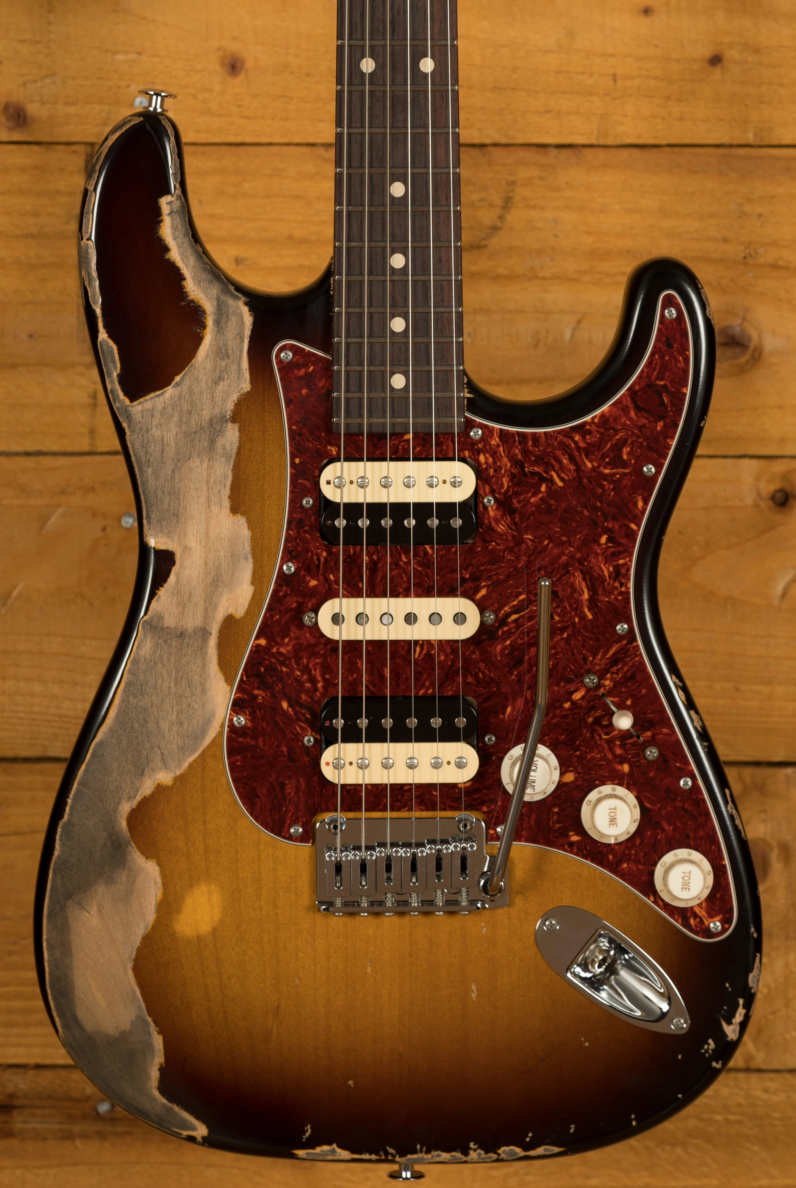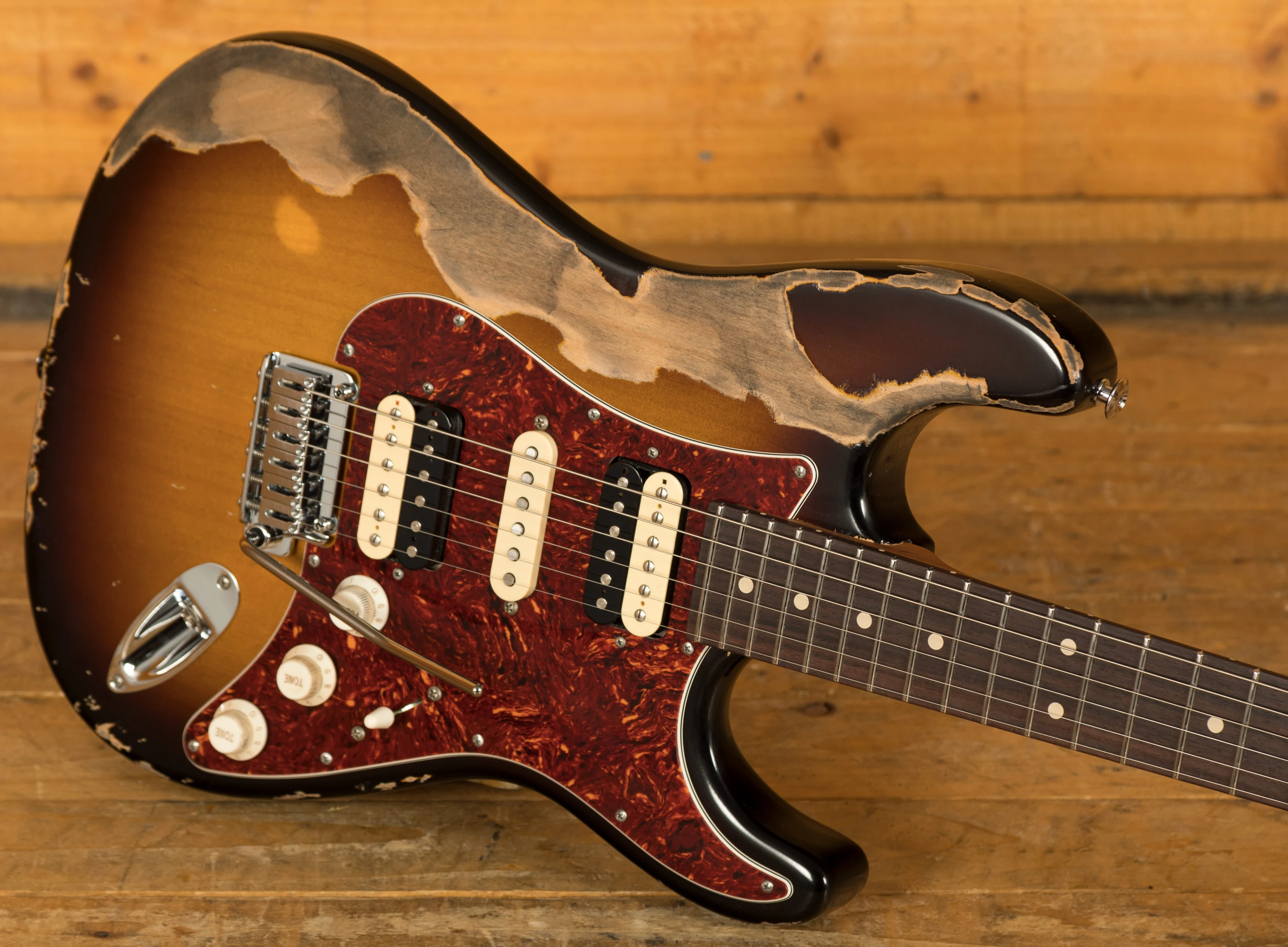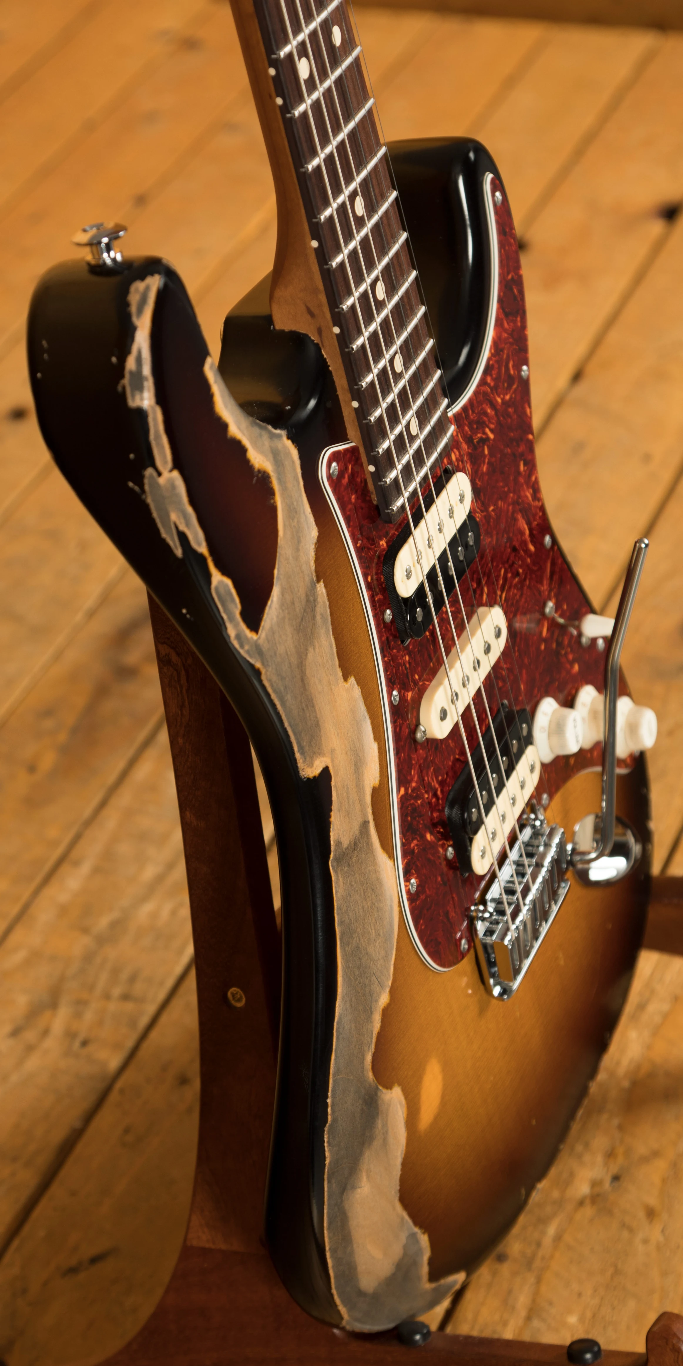 These guitars feature all the vintage elements we love but back it up with super stable and reliable modern-day benefits. The Alder Strat body is finished in a thin lacquer and then subject to Suhr's own antiquing process, The extra heavy relic job done on this 2-tone tobacco burst looks great, it really adds to the character of the guitar. The ultra-thin nitro will wear naturally to allow each guitar to develop its own roadworn look.