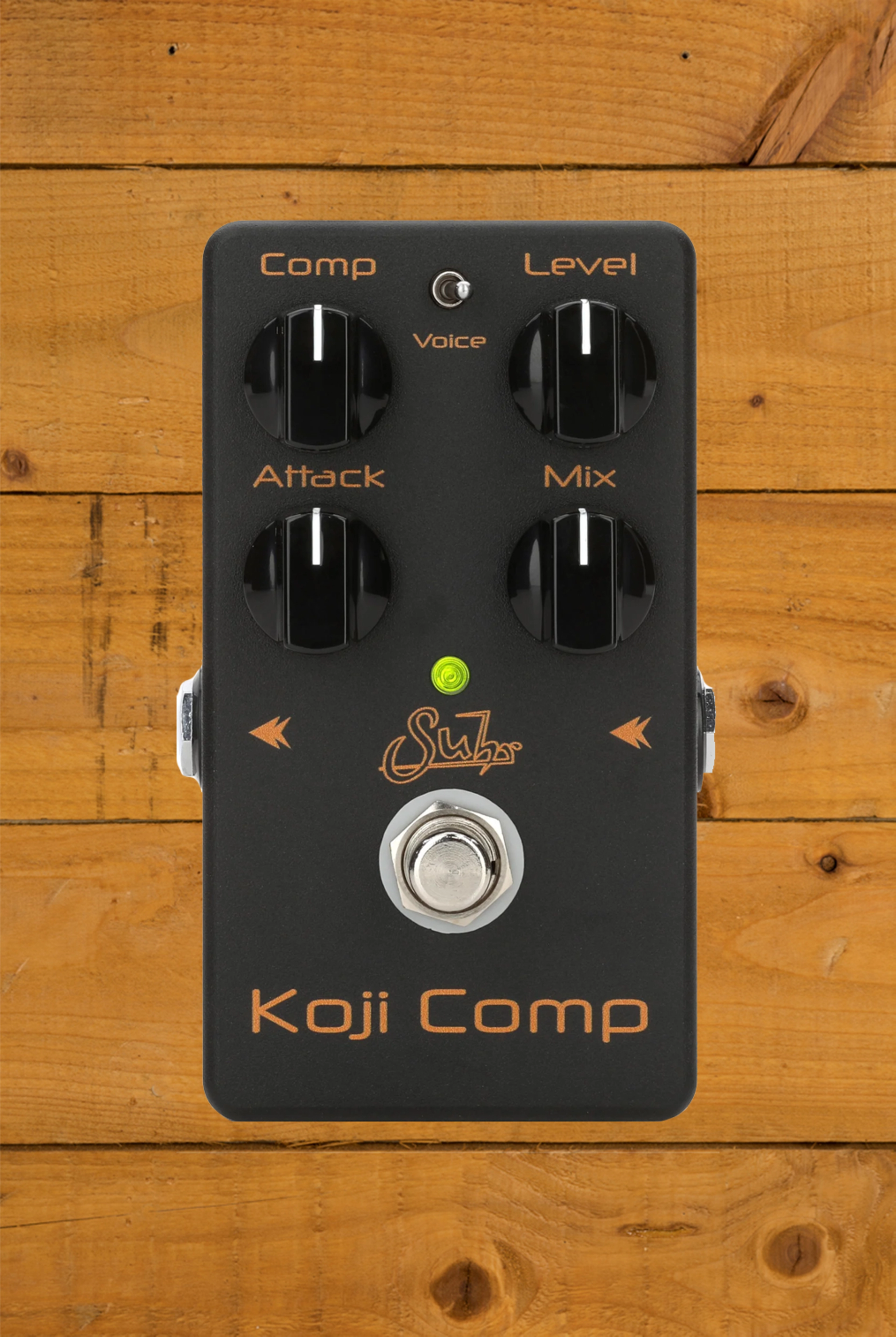 The Koji Comp features several controls for precise sound shaping. The COMP control adjusts the amount of compression applied to your signal path, providing full control over gain reduction. The LEVEL knob allows you to set the overall output volume, compensating for any changes caused by compression. The ATTACK control determines how quickly the compressor reacts to your signal, allowing you to fine-tune the response based on your playing style.