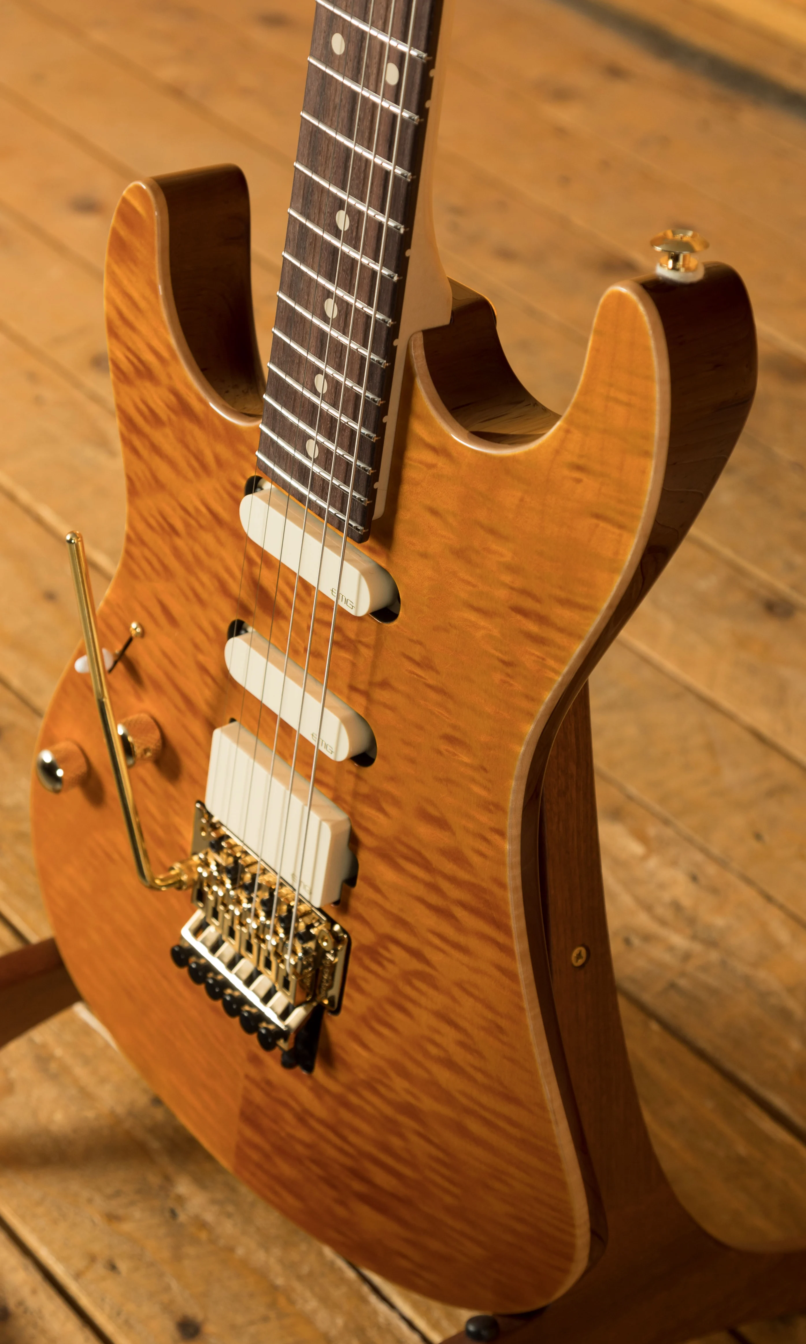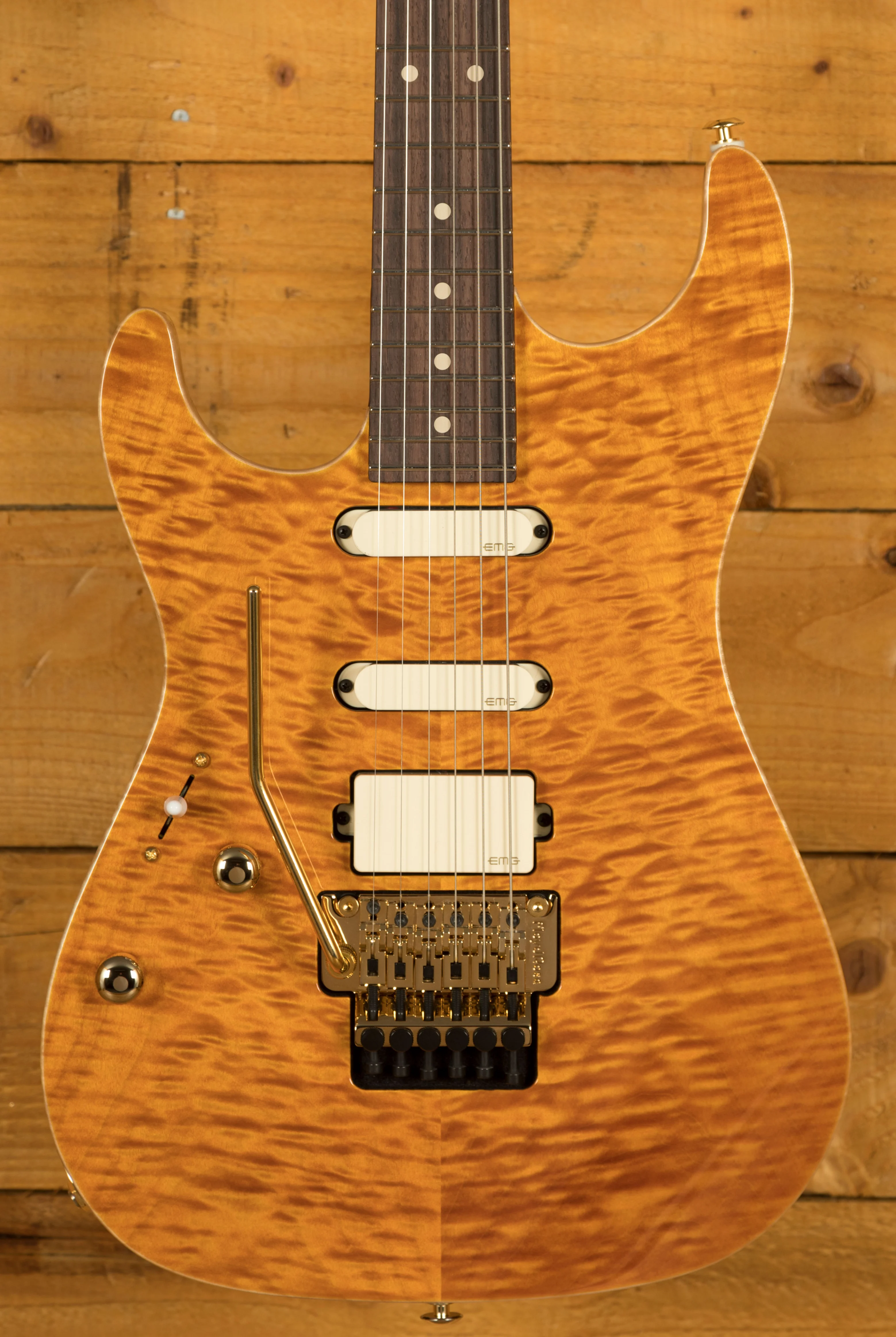 With the powerhouse pickup HSS combo, this guitar delivers monster tonal options. With a pair of EMG SA single coils and an EMG 85 humbucker this guitar is really versatile. Tuning stability comes from a cracking Floyd Rose tremolo, it offers improved performance and reliability.