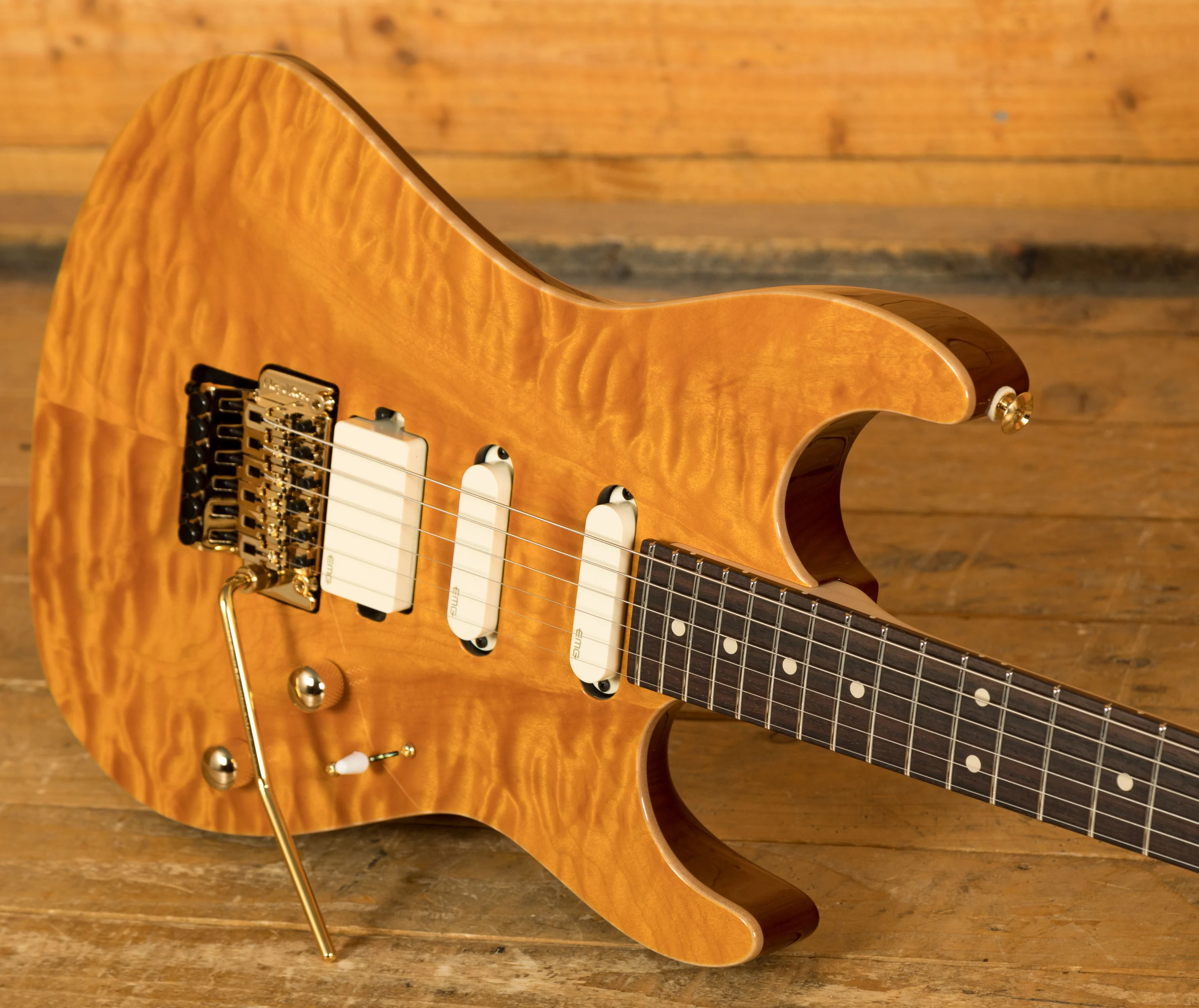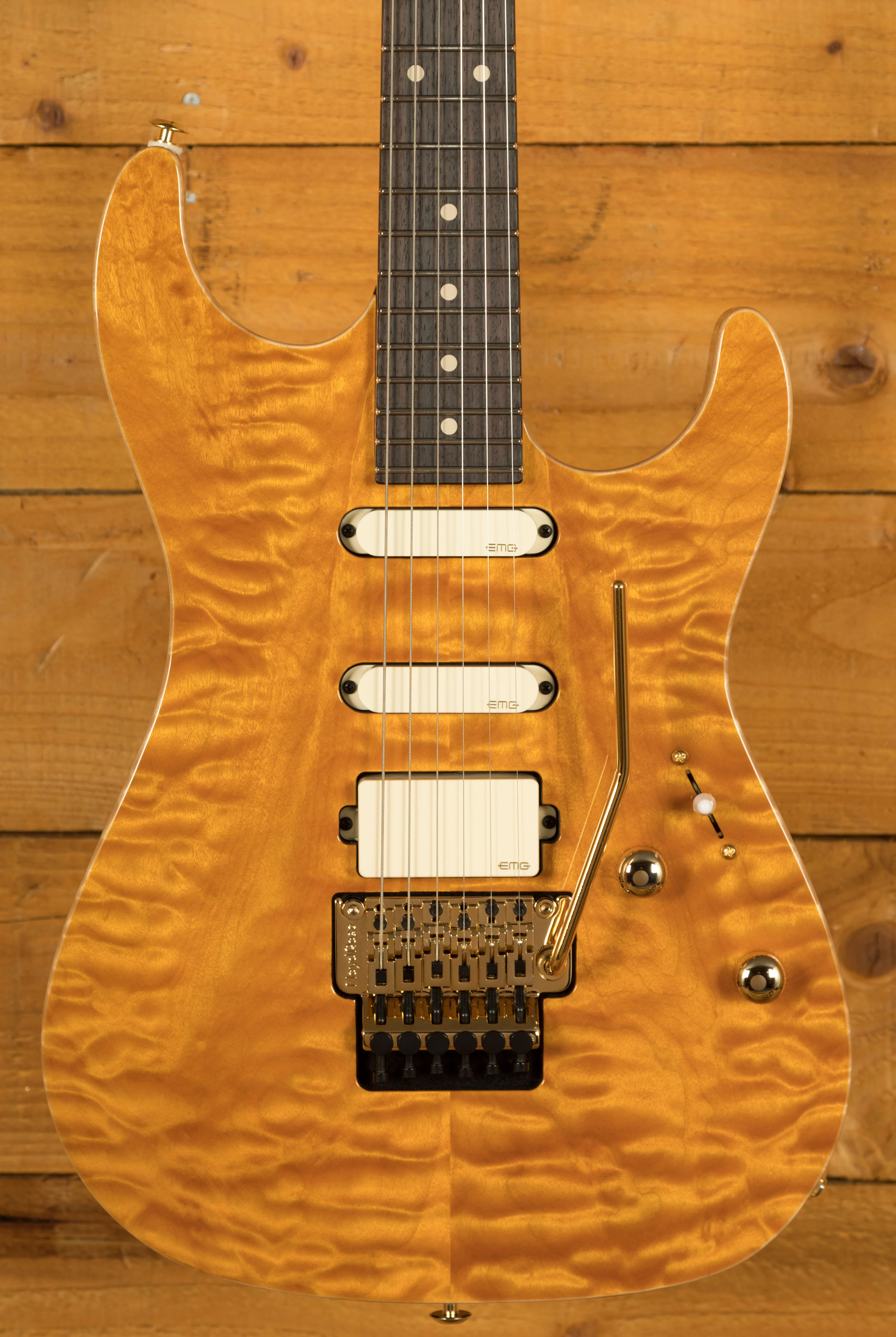 With the powerhouse pickup HSS combo, this guitar delivers monster tonal options. With a pair of EMG SA single coils and an EMG 85 humbucker this guitar is really versatile. Tuning stability comes from a cracking Floyd Rose tremolo, it offers improved performance and reliability.