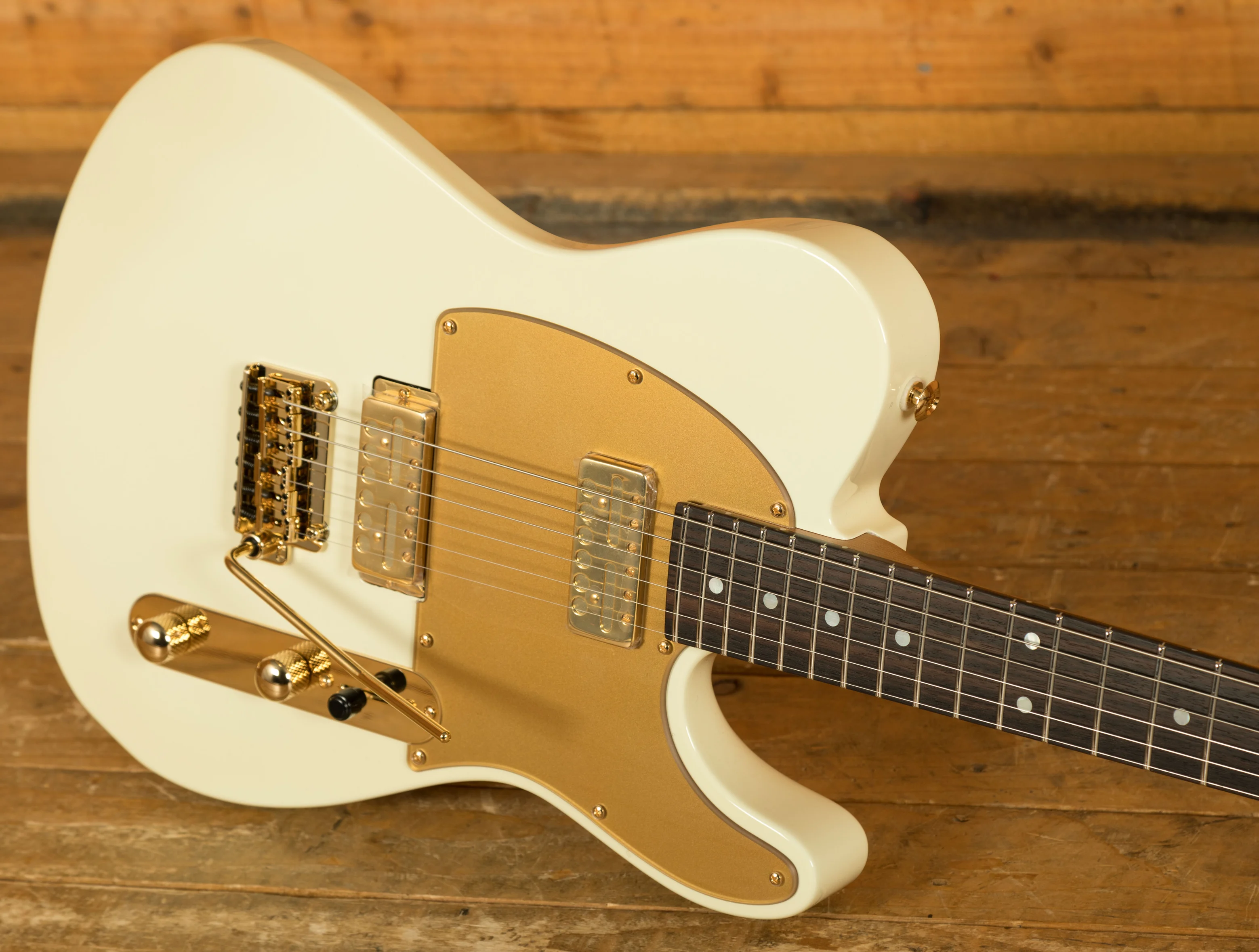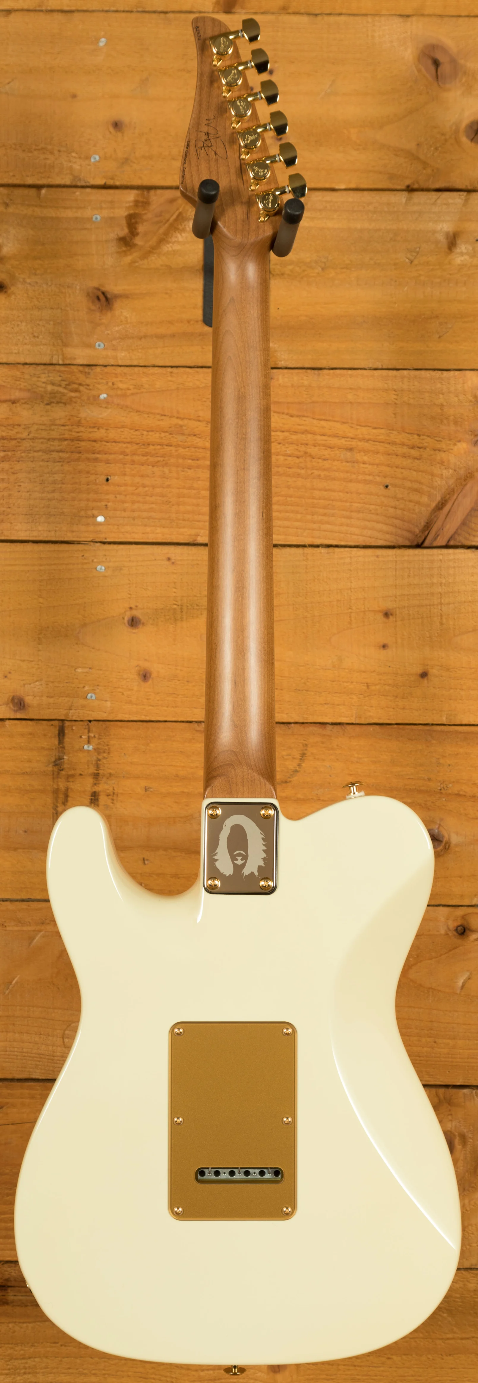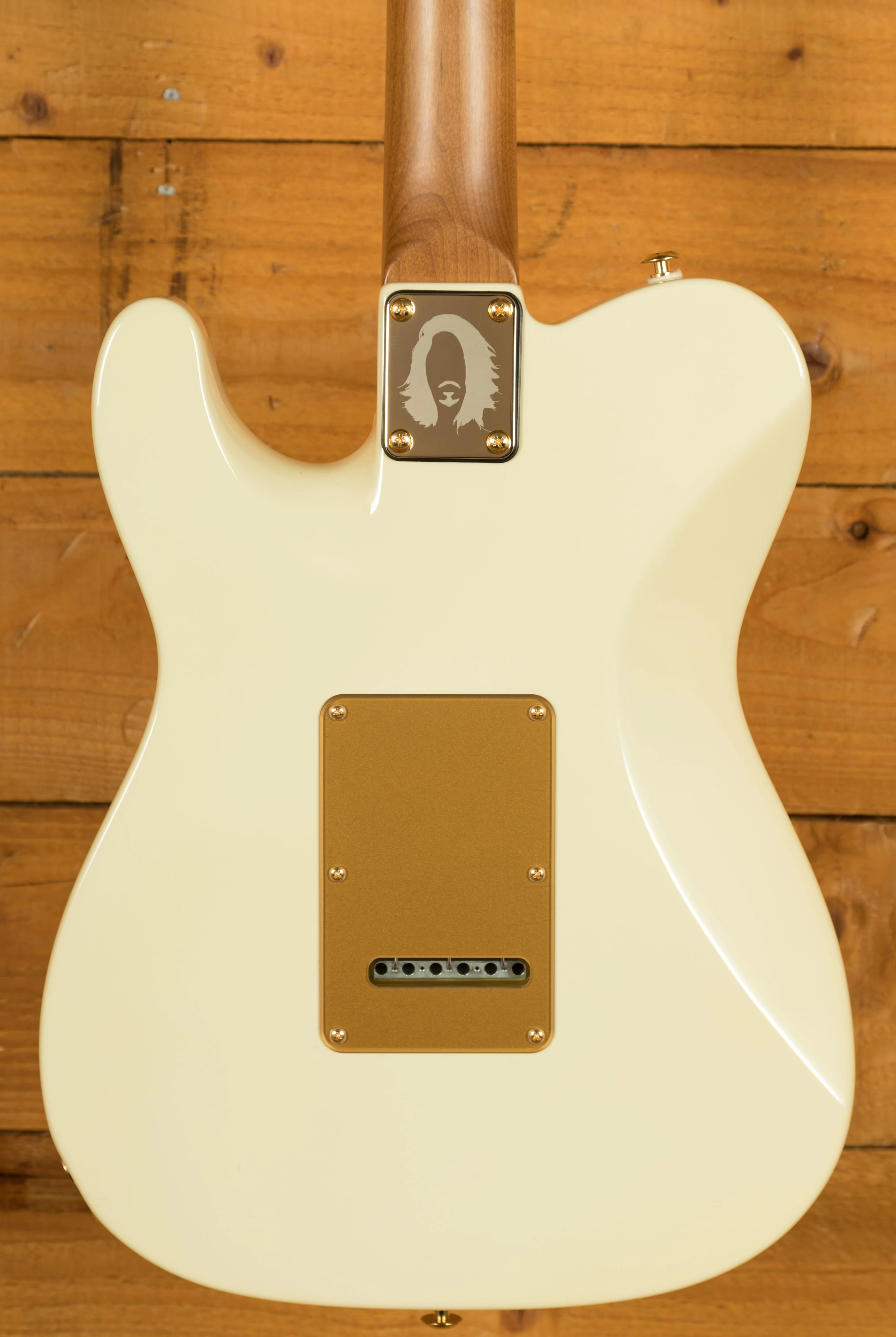 - Body: Alder with custom 'M.A.' White gloss finish, matte gold pickguard, and gold control plate