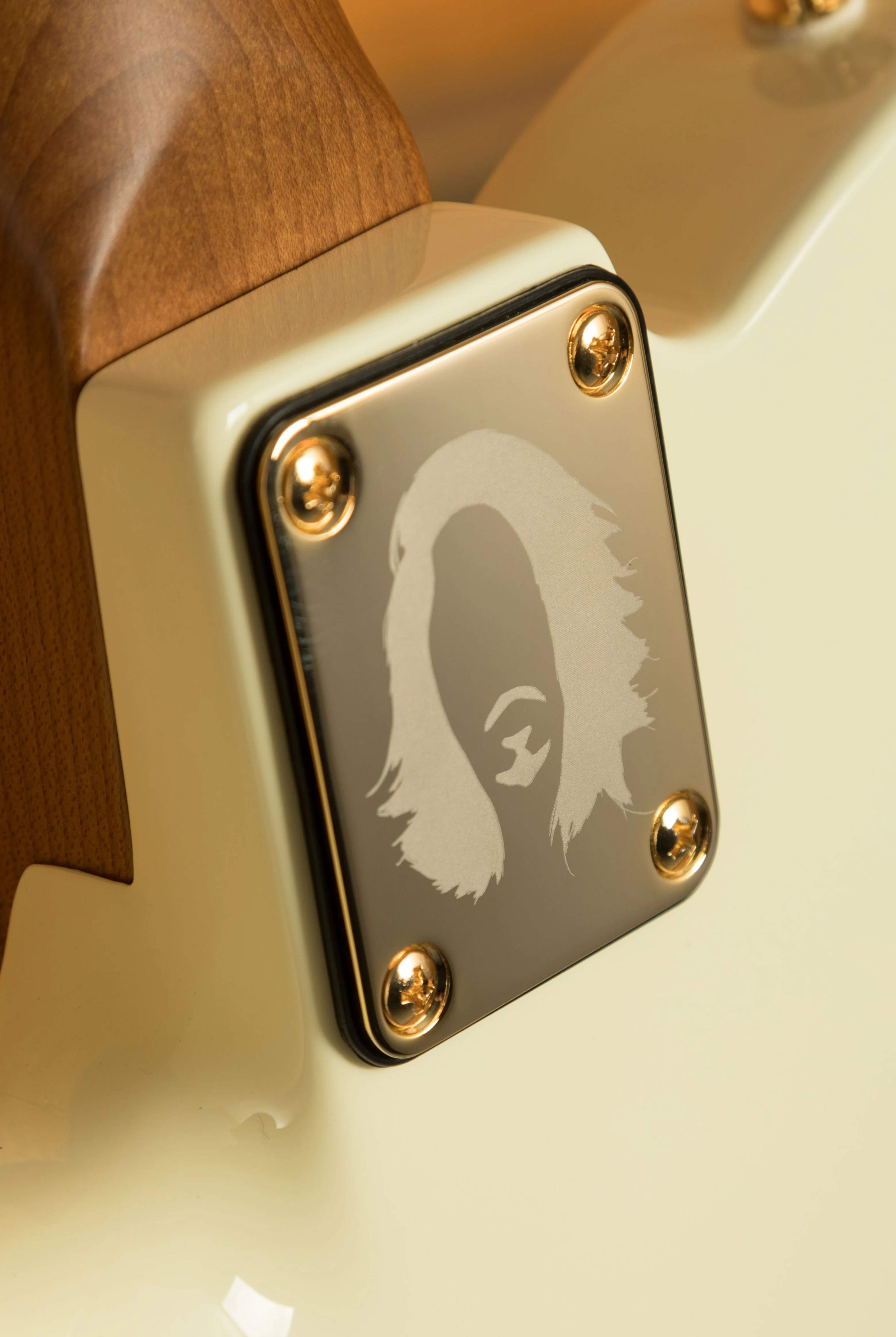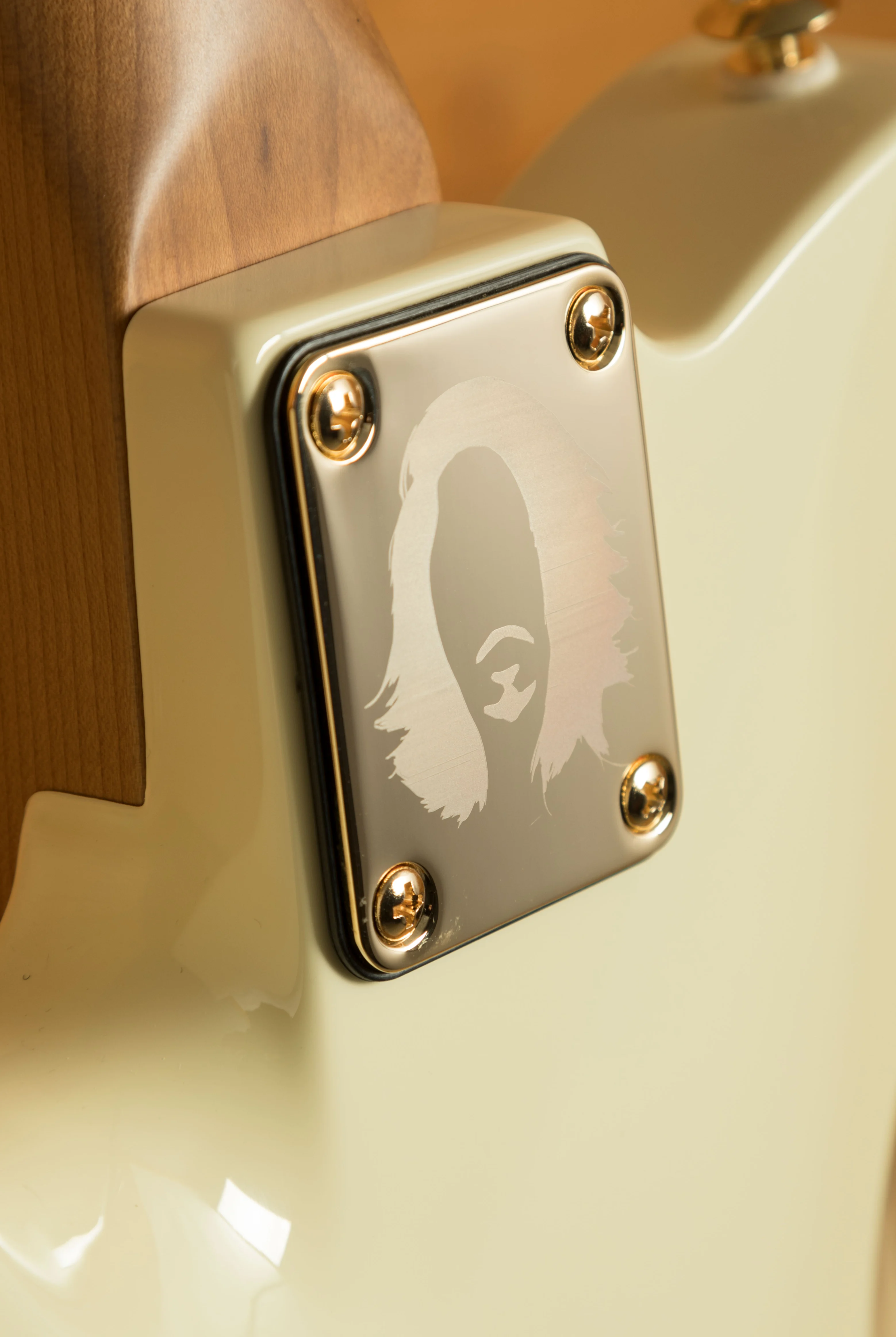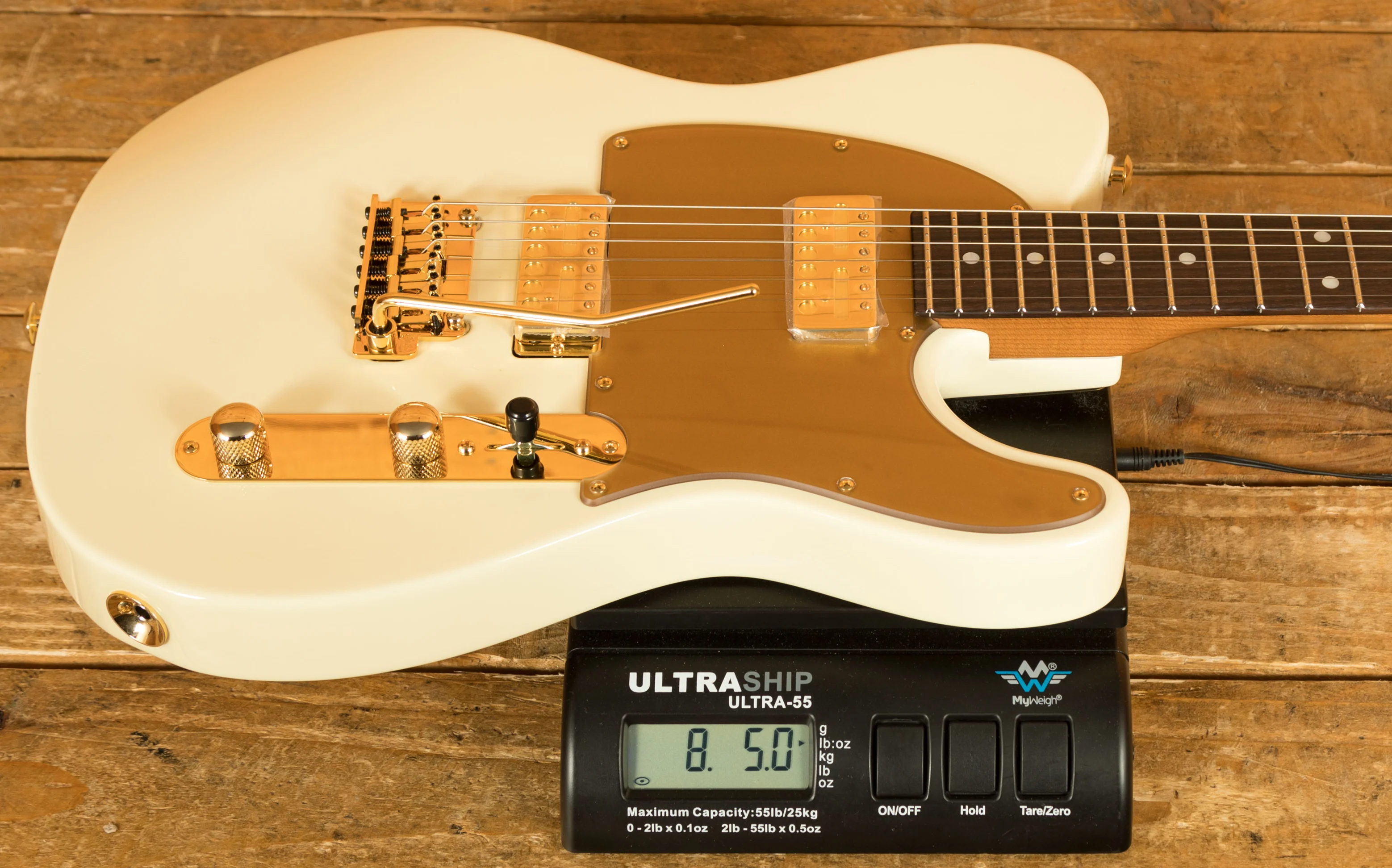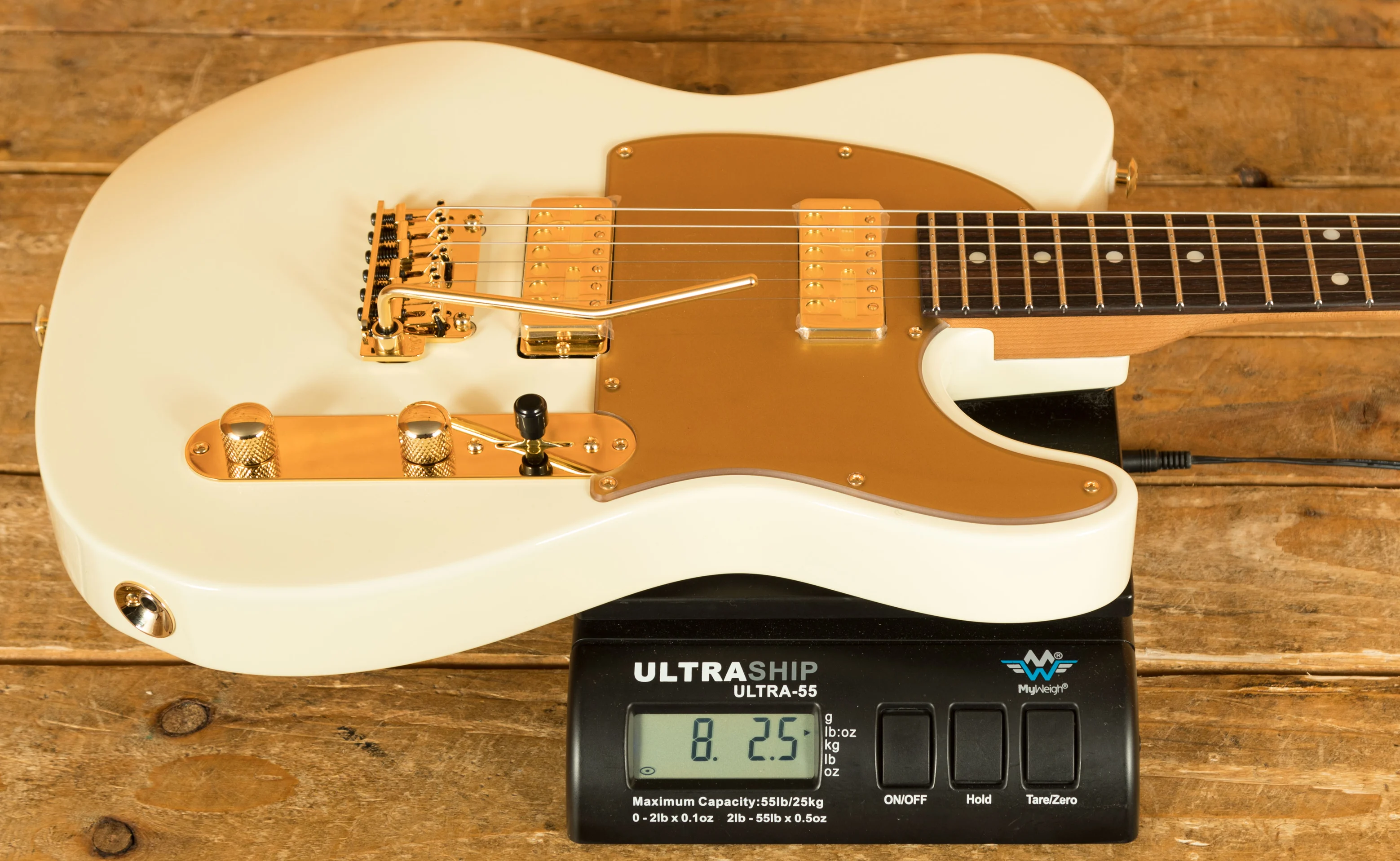 - Body: Alder with custom 'M.A.' White gloss finish, matte gold pickguard, and gold control plate